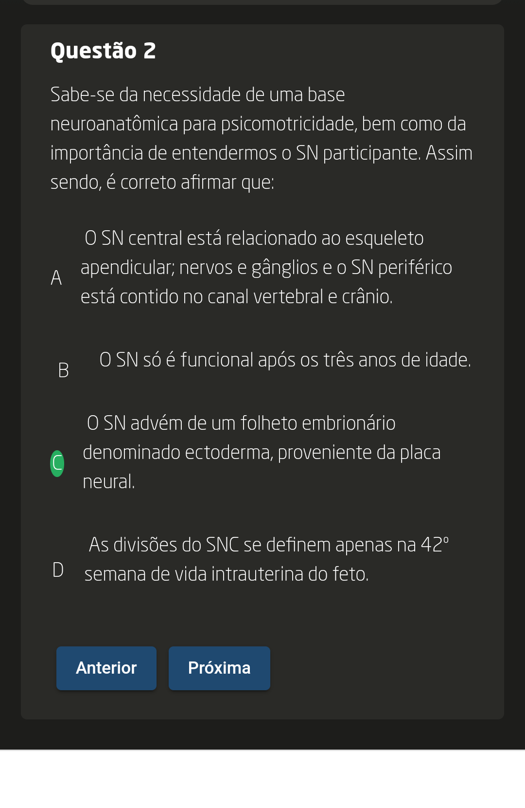 Questão 2 Sabe-se da necessidade de uma base neuroanatômica para psicomotricidade, bem como da importância de entendermos SN participante. Assim sendo, é correto afirmar que: O SN central está relacionado ao esqueleto A apendicular; nervos e gânglios e O SN periférico está contido no canal vertebral e O SN só é funcional após três anos de idade. O SN advém de um folheto embrionário denominado ectoderma, proveniente da placa neural. As divisões do SNC se definem apenas na 42° D semana de vida intrauterina do feto. Anterior Próxima