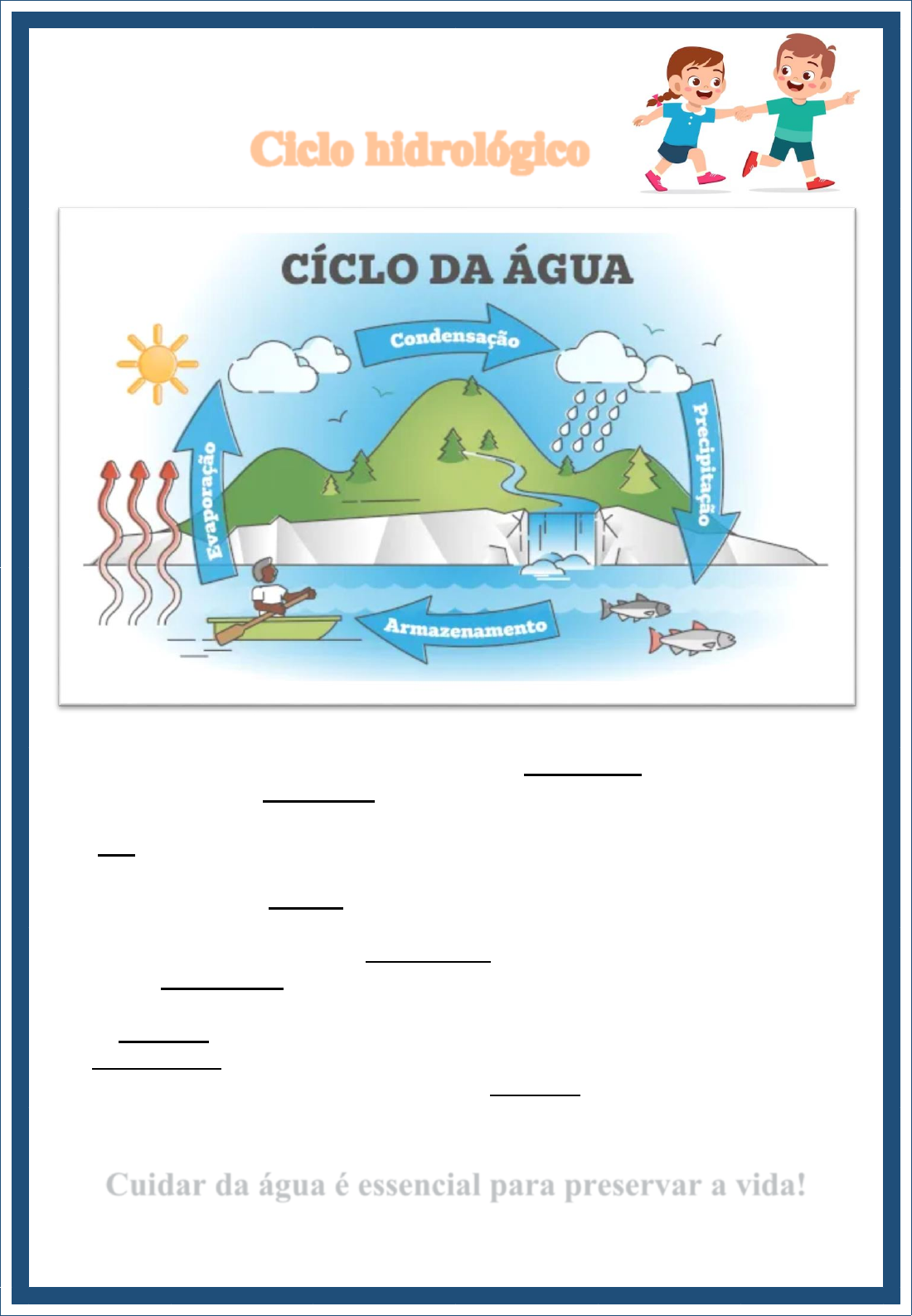 Escola Santa Maria Professora: Mary Alvarenga Ciclo hidrológico O ciclo da água, também conhecido como ciclo hidrológico, refere-se ao movimento permanente da água nas superfícies da Terra, passando de um estado para outro (líquido, sólido ou gasoso). O Sol é o responsável por proporcionar energia para que o ciclo aconteça. Sua luz provoca a evaporação da água presente na superfície terrestre. O vapor de água, proveniente da evaporação, forma as nuvens na atmosfera. Quando estas nuvens ficam sobrecarregadas e atingem altitudes elevadas ocorrem as chuvas. Estas se formam, pois, a temperatura cai e a água transforma-se em líquido (condensação). Ao iniciar a chuva, processo também chamado de precipitação, a água começa a retornar para a superfície terrestre. Nesse momento, ela pode atingir rios, lagos e oceanos, infiltrar-se no solo e nas rochas. Depois, a água vai evaporar novamente, formando assim o ciclo da água mais uma vez. O ciclo da água é de suma importância para a manutenção da vida na Terra. É através do ciclo hidrológico que ocorrem a variação climática, criação de condições para o desenvolvimento de plantas e animais e o funcionamento de rios, oceanos e lagos. Cuidar da água é essencial para preservar a vida! Agora é sua vez! 1. Encontre no diagrama as palavras destacadas no texto. Depois pinte-as de cores diferentes H I D R O L Ó G I C O Z W C E M W T Y S D F K L D G Y J L V R Q Z S O L T N U V E N S I A T C I C L O D A Á G U A L M P Y X M Q B V D Y R L M H P Á O C O N D E N S A Ç Ã O X Y T R Q V K N D F Q W M L Z S F I A G E V A P O R A Ç Ã O D X C R H P R E C I P I T A Ç Ã O A N J S U P E R F Í C I E S Y V M 2. O desenho abaixo mostra o ciclo da água na natureza. Pinte deixando bem colorido. Ciclo da água Agora é sua vez! 3. Complete a cruzadinha com as informações a seguir. 1. É também conhecido como ciclo hidrológico, refere-se ao movimento permanente da água nas superfícies da Terra, passando de um estado para outro. 2. Responsável por proporcionar energia para que o ciclo da água aconteça. 3. Fenômeno que leva a água dos rios até as nuvens. 4. Processo do estado gasoso da água para seu estado líquido. 5. Processo pelo qual a água começa a retornar para a superfície terrestre. Decorrência da condensação do vapor de água que existe na atmosfera. 6. Fluxo de água da superfície que se infiltra no solo. 7. Refere-se ao movimento permanente da água nas superfícies da Terra. 8. Processo pelo qual parte da água que cai no solo, é absorvida e utilizada pelas plantas e retorna a atmosfera. 9. Ocorrência meteorológica que consiste na precipitação de flocos formados por cristais de gelo. 1 4 7 2 6 * 5 3 * * 8 9 Resposta da cruzadinha Complete a cruzadinha com as informações a seguir. 1. É também conhecido como ciclo hidrológico, refere-se ao movimento permanente da água nas superfícies da Terra, passando de um estado para outro. 2. Responsável por proporcionar energia para que o ciclo da água aconteça. 3. Fenômeno que leva a água dos rios até as nuvens. 4. Processo do estado gasoso da água para seu estado líquido. 5. Processo pelo qual a água começa a retornar para a superfície terrestre. Decorrência da condensação do vapor de água que existe na atmosfera. 6. Fluxo de água da superfície que se infiltra no solo. 7. Refere-se ao movimento permanente da água nas superfícies da Terra. 8. Processo pelo qual parte da água que cai no solo, é absorvida e utilizada pelas plantas e retorna a atmosfera. 9. Ocorrência meteorológica que consiste na precipitação de flocos formados por cristais de gelo. 1 4 C O N D E N S A Ç Ã O I C 7 L C 2 S O L I 6 * 5 C I D P L N 3 E V A P O R A Ç Ã O F * E * I Á C H L G I I T 8 U P D R T A I R A R T O Ç A A L Ã 9 N E V E Ç Ó O S Ã G P O I I C R O A Ç Ã O Resposta caça-palavras Encontre no diagrama as palavras destacadas no texto. Depois pinte-as de cores diferentes H I D R O L Ó G I C O Z W C E M W T Y S D F K L D G Y J L V R Q Z S O L T N U V E N S I A T C I C L O D A Á G U A L M P Y X M Q B V D Y R L M H P Á O C O N D E N S A Ç Ã O X Y T R Q V K N D F Q W M L Z S F I A G E V A P O R A Ç Ã O D X C R H P R E C I P I T A Ç Ã O A N J S U P E R F Í C I E S Y V M Mary Alvarenga