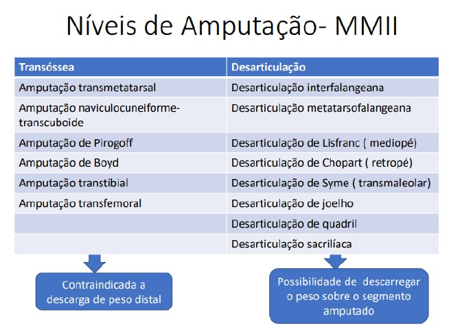 FISIOTERAPIA EM AMPUTADOS Amputação: retirada, geralmente cirúrgica, total ou parcial de um membro. Epidemiologia: Problema de saúde pública, responsável por altas taxas de morbimortalidade. Em 2018, no Brasil, foram contabilizados cerca de 59 mil amputações. Segundo o Ministério da saúde, amputações de membros inferiores correspondem a 85% do total e causam um grande impacto socioeconômico, com perda da capacidade laboral, da socialização e da qv. Causas: Traumáticas ➢Acidentes de Trânsito ➢Acidentes de Trabalho ➢Violência com arma de fogo Não-traumáticas ➢Complicações de doenças vasculares, ➢Complicações de doenças tumorais; ➢Complicações/ alterações congênitas. Gangrena, oclusão arterial periférica, úlceras não cicatrizantes, infecções graves dos tecidos moles, osteomielite, trauma, tumores e deformidades. As complicações do diabetes são categorizadas como distúrbios microvasculares e macrovasculares, que resultam em retinopatia, nefropatia, neuropatia, doença coronariana, doença cerebrovascular e doença arterial periférica. A Organização Mundial de Saúde (OMS) estima que glicemia elevada é a terceira causa, em importância, de mortalidade prematura, superada apenas por pressão arterial aumentada e uso de tabaco. Desarticulação de Symes ➢ Amputação transmaleolar. ➢ Desarticulação do tornozelo com preservação do calcanhar Desarticulação de Chopart ➢ Realizada na transição do retropé e mediopé Desarticulação de Lisfranc ( mediopé) ➢ Consiste na ablação dos metatarsianos e dos dedos CIRURGIA O cirurgião deve: • Permitir a cicatrização primária ou secundária das feridas; • Construir um membro residual para protetização ideal e funcional; • Os retalhos de pele devem possibilitar que a cicatriz seja flexível, indolor e não aderente; • Estabilizar os principais músculos o que permita o máximo de funcionalidade; • Os ossos devem ser seccionados a um comprimento que permita o fechamento da ferida sem tecido redundante excessivo no final do membro residual e sem colocar a incisão sob grande tensão. CARACTERÍSTICAS DO COTO • Nível funcional • Coto estável • Presença de um bom coxim • Mioplastia e miodese • Bom estado da pele • Boa cicatrização FISIOTERAPIA Pré-operatório: ❖Prevenir ❖Educar ❖Conscientizar ❖ Acolher Intervenção Fisiotepia respiratoria pré-anestésica Mobilidade no leito Preserve a mobilidade das articulações Estímulo à movimentação ativa Fase educativa e acolhimento Pós-operatório hospitalar: Melhorar capacidade respiratória Auxiliar na cicatrização Instruir sobre os padrões de marcha PO Orientar posicionamento adequado no leito Auxiliar junto com a equipe nos processos de negação do coto Orientar quanto o manuseio do coto Estimular a consciência corporal Intervenção Sessões curtas e frequentes tem melhor resultado Posicionamento no leito Manobras respiratórias Manobras analgésicas Cinesioterapia Pós-operatório ambulatorial: Intervenção Cuidados com o membro residual Cuidados com a pele Prevenção/ redução de edema Amplitude de movimento Estímulo à mobilidade Estímulos à transferências Treinamento de força muscular Condicionamento cardiorrespiratório Treino de equilíbrio e coordenação Reeducação funcional Protetização e treinamento ENFAIXAMENTO DESSENSIBILIZARÃO Toalhas Buchas de banho CINESIOTERAPIA DISPOSITIVOS DE MARCHA: andador, cadeira de rodas e muletas TREINO DE EQUILÍBRIO image5.png image6.png image7.png image1.png image2.png image3.png image4.png