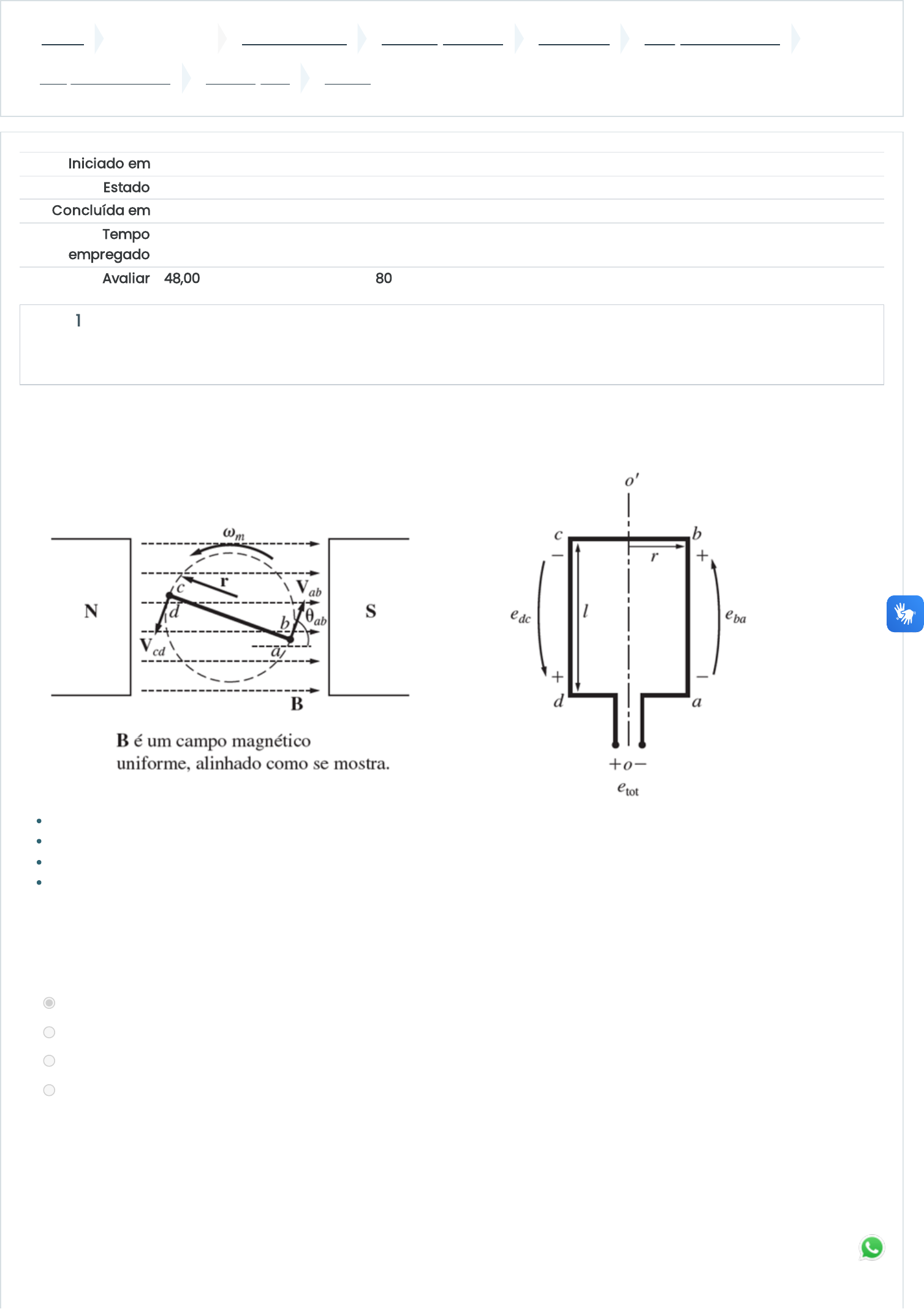 A bobina de espira simples que está girando no campo magnético uniforme mostrado na figura a seguir, possui as seguintes características: