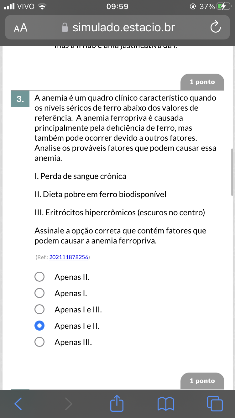 VIVO 09:59 37% AA simulado.estacio.br 1 ponto 3. A anemia é um quadro clínico característico quando os níveis séricos de ferro abaixo dos valores de referência. A anemia ferropriva é causada principalmente pela deficiência de ferro, mas também pode ocorrer devido a outros fatores. Analise os prováveis fatores que podem causar essa anemia. I. Perda de sangue crônica II. Dieta pobre em ferro biodisponível III. Eritrócitos hipercrômicos (escuros no centro) Assinale a opção correta que contém fatores que podem causar a anemia ferropriva. (Ref.: 202111878256) Apenas II. Apenas I. Apenas e III. Apenas lell. Apenas III. 1 ponto