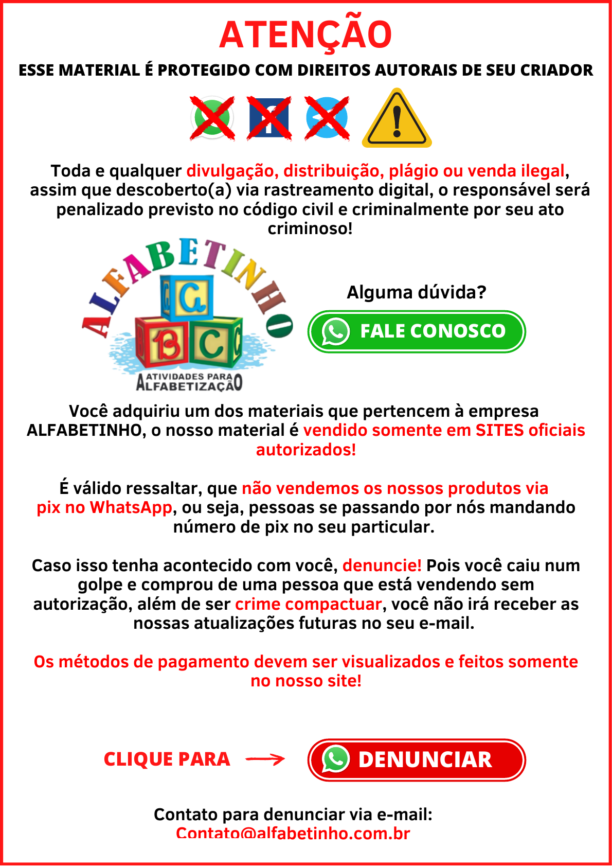ESSE MATERIAL É PROTEGIDO COM DIREITOS AUTORAIS DE SEU CRIADOR Toda e qualquer divulgação, distribuição, plágio ou venda ilegal, assim que descoberto(a) via rastreamento digital, o responsável será penalizado previsto no código civil e criminalmente por seu ato criminoso! CLIQUE PARA Você adquiriu um dos materiais que pertencem à empresa ALFABETINHO, o nosso material é vendido somente em SITES oficiais autorizados! É válido ressaltar, que não vendemos os nossos produtos via pix no WhatsApp, ou seja, pessoas se passando por nós mandando número de pix no seu particular. Caso isso tenha acontecido com você, denuncie! Pois você caiu num golpe e comprou de uma pessoa que está vendendo sem autorização, além de ser crime compactuar, você não irá receber as nossas atualizações futuras no seu e-mail. Os métodos de pagamento devem ser visualizados e feitos somente no nosso site! ATENÇÃO Contato para denunciar via e-mail: Contato@alfabetinho.com.br DENUNCIAR FALE CONOSCO Alguma dúvida? Conteúdo licenciado para Cláudia Rodrigues de Siqueira - https://api.whatsapp.com/send?phone=554497031816&text=Ol%C3%A1!%20Gostaria%20de%20conversar%20um%20assunto. https://api.whatsapp.com/send?phone=554497031816&text=Ol%C3%A1%2C%20poderia%20me%20ajudar%3F%20 Primeiramente gostariamos de agradecer a sua confiança em nosso trabalho. Obrigado! PARABÉNS PELA COMPRA! Escolha uma página que mais gostou desse arquivo e tire uma foto ou grave um vídeo. Poste a foto ou vídeo no seu story e marque nosso Instagram oficial @alfabetinho_ Prontinho, feito isso iremos te encaminhar no seu direct um presente exclusivo, que são: 100 atividades de alfabetização 2023. Quer ganhar um presente exclusivo gratuitamente? Viu como é fácil, mas atenção, se sua conta no Instagram for privada, nós não seremos notificados sobre a sua marcação, ou seja, não saberemos que você marcou a gente, neste caso se sua conta for privada, poste no seu story, marque a gente, tire um print e nos mande no direct. Basta seguir estes 3 passos abaixo: 01 02 03 veja como é simples e fácil ganhar! Conteúdo licenciado para Cláudia Rodrigues de Siqueira - PROFISSIONAIS QUE ATUAM MAIS DE 15 ANOS NA ÁREA! QUALIDADE E SUPORTE PARA CLIENTES Boas vindas! CONHEÇA OS AUTORES REDE PEDAGÓGICA DE PROFESSORES ESPECIALIZADOS AMOR A EDUCAÇÃO INFANTIL E MATERIAIS EXCLUSIVOS! @redeeduca @alfabetinho_ @educaprofessores Conteúdo licenciado para Cláudia Rodrigues de Siqueira - https://www.instagram.com/redeeduca/ https://www.instagram.com/alfabetinho_/ https://www.instagram.com/redeeduca/ https://www.instagram.com/alfabetinho_/ https://www.instagram.com/educaprofessores/ https://www.instagram.com/educaprofessores/ https://www.instagram.com/educaprofessores/ MATEMÁTICAMATEMÁTICA 7º ANO7º ANO BNCC 2023BNCC 2023 20232023 ANUALANUAL Conteúdo licenciado para Cláudia Rodrigues de Siqueira - Escola: Professor(a): Turma: Aluno(a): Data: MÚLTIPLOS E DIVISORES 1) É possível dividir R$ 300,00 entre duas pessoas, de modo que cada uma receba a mesma quantia? Justifique sua resposta. 2) Dois amigos desejam presentear um terceiro amigo com uma bicicleta que custa R$ 892,00. Considerando que o valor da bicicleta será dividido entre eles, quanto cada uma contribuirá para a compra da bicicleta? 3) A tia Claudia comprou 25 bolas de gude, com a pretensão de presentear seus sobrinhos. Sabendo que são dois sobrinhos, é possível que ambos recebam a mesma quantidade? Objetivos de aprendizagem e desenvolvimento: Habilidades (EF07MA01) Conteúdo licenciado para Cláudia Rodrigues de Siqueira - Escola: Professor(a): Turma: Aluno(a): Data: Critério de divisibilidade: Define-se como a divisível por b, se a/b tiver resto zero, sendo a e b naturais eb diferente de zero. 1) Ao dividir 40 por 2 obtemos uma divisão exata? E a divisão de 40 por 3, é exata? 2) Dados os números abaixo, circule os que são divisíveis por 3, e marque com um x o que são divisíveis por 5. 280; 1450; 300; 28; 62; 75; 99; 35; 84; 103; 4125; 37; 19; 2721; 15; 2) Três amigos compraram 40 pães de queijo para tomar um café, totalizando R$ 48,00. Existe a possibilidade dos três pagarem o mesmo valor, após decidirem dividir esse valor entre eles? E em relação aos pães de queijo, existe a possibilidade de todos comerem a mesma quantidade? MÚLTIPLOS E DIVISORES Objetivos de aprendizagem e desenvolvimento: Habilidades (EF07MA01) Conteúdo licenciado para Cláudia Rodrigues de Siqueira - Escola: Professor(a): Turma: Aluno(a): Data: Criança A: Tem 42 rodas. Criança B: Tem 72 rodas. 1) No estacionamento de uma escola estão estacionados apenas carros. Foi solicitado a duas crianças que contassem o total de rodas presentes no pátio: Diante desse impasse, qual criança provavelmente fez uma contagem errada? Justifique sua resposta. 2) Elaine é doceira e recebeu uma encomenda de 1300 bombons. Ela fez 650 de abacaxi, 350 de coco e 300 de morango. Sabendo que as embalagens que serão utilizadas para entregar os doces devem ter a maior quantidade possível de doces, dever ter apenas um sabor em cada e ter quantidades iguais de doces em cada: a) Quantas caixas serão utilizadas? b) Quantos doces cada caixa conterá? MÚLTIPLOS E DIVISORES Objetivos de aprendizagem e desenvolvimento: Habilidades (EF07MA01) Conteúdo licenciado para Cláudia Rodrigues de Siqueira - Escola: Professor(a): Turma: Aluno(a): Data: 1) Wanda comprou lâmpadas para ornamentar o jardim de sua casa. Sabe-se que ela comprou três tipos de lâmpadas que piscam em frequências diferentes. A primeira pisca a cada 30 minutos, a segunda a cada 35 minutos e a terceira a cada 40 minutos. Se as 21h as lâmpadas piscaram juntas, qual o próximo horário elas piscarão juntas novamente? 2) Uma ONG que se envolve com questões do meio ambiente está realizando uma campanha de conscientização. A campanha consiste na troca de 6 garrafas de 2L vazias de refrigerante por 1 garrafa de 2L cheia de refrige