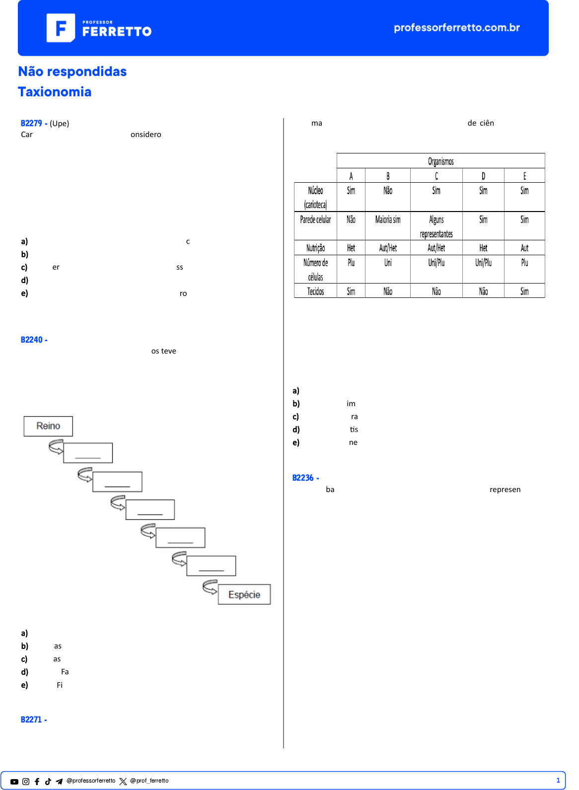 1@professorferretto @prof_ferretto Não respondidas Taxionomia B2279 - (Upe) Carl Von Linné (1707-1778) considerou a existência de apenas dois reinos biológicos em nosso planeta: Animal e Vegetal. Posteriormente, o zoólogo Ernst Haeckel criou o termo Pro�sta, para designar um conjunto de organismos, que não eram caracterizados nem como plantas nem como animais. Uma nova proposta surgiu incorporando o reino Monera, representado pelas bactérias e cianobactérias. Por fim, Robert Whi�aker, em 1960, propôs elevar os fungos a reino, aumentando para cinco. Assinale a alterna�va correta que jus�fique a não inclusão dos vírus no sistema de classificação. a) Ausência das estruturas que compõem uma célula. b) Conjunto de seres unicelulares. c) Caracterís�cas reprodu�vas que não necessitam de gametas. d) Desconhecimento do seu papel ecológico. e) Seres que podem ser autotróficos ou heterotróficos, dependendo do ambiente. B2240 - (Fps) A classificação moderna dos seres vivos teve início com o sueco Karl Von Linné (1707-1778). Lineu, como conhecido em português, propôs em seu livro Systema Naturae, um sistema de classificação dos seres vivos que é empregado, com algumas modificações, até hoje. Com base neste sistema e no diagrama abaixo, assinale a alterna�va cujas categorias taxonômicas propostas por Lineu estão organizadas hierarquicamente. a) Classe, Filo, Ordem, Família, Gênero. b) Filo, Classe, Família, Ordem, Gênero. c) Filo, Classe, Ordem, Família, Gênero. d) Gênero, Família, Ordem, Classe, Filo. e) Classe, Filo, Ordem, Gênero, Família. B2271 - (Uema) Em uma aula experimental, um aluno do curso de ciências biológicas constatou que os cinco organismos analisados apresentavam as seguintes caracterís�cas: HET = Heterótrofos / AUT = Autótrofos UNI = Unicelular / PLU = Pluricelular Com base na classificação mais recente de reinos, sugerida pelas norte- americanas Karlena Schwartz e Lynn Margulis, os organismos analisados (A, B, C, D e E), nesta ordem, pertencem aos seguintes reinos: a) Animal, Monera, Proc�sta, Fungo, Planta. b) Proc�sta, Animal, Monera, Fungo, Planta. c) Animal, Monera, Fungo, Planta, Proc�sta. d) Monera, Proc�sta, Fungo, Planta, Animal. e) Proc�sta, Monera, Animal, Fungo, Planta. B2236 - (U�f) A figura abaixo mostra um cladograma simplificado que representa uma hipótese filogené�ca sobre a evolução dos animais. 2@professorferretto @prof_ferretto I. A caracterís�ca 3 é compar�lhada por Arthropoda, Nematoda, Annelida, Mollusca e Platyhelminthes. II. Chordata e Echinodermata compar�lham um ancestral comum. III. Os clados B e C apresentam ancestral comum e compar�lham a caracterís�ca 2. IV. O clado C é mais próximo evolu�vamente do clado D do que do clado B. São corretasas afirma�vas: a) I, II e III. b) I, II e IV. c) I, III e IV. d) II, III e IV. e) I, II, III e IV. B2234 - (Fuvest) Examine a árvore filogené�ca adiante: Esperamos encontrar maior semelhança entre genes de a) bactéria e protozoário. b) peixe e baleia. c) baleia e pássaro. d) estrela-do-mar e ostra. e) ostra e coral. B2267 - (Famene) Sobre a temá�ca abordada na figura abaixo e considerando o conhecimento sobre Evolução, analise as asser�vas que se seguem, classificando-as como verdadeiras (V) e falsas (F): (_) Apesar dos avanços e contribuições pontuais da classificação dos seres vivos com base em evidências evolu�vas, atualmente u�lizam-se os procedimentos do Systema Naturaeque preconiza as classificações naturais com base em semelhanças morfológicas externas. (_) Embora alguns textos em Biologia não façam tal dis�nção, é válido lembrar que os termos “Taxonomia” e “Sistemá�ca” não são sinônimos, uma vez que o primeiro deles se refere a nomear e descrever espécies. Já o segundo tem maior amplitude e engloba o estudo da filogenia entre os diferentes grupos de seres vivos. (_) O nome da espécie é sempre duplo (daí a expressão “nomenclatura binomial”), devendo ser grafado de forma diferente do restante do texto (itálico ou sublinhado). Escrito em la�m, tal nome tem a primeira palavra correspondente ao gênero (com inicial maiúscula) e a segunda ao epíteto específico (com inicial minúscula). (_) A cladogênese compreende os processos pelos quais um caráter se modifica e regride na população, sendo responsáveis pelo desaparecimento de dados filogené�cos que levem ao ancestral comum da linhagem. (_) Ao interpretar um cladograma, compreendemos que grupos que partem de um mesmo nó são designados grupos irmãos (os quais são mais próximos evolu�vamente entre si do que grupos que partem de um outro nó). A sequência correta é: a) VVFFF. b) FVVFV. c) FVFFF. d) VFFVV. e) VFFFV. B2242 - (Fuvest) Um paleontólogo constatou inúmeras semelhanças morfológicas entre os fósseis X e Y, e grandes diferenças entre esses dois e um terceiro fóssil Z. Constatou também acentuada semelhança entre o fóssil Z um quarto fóssil W. Dentre as classificações a seguir, qual apresenta maior concordância com os dados? 3@professorferretto @prof_ferretto a) Os quatro fósseis pertencem à mesma espécie, mas a gêneros diferentes. b) Cada fóssil pertence a um reino diferente. c) Os quatro fósseis pertencem ao mesmo filo, sendo que X e Y pertencem a um gênero e Z e W a outro gênero. d) Os quatro fósseis pertencem ao mesmo filo, sendo que X e Y pertencem a um reino e Z e W a outro reino. e) Os quatro fósseis pertencem ao mesmo gênero, sendo X e Y pertencem a um filo e Z e W a outro filo. B2272 - (Uerj) O diagrama abaixo mostra a classificação dos seres vivos em cinco reinos, considerando a combinação de três critérios: número de células, existência de núcleo individualizado na célula e forma de nutrição. A proposição que reúne adequadamente dois dos critérios de classificação dos seres vivos u�lizados no diagrama é: a) existem eucari