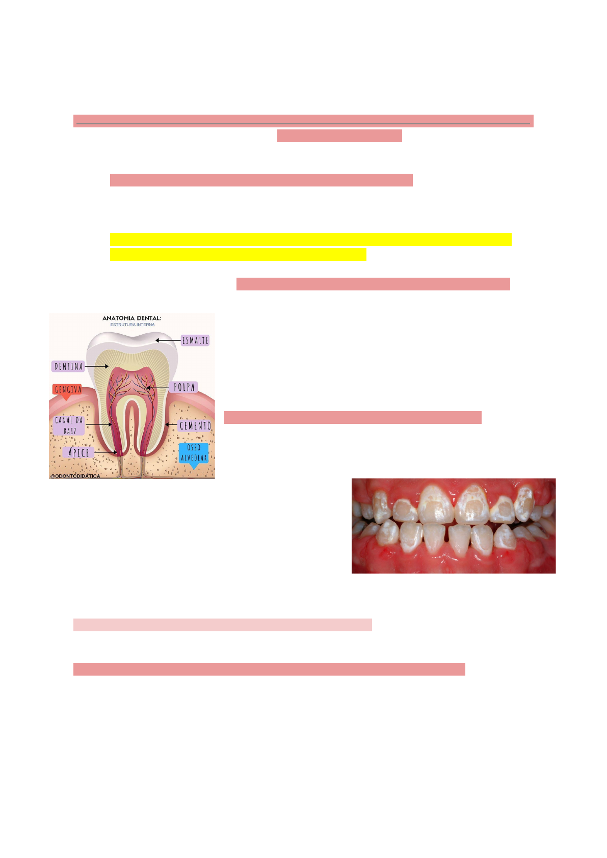 ESMALTE ● O dente é formado por 3 tecidos : esmalte, dentina e polpa. O esmalte fica exposto na cavidade bucal sendo o tecido responsável pelo corte, dilaceração e trituração dos alimentos durante a mastigação. ● O esmalte dentário é o tecido mais calcificado do organismo, sendo formado primordialmente por Ca+ e PO4. Estes minerais polimerizam para formar a hidroxiapatita, os cristalitos de hidroxiapatita respondem por aproximadamente 96% do peso do esmalte, sendo o restante 4% constituído por água e proteínas. ● Os cristalitos de hidroxiapatita se agrupam para formar estruturas semelhantes a bastões, também chamados de prismas do esmalte. Prismas são exclusivos de mamíferos, pois répteis, anfíbios e peixes não mastigam e a dentição é continuamente renovada. OBS: os prismas se originam na junção com a dentina. * Em condições normais o esmalte dos dentes permanentes é transparente e a coloração do dente é dada pela dentina subjacente, que é amarelada devido a presença de colágeno. *Manchas brancas são comumente observadas no esmalte em dentes permanentes. Na maioria das vezes essas manchas são resultados de uma menor calcificação do esmalte, como ocorre nos dentes decíduos. Estas manchas são devido a múltiplos fatores como a descalcificação causada por ácidos produzidos por bactérias bucais; ou congênitas : ● OBS: O ESMALTE É DURO, MAS PODE SE FRATURAR COM OS IMPACTOS DA MASTIGAÇÃO ● O esmalte é fino na região do colo dentário, onde se encontra com o cemento, e pode chegar a aproximadamente 2 mm nas cúspides de dentes molares. -ORIENTAÇÃO DOS CRISTALITOS DE HIDROXIAPATITA : a orientação varia progressivamente, pois são com essas variações que são dissipadas as forças mastigatórias, diminuindo a possibilidade de fraturas. *OBS: A hidroxiapatita que forma os cristalitos tem fórmula: Ca10(PO4)6(OH)2 ● Os cristalitos de hidroxiapatita do esmalte dentário apresentam defeitos estruturais, estes defeitos podem ser causados pela ausência de átomos ou desalinhamento da estrutura cristalina e são mais frequentes no interior do cristalito. Isso faz com que a porção interna seja mais porosa e suscetível a dissolução ácida do que a parede externa do cristalito. ● DESMINERALIZAÇÃO DO ESMALTE : -A hidroxiapatita que forma o esmalte pode ser dissolvida em ácidos, estes ácidos estão presentes em alimentos (frutas cítricas), bebidas (cerveja, vinho) ou são produzidos na cavidade bucal pela decomposição de carboidratos de restos alimentares pelas bactérias presentes no esmalte. -A dissolução ácida ocorre quando a interação do Ca+2 com os íons OH- e PO4-3 é quebrada pelo o H+ e os produtos da reação se dissolvem na saliva. OBS: como a porção central do cristalito é mais porosa, a dissolução ácida é mais eficiente e rápida no centro dela ● REMINERALIZAÇÃO DO ESMALTE: - A remineralização ocorre pela incorporação de Ca+2 e PO4-3 nos remanescentes dos cristalitos parcialmente desmineralizados e ela ocorre em soluções com pH > 5,5. ● O fluoreto facilita a regeneração dos cristalitos parcialmente desmineralizados, aumentando a velocidade da precipitação de Ca+2 e PO4. Além disso, ele incorporado torna os cristalitos mais resistentes à dissolução ácida e forma uma camada protetora de CaF2 sobre a superfície do esmalte. OBS: Cristalitos totalmente dissolvidos não podem ser reformados, pois a remineralização ocorre somente sobre cristalitos parcialmente dissolvidos ● ATAQUE ÁCIDO SOB A SUPERFÍCIE DO ESMALTE : O ataque ácido cria microcavidades na superfície lisa do esmalte, que facilitam a adesão do material restaurador, selantes e brackets ortodônticos à superfície deste tecido. O aparecimento de microcavidades ocorre devido a diferença de orientação dos cristalitos no prisma do esmalte. - Cristalitos são dissolvidos pelo ácido com maior ou menor rapidez dependendo de sua orientação. As microcavidades são preenchidas por resina líquida que depois de polimerizada adere ao esmalte dentário - esse ataque na superfície de um dente, forma irregularidades. ● A dissolução ácida na superfície da camada aprismática é uniforme, ou seja, não produz irregularidades na superfície. Isto ocorre devido ao fato de que na camada aprismática os cristalitos são paralelos entre si, assim a dissolução ácida é uniforme. Uma vez dissolvida a camada aprismática inicia-se a dissolução da camada prismática, onde os cristais não mais são paralelos entre si. ● FORMAÇÃO DO ESMALTE PRISMÁTICO E APRISMÁTICO : quando o esmalte não possui prismas ele é chamado de aprismático. OBS: um prisma é formado principalmente (não exclusivamente) por um único ameloblasto. ● Processo de Tomes= Este processo está presente durante a fase secretora da formação do esmalte, além de aumentar a superfície de secreção do ameloblasto este processo determina a orientação dos cristais de hidroxiapatita do esmalte dentário. Durante a amelogênese os ameloblastos migram em direção à superfície do dente.No final da fase secretora os processos de Tomes diminuem progressivamente de tamanho.Com o aplainamento do processo de Tomes os cristalitos se orientam paralelamente entre si e são aproximadamente perpendiculares a superfície do esmalte. Como os cristalitos são paralelos entre si não existe formação de prismas no esmalte superficial, sendo esta camada dita aprismática. ● DEPOSIÇÃO E MINERALIZAÇÃO DO ESMALTE: O esmalte é sintetizado por uma célula denominada de ameloblasto, que se origina a partir de uma célula indiferenciada derivada do epitélio da cavidade bucal primitiva. Esta célula é denominada de pré-ameloblasto. A síntese do esmalte se inicia após a diferenciação do pré-ameloblasto em ameloblasto.A matriz do esmalte secretada pelos ameloblastos é constituída por aproximadamente 70% de matéria orgânica e 30% mineral. Esta matriz tem c