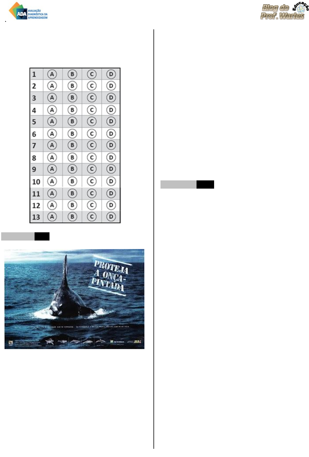 1ª Prova Diagnóstica – 2022 – 9º Ano Português ESCOLA: ________________________ Prof.:____________________________ Nome: ___________________________ Questão 01 –––––––––––––––––––––––––––––◊ (Saresp). Leia o texto para responder à questão. “Muitas espécies estão na lista de extinção, mas, se depender da Petrobras, a baleia franca não vai continuar nela”. (PROTEJA a onça pintada. Propaganda. Disponível em: <http://www2.petrobras.com.br/ propaganda/pop/images/Biodiversidade_Baleia%20Franca_B.jpg>. Acesso em: 3 ago. 2008) Quanto ao gênero, ao assunto e à finalidade, podemos afirmar que o texto é (A) uma reportagem, cujo assunto é a proteção de espécies animais em extinção e tem por finalidade incentivar sua proteção. (B) uma notícia, cujo assunto é a proteção de espécies animais em extinção e tem por finalidade informar que a empresa possui um programa voltado à proteção da baleia franca. (C) um cartaz, cujo assunto é a proteção de espécies animais em extinção e tem por finalidade incentivar a proteção desses animais, exceto a baleia franca. (D) um anúncio publicitário, cujo assunto é a proteção de espécies animais em extinção e tem por finalidade informar que a empresa possui um programa voltado à proteção da baleia franca. Questão 02 –––––––––––––––––––––––––––◊ (Saresp). Leia o texto para responder à questão. Livramento (morro do): Situado no bairro da Saúde, foi o local onde Machado nasceu, em 1839. Naquele ano, toda a área do morro era ocupada por uma imensa chácara, propriedade da família de Bento Barroso Pereira, homem de prestígio, brigadeiro e senador do Império, falecido em 1837. Desde então, sua esposa, D. Maria José de Mendonça Barroso Pereira assumiu a administração da propriedade, formada por vários imóveis, o palacete da proprietária, a capela consagrada a Nossa Senhora do Livramento, casas destinadas a escravos e a agregados. Foi ali que Machado passou os primeiros anos de vida, que o iriam marcar para sempre. Lúcia Miguel Pereira acha que o escritor recriou o ambiente da chácara na novela “Casa Velha”, opinião aceita por outros biógrafos. Machado nasceu em casa não identificada, demolida no início do século XX. Fonte: CUNHA, Celso. Gramática do português contemporâneo. Porto Alegre: L&PM Pocket; Rio de Janeiro: Lexikon, 2007. Fragmento. Das informações contidas nesse verbete, a mais importante é que (A) a área do morro era ocupada por uma imensa chácara, propriedade da família de Bento Barroso Pereira. (B) D. Maria José assumiu a administração da propriedade depois da morte do marido. (C) o escritor Machado de Assis nasceu no morro do Livramento, no bairro da Saúde. (D) os proprietários da chácara onde nasceu Machado de Assis eram pessoas ilustres. Questão 03 –––––––––––––––––––––––––––◊ (Saresp). Leia o texto para responder à questão. SAÚDE Um turista pergunta a um morador de uma cidadezinha: — O clima aqui é bom? — Se é! Quando eu cheguei aqui meus olhos não se abriam, não tinha um fio de cabelo, não falava e tinha de ser carregado de um lado para outro. — Incrível a sua recuperação! E há quanto tempo o senhor está nessa cidade? E o outro com ares de gozador: — Eu nasci aqui! (Autor anônimo) O efeito humorístico desse texto está centrado na frase (A) “O clima aqui é bom?” (B) “Quando eu cheguei aqui”. (C) “meus olhos não se abriam”. (D) “Eu nasci aqui”. Questão 04 –––––––––––––––––––––––––––◊ (Saresp). Leia o texto para responder à questão. TECNOLOGIA Tablets não fazem com que alunos se isolem Há um receio recorrente entre os docentes de que a tecnologia leve os estudantes a se fechar e não participar de aula. A interatividade, no entanto, não corre perigo. Segundo Adriana Martinelle, coordenadora da área de Educação e Tecnologia do Instituto Ayrton Senna, é possível aproveitar computadores, tablets e celulares para estimular o contanto e a conversa. Ela aconselha os professores a se familiarizar com as novas ferramentas. “É preciso vivenciar a cultura digital e perceber que nós também fazemos parte dela”, diz a especialista. A tese defendida no texto sobre tecnologia, e de que ela (A) atrapalha a interação entre os alunos. (B) afasta professores e alunos. (C) pode estimular o contato e a conversa. (D) coloca em perigo a interação em sala. Questão 05 –––––––––––––––––––––––––––◊ (Saresp). Leia o texto para responder à questão. APRESENTAÇÃO Gilberto Dimenstein Por favor, leitor, imagine a figura de Tiradentes. Conseguiu? Facílimo, ele está em todos os livros escolares. Claro que veio à sua cabeça aquela figura magra, sem camisa, cabelos e barbas longas, olhos tristes e profundos. Lamento: você foi enganado. Tiradentes foi enforcado em 21 de abril de 1792 e esquartejado. Mas só duzentos anos depois, nas comemorações do bicentenário de sua morte, foi divulgada com mais clareza a informação de que aquele herói, parecido com Jesus Cristo, nunca existiu. Documentos comprovam que na casa do nosso mártir foram encontradas duas navalhas e um espelho. Além disso, sabemos que, naquela época, os presos eram proibidos de usar barbas e cabelos longos. No mais, Tiradentes era soldado da Polícia Militar, que, em seu regimento, exigia cabelo curto e rosto escanhoado. (Gilberto Dimenstein. Apresentação. Os bastidores do poder.São Paulo: Folha de S.Paulo, 1990. p.13. Adaptado) A tese defendida pelo autor do texto é de que (A) Tiradentes nunca existiu de fato. (B) a imagem de Tiradentes está equivocada. (C) Tiradentes parecia-se com Jesus Cristo. (D) o personagem histórico não era um herói. Questão 06 ––––