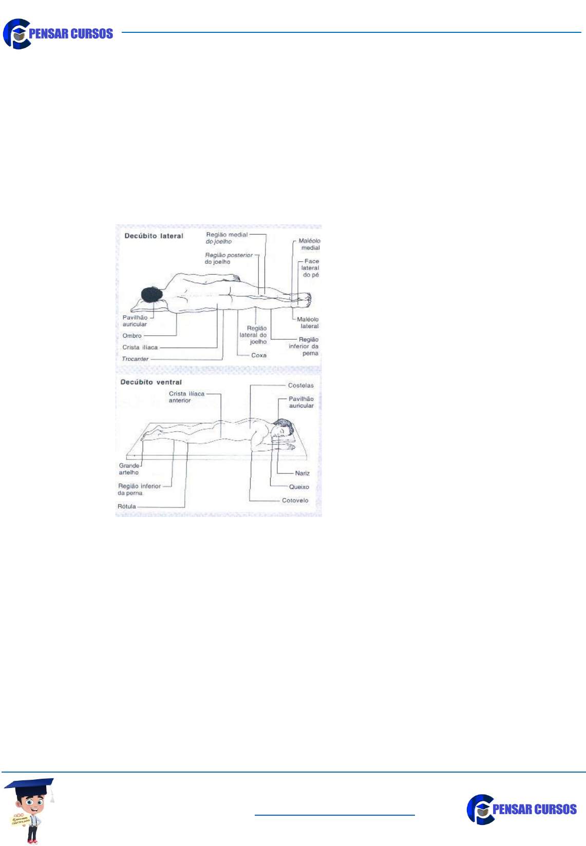Cursos Online Grátis? Acesse: www.pensarcursos.com.br ÚLCERA POR PRESSÃO (UPP) Ferida ocasionada pela interrupção do fornecimento de sangue para a área, causado por fatores externos: pressão, cisalhamento ou fricção. Plano de cuidados: A) Avaliar áreas de Risco file:///D:/Meus%20Negocios/Pensar%20Cursos/www.pensarcursos.com.br Cursos Online Grátis? Acesse: www.pensarcursos.com.br Fonte: Hess, Cathy Thomas, 2001 B) Classificação Para Úlceras por Pressão A classificação mais utilizada é a proposta pela NPUAP: 1. Estágio I: eritema não esbranquiçado, com pele intacta; 2. Estágio II: perda parcial da epiderme e/ou derme. Pode ter bolha, abrasão ou ulceração; 3. Estágio III: perda total da pele, com ou sem comprometimento de tecidos adjacentes; file:///D:/Meus%20Negocios/Pensar%20Cursos/www.pensarcursos.com.br Cursos Online Grátis? Acesse: www.pensarcursos.com.br 4. Estágio IV: comprometimento de estruturas profundas (ossos, órgãos e tendões). Observação: Impossíveis de estadiamento = quando apresentam quase que 100% de tecidos inviáveis C) Avaliar Risco de desenvolver e complicar MEDIDAS DE PREVENÇÃO SEGUNDO SCORE DA ESCALA DE BRADEN RISCO BRANDO RISCO MODERADO RISCO SEVERO ▪ Colchão piramidal ▪ Sabonete neutro ▪ Hidratar a pele ▪ Mudança de decúbito ▪ Colchão piramidal / gel ▪ Sabonete neutro ▪ Hidratar a pele ▪ Protetores ▪ Mudança de decúbito de 2/2 horas ou de 1/1 hora dependendo do caso ▪ Manter cabeceira elevada à 30º ▪ Avaliação nutricional ▪ Reabilitação ▪ Colchão de ar ▪ Sabonete neutro ▪ Hidratar a pele ▪ Protetores ▪ Posicionadores ▪ Mudança de decúbito de 2/2 horas ou de 1/1 hora dependendo do caso ▪ Manter cabeceira elevada à 30º ▪ Avaliação nutricional ▪ Reabilitação file:///D:/Meus%20Negocios/Pensar%20Cursos/www.pensarcursos.com.br Cursos Online Grátis? Acesse: www.pensarcursos.com.br ORIENTAÇÕES GERAIS - Inspecionar a pele uma vez ao dia com atenção especial para proeminências ósseas; - Orientar quanto ao banho e higiene íntima; - Evitar uso de água quente; - Utilizar agentes de limpeza suaves; - Evitar fricção da pele durante o banho e mudanças de decúbito; - Evitar massagear proeminências ósseas; - Manter a pele livre de fezes, urina e suor; - Evitar posicionar o paciente diretamente sobre trocânter; - Reposicionar o paciente a cada meia hora quando sentado em cadeiras ou cadeiras de roda; - Envolver a família/cuidador na prevenção e tratamento da ferida; - Orientar o uso de lençol móvel para reposicionar o paciente; - Em decúbito lateral, não posicionar diretamente sobre o trocânter, apoiando no glúteo; - Em cadeira de rodas utilizar almofadas de espuma no assento; - De acordo com a escala de Braden seu score de 16 a 11 pontos, garanti avaliação frequente da equipe de enfermagem. Fonte: AHCPR – Agency for Health Care Policy and Research. D) Tratamento ÚLCERAS POR PRESSÃO ESTÁGIO I e II • Continuamente aplicar as medidas preventivas de acordo ao score apresentado; • Somente no ESTÁGIO I: Utilizar AGE 2x/dia ou FILME TRANSPARENTE por até sete dias; • Utilizar para o ESTAGIO II: placa de HIDROCOLÓIDE CAMADA FINA ou seguir o algoritmo de tratamento. ÚLCERAS POR PRESSÃO ESTÀGIO III e IV • Tratar conforme apresentação da ferida – seguir o algoritmo de tratamento; file:///D:/Meus%20Negocios/Pensar%20Cursos/www.pensarcursos.com.br Cursos Online Grátis? Acesse: www.pensarcursos.com.br • Associar medidas preventivas de acordo ao score apresentado. ÚLCERAS POR PRESSÃO IMPOSSÍVEIS DE ESTADIAMENTO • Continuamente aplicar as medidas preventivas de acordo ao score apresentado; • Debridar os tecidos inviáveis • Após debridamento estadiar. ÚLCERA VENOSA Ferida decorrente de insuficiência venosa crônica. É absolutamente necessário o reconhecimento da causa de uma úlcera de perna antes do início do tratamento. Um diagnóstico incorreto pode levar a condutas inapropriadas, especialmente à compressão extrínseca indispensável no tratamento das úlceras venosas. A avaliação da circulação arterial é obrigatória nos pacientes com úlcera de perna. A palpação dos pulsos distais e a medida do IPTB (Índice de Pressão Tornozelo/Braço) oferecem os elementos básicos necessários para o diagnóstico diferencial com as feridas isquêmicas. ORIGEM: PORTADOR DE UPP EM REGIÃO SACRA ESTÁGIO III file:///D:/Meus%20Negocios/Pensar%20Cursos/www.pensarcursos.com.br Cursos Online Grátis? Acesse: www.pensarcursos.com.br A. Primária: varizes, dormência, cãibras, edema vespertino, gestações, sensação de peso, varicorragia e tromboflebite B. Secundária (trombótica): edema pós-parto, pós-operatório, fraturas, tabagismo, anticoncepcional e acamado. Avaliar Risco A. PALPAÇÃO DE PULSOS POPLITEO, TIBIAL POSTERIOR E PEDIOSO: a ausência não deve ser avaliada como indicativo de comprometimento arterial. Deve ser avaliado em conjunto aos demais indicativos. B. DIGITO-COMPRESSÃO ou PERFUSÃO PERIFÉRICA: cabeça do metatarso e na polpa plantar, exercer compressão por 3 segundos e observar o retorno da coloração normal. Fonte: BRUNNER, SUDART, 2000 C. ÍNDICE TORNOZELO-BRAÇO (ITB): teste indicado para classificação do risco cardiovascular, apesar de não determinar localização da obstrução; para detecção precoce de doença arterial oclusiva dos membros inferiores (DAOMI). Tempo de retorno à coloração normal Circulação Observação 3 segundos Sem alteração 3 e 5 segundos Alteração vascular Idade, estresse e deficiência física 6 segundos Alteração vascular significativa Avaliação médica file:///D:/Meus%20Negocios/Pensar%20Cursos/www.pensarcursos.com.br Cursos Online Grátis? Acesse: www.pensarcursos.com.br Material: manguito, Doppler vascular, papel toalha, gel de USG e fita métrica. Técnica de aferição: 1. Deixar o paciente em decúbito dorsal por 5 minutos antes de iniciar o teste; 2. Verificar 