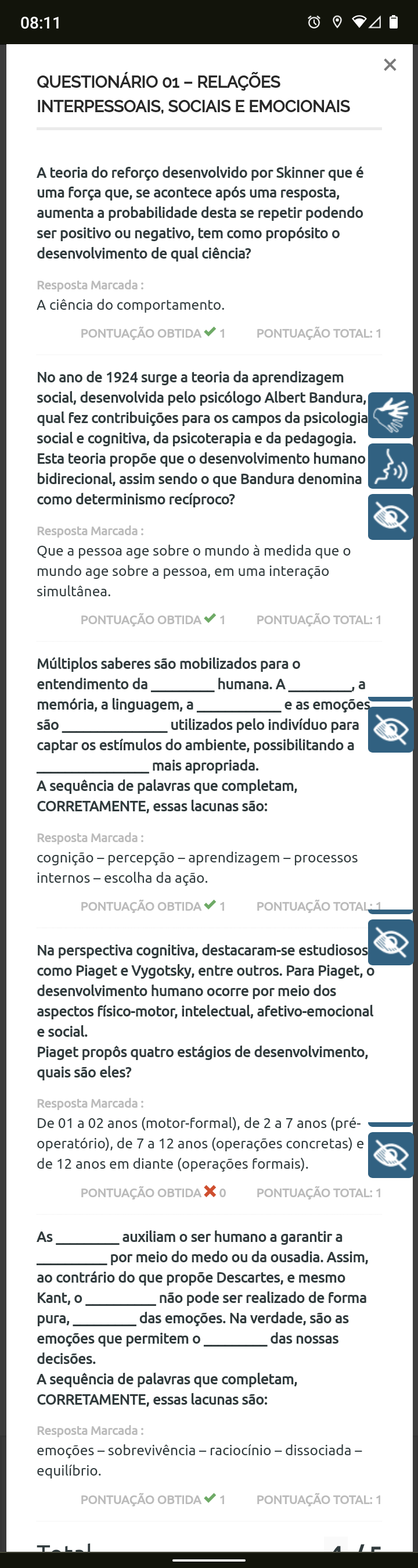 X QUESTIONÁRIO 01 - RELAÇÕES INTERPESSOAIS, SOCIAIS E EMOCIONAIS A teoria do reforço desenvolvido por Skinner que é uma força que, se acontece após uma resposta, aumenta a probabilidade desta se repetir podendo ser positivo ou negativo, tem como propósito o desenvolvimento de qual ciência? Resposta Marcada : A ciência do comportamento. PONTUAÇÃO OBTIDA 1 PONTUAÇÃO TOTAL: 1 No ano de 1924 surge a teoria da aprendizagem social, desenvolvida pelo psicólogo Albert Bandura, qual fez contribuições para os campos da psicologia social e cognitiva, da psicoterapia e da pedagogia. Esta teoria propõe que o desenvolvimento humano bidirecional, assim sendo o que Bandura denomina como determinismo recíproco? Resposta Marcada : Que a pessoa age sobre o mundo à medida que o mundo age sobre a pessoa, em uma interação simultânea. PONTUAÇÃO OBTIDA 1 PONTUAÇÃO TOTAL: 1 Múltiplos saberes são mobilizados para o entendimento da humana. A memória, a linguagem, a e as emoções são utilizados pelo indivíduo para captar os estímulos do ambiente, possibilitando a mais apropriada. A sequência de palavras que completam, CORRETAMENTE, essas lacunas são: Resposta Marcada : cognição - percepção - aprendizagem - processos internos - escolha da ação. PONTUAÇÃO OBTIDA 1 PONTUAÇÃO TOTAL Na perspectiva cognitiva, destacaram-se estudiosos como Piaget e Vygotsky, entre outros. Para Piaget, o desenvolvimento humano ocorre por meio dos aspectos físico-motor, intelectual, afetivo-emocional e social. Piaget propôs quatro estágios de desenvolvimento, quais são eles? Resposta Marcada : De 01 a 02 anos (motor-formal), de 2 a 7 anos (pré- operatório), de 7 a 12 anos (operações concretas) e de 12 anos em diante (operações formais). PONTUAÇÃO OBTIDA 0 PONTUAÇÃO TOTAL: 1 As auxiliam o ser humano a garantir a por meio do medo ou da ousadia. Assim, ao contrário do que propõe Descartes, e mesmo Kant, o não pode ser realizado de forma pura, das emoções. Na verdade, são as emoções que permitem o das nossas A sequência de palavras que completam, CORRETAMENTE, essas lacunas são: Resposta Marcada : emoções - sobrevivência - raciocínio - dissociada - equilíbrio. PONTUAÇÃO OBTIDA 1 PONTUAÇÃO TOTAL: 1