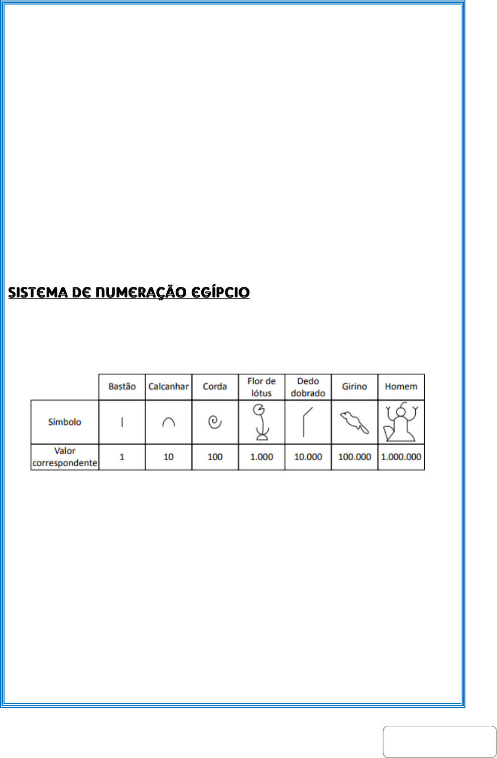 Data: ________________________ Turma: _______________________________ Professora: _______________________________________________________ Disciplina: Matemática Os antigos sistemas de numeração. Antigamente, outros povos também criaram seus sistemas de numeração, diferentes do que utilizamos hoje. Os egípcios, uma das civilizações mais antiga da humanidade, usavam os seguintes símbolos para representar os números: Ao observar os valores atribuídos a esses símbolos, percebemos que cada novo símbolo equivale a 10 vezes o anterior. Por exemplo: IIIIIIIIII = ∩ Saiba mais Para representar um milhão, os egípcios desenhavam um homem com as mãos levantadas para o céu. Uma das explicações era que a grandeza desse número impunha respeito, por isso o relacionavam com a imensidão do céu. @profraffaeli Os antigos romanos desenvolveram um sistema de numeração em que os números eram representados por sete letras maiúsculas do alfabeto, cada uma delas com um valor. A representação de um número nesse sistema deve obedecer a algumas regras. Vamos relembrá-las a seguir. As letras I, X, C, M podem ser repetidas até três vezes, indicando uma adição. As letras I, X, C, colocadas à direita de outras de maior valor, têm seus valores somados. As letras I, X, C, colocadas à esquerda de outras de maior valor, têm seus valores subtraídos. Atualmente, os números romanos são representados em alguns relógios, na numeração de capítulos de livros, na numeração de volumes de coleções e juntos a nomes de reis e papas, por exemplo. Atividades 1) Represente os números utilizando o sistema de numeração egípcios. a) Doze_____________________ b) cento e vinte e um ___________________ 2) Agora, represente os números utilizando algarismos romanos. a) Oito _____________ b) quinze ______________ c) vinte e seis _____________ 3) Forme os números possíveis com os algarismos 1 e 3. Depois, escreva esses números no sistema egípcios. __________________________________________________________________ __________________________________________________________________ 4) Leia o número abaixo, escrito com símbolos egípcios, e depois responda às perguntas: ∩ I a) Como se escreve e se lê esse número no nosso sistema de numeração R: ________________________________________________________________ b) Em nosso sistema de numeração, esse número é representado por quantos algarismos diferentes. Quais são eles R: ________________________________________________________________ c) Na escrita egípcia, qual é o símbolo que corresponde à dezena _____________ 5) Represente em números romanos. a) 23 __________ d) 68 __________ g) 239 __________ b) 12 __________ e) 81 __________ h) 375 __________ c) 29 __________ f) 94 __________ i) 472 __________ 6) Agora, escreva em algarismos arábicos. a) CCXIII _________ d) DCCIX ___________ g) CDXXXIX __________ b) CMXXIV _______ e) DCCXXIII _________ h) LXVII _____________ c) CCVIII ________ f) MMCCCXX _________ i) XCVI _____________ 7) Informe em números romanos os antecessores e sucessores dos números a seguir: a) __________ 96 __________ c) ___________ 876 ____________ b) __________ 69 __________ d) ___________ 109 ____________ 8) Complete as sequências numéricas: a) V,X,XV,_______,_______,_______,________,________,_______,__________ b) X,XX,XXX ,_______,______,_______,_______,________,_______,_________ c) LV,LVI,LVII,_______,______,_______,_______,________,_______,_________ d) CX,CXX,CXXX,_______,______,_______,_______,________,_______,_______ 9) Faça a correspondência: 10) Atenção para o ditado de números romanos. mMD MDV MDVL MV MLV 1555 1055 1505 1500 1005