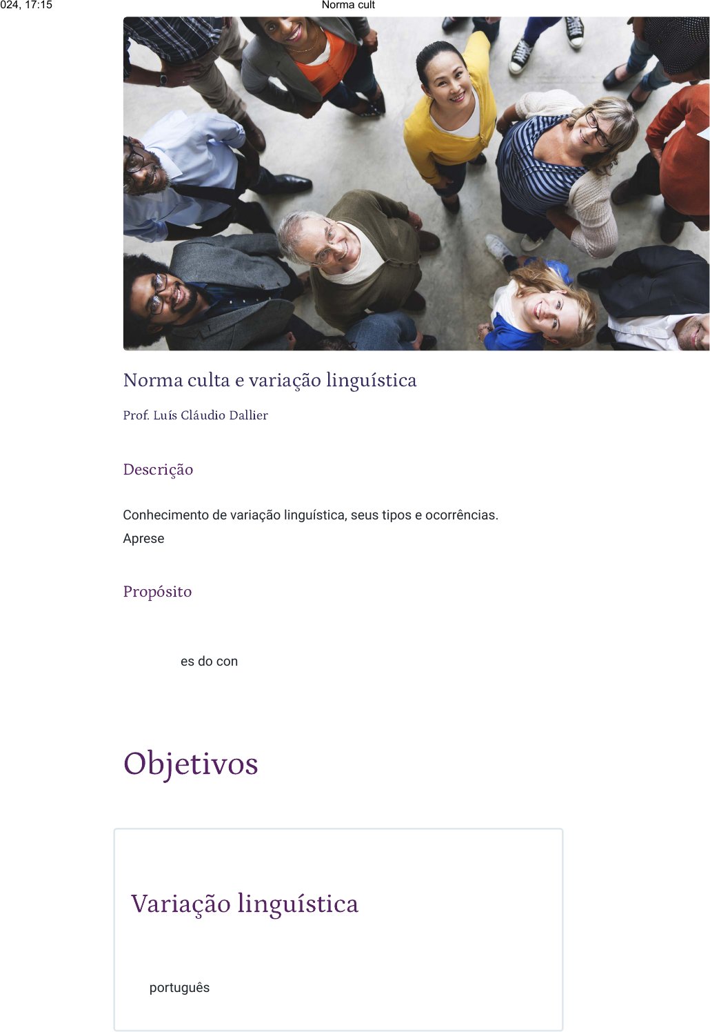 Norma culta e variação linguística Prof. Luís Cláudio Dallier Descrição Conhecimento de variação linguística, seus tipos e ocorrências. Apresentação da norma culta e seu uso na comunicação. Propósito Compreender os diferentes casos de variação linguística e as implicações do conceito de norma culta no uso adequado da língua portuguesa. Objetivos Módulo 1 Variação linguística Reconhecer diferentes tipos e manifestações da variação linguística no português. 09/05/2024, 17:15 Norma culta e variação linguística https://stecine.azureedge.net/repositorio/00212hu/00227/index.html?brand=estacio# 1/37 Módulo 2 O que é a norma culta Identificar o conceito de norma culta e suas implicações no uso da língua portuguesa. Você já percebeu que a língua portuguesa apresenta variações em relação à pronúncia ou ao significado de algumas palavras dependendo da localidade do falante? Isso acontece porque a língua é algo vivo, dinâmico, e seu uso no dia a dia implica variações que estão relacionadas com a região, a profissão, o grau de escolaridade e outros fatores do usuário da língua. Reconhecer que a língua apresenta diversidades no seu uso é importante para identificarmos em que situações de comunicação uma variedade da língua é apropriada ou inadequada. Na verdade, precisamos conhecer a norma culta da língua para reconhecermos as diferentes manifestações das variações em relação a essa norma ou padrão. Por isso, vamos estudar alguns casos de variação linguística para depois compreendermos o que é e como funciona a norma culta da língua. Introdução 09/05/2024, 17:15 Norma culta e variação linguística https://stecine.azureedge.net/repositorio/00212hu/00227/index.html?brand=estacio# 2/37 1 - Variação linguística Ao �nal deste módulo, você será capaz de reconhecer diferentes tipos e manifestações da variação linguística no português. Contextualizando Neste vídeo, o professor Luís Cláudio Dallier faz uma breve contextualização do assunto. Confira! Variação linguística: o que é? A língua sofre variações ao longo do tempo, conforme o espaço geográfico, a estrutura social e a situação ou o contexto de uso. Isso significa dizer que uma língua está sujeita a passar por modificações no 09/05/2024, 17:15 Norma culta e variação linguística https://stecine.azureedge.net/repositorio/00212hu/00227/index.html?brand=estacio# 3/37 tempo e no espaço a fim de satisfazer às necessidades de expressão e de comunicação, individuais ou coletivas, de seus usuários. Isso é o que se chama variação linguística. Podemos abordar a variação linguística sob diversas perspectivas. Se levarmos em conta uma situação de comunicação qualquer, teremos alguns elementos que vão apontar para variedades no uso da língua. Essas perguntas evidenciam que nossa fala pode variar de acordo com a situação ou com o contexto, conforme o falante e as pessoas que ouvem (interlocutores), o assunto tratado ou a intenção da mensagem. Perceba que a variação linguística corresponde a diferentes ocorrências de uma mesma língua. Tipos de variações linguísticas Sem nos preocuparmos muito com classificações técnicas e exaustivas, próprias da Sociolinguística, podemos dizer que a variação linguística pode ser de, pelo menos, três tipos: Sociolinguística Sociolinguística é uma área da Linguística que trata das relações entre linguagem e sociedade, estudando a função social da linguagem e a influência dos fatores sociais sobre a língua. 09/05/2024, 17:15 Norma culta e variação linguística https://stecine.azureedge.net/repositorio/00212hu/00227/index.html?brand=estacio# 4/37 Abordaremos cada um desses tipos a seguir. Variação regional Variações da língua numa perspectiva geográfica, originando os regionalismos. Manifestam-se, principalmente, pelo sotaque e por palavras ou expressões utilizadas pelos falantes de determinada região. Um exemplo desse tipo de variação são os falares ou dialetos. Veja a diferença entre alguns falares no Brasil: Dialetos São variações faladas por comunidades geograficamente definidas. Também denominados “falares” por alguns linguistas. 09/05/2024, 17:15 Norma culta e variação linguística https://stecine.azureedge.net/repositorio/00212hu/00227/index.html?brand=estacio# 5/37 Êta que esse curso é bem arretado! Caraca! Esse curso é muito maneiro! 09/05/2024, 17:15 Norma culta e variação linguística https://stecine.azureedge.net/repositorio/00212hu/00227/index.html?brand=estacio# 6/37 Nossinhora! Esse curso é bom demais da conta, sô! Bah, esse curso é tri! As diferentes designações no Brasil para um mesmo referente ou aspecto da realidade é outro exemplo de variação linguística na dimensão geográfica: macaxeira no Nordeste, mandioca em São Paulo e 09/05/2024, 17:15 Norma culta e variação linguística https://stecine.azureedge.net/repositorio/00212hu/00227/index.html?brand=estacio# 7/37 aipim no Rio de Janeiro correspondem à mesma raiz utilizada na culinária nacional. Rio de Janeiro X São Paulo O professor Luís Cláudio Dallier explora mais essas diferenças entre as cidades do Rio de Janeiro e São Paulo. Não podemos afirmar que determinada região do país fala “o português mais correto”. Tal afirmação é falsa, pois o que há são variações da língua portuguesa. Exemplo A pronúncia do cearense ou do carioca, por exemplo, não é errada ou certa, mas, simplesmente, o modo próprio de articular os sons numa determinada comunidade linguística. Sendo o português uma língua falada por diversas nações, em diferentes continentes, é interessante lembrar que a língua também varia de um país para outro, tanto na fala quanto na escrita. Ainda que o Novo Acordo Ortográfico da Língua Portuguesa procure padronizar a grafia das palavras, há alguns aspectos na escrita que são peculiares em Portugal e outros no Brasil. 