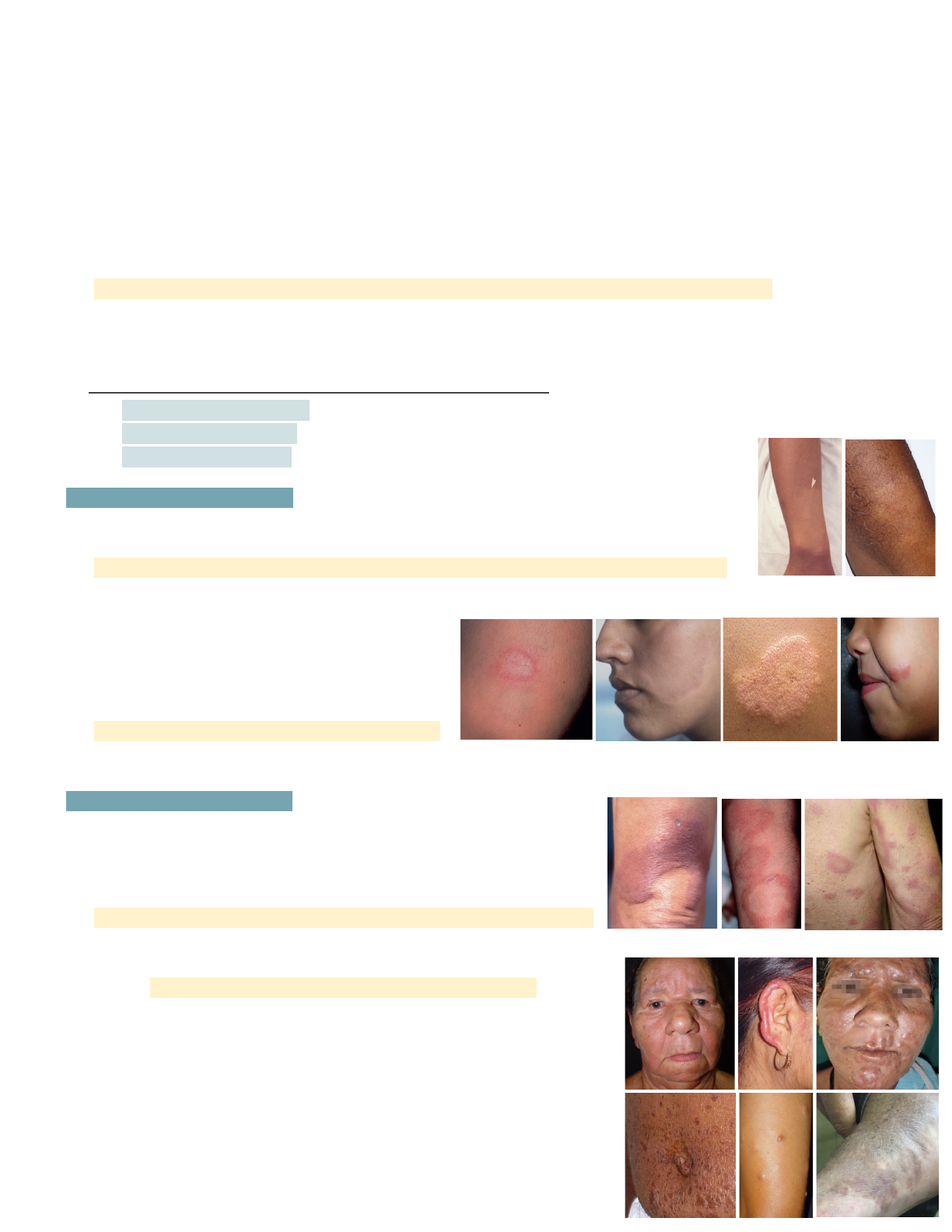Hanseníase HM VII, 26/01/23 - Dr. Paulo Victor Amorim CONCEITOS GERAIS Doença infecciosa causada pelo Mycobacterium leprae (alta infectividade e baixa patogenicidade) ● BAAR: típicas (hanseníase e tuberculose) e atípicas (não tuberculose) - aglomera-se em globias ● bacilo de Hansen (BH) tem tropismo pela pele e nervos periféricos (degradação células Schwann) ● replicação mais longa (2 semanas) que da TB (2 dias) - maioria população resistência intrínseca ● incubação em média de 2 a 7 anos (pode chegar até 20 anos) - homem como único hospedeiro ● doença primariamente neurológica (pura), mas costuma também acometer pele ● transmissão pelas VAS (contato direto não contamina) - parasita intracelular obrigatório ● indivíduos com boa resposta imunológica evoluem mais rapidamente com incapacidades ● Brasil é 2º país (subnotificado durante pandemia) - <15 anos reflete intensa contaminação local ➯Definição do caso requer ⩾1 das seguintes características 1. alteração sensibilidade em lesão(ões) de pele: térmica à dolorosa à tátil (estesiômetros) 2. acometimento neural compatível: espessamento de tronco neural, dor… 3. baciloscopia positiva: pele da lesão ou linfa do lóbulo da orelha ou cotovelo Paucibacilar <5 lesões HI - Hanseníase Indeterminada ● mácula hipocrômica de bordas mal delimitadas (lanterna ou dermatoscópio) ● ausência obrigatória de lesões troncos nervosos periféricos (só nervículos) ● sensibilidade alterada (sem incapacidade): hipoestésica ou anestésica HT: Hanseníase Tuberculóide ● placa eritemato descamativas ○ localizada e assimétrica ● máxima capacidade contenção bacilar ○ imunidade celular (TH1) ● aspecto tricofitoide (“lesões fúngicas”) ○ centro tende normalidade, até 1 tronco nervoso acometido - cuidado falso negativo em face ● hanseníase nodular da infância - difícil teste sensibilidade (assemelha alergia picada inseto em face) Multibacilar >6 lesões HD - Hanseníase dimorfa ou Borderline ● oscilação no padrão de reação ao bacilo ● maior número de lesões, maioria dos casos e de reações ● borda espessa e mal definida (intermediárias) ● lesões foveolares (“queijo suíço”), arciformes, reniformes HV: hanseníase virchowiana ● generalizada e simétrica (pior prognóstico) ○ acometimento orelha é sempre multibacilar ○ TH2 - imunidade humoral não é suficiente ● fácies leonina (aspecto brilhante): infiltrações generalizadas ○ madarose pela destruição folículos pilosos ○ angiodermite-like ou púrpura-like no dorso do pé ● otorrino: congestão nasal, rinorreia, disfagia, rouquidão ● ictiose adquirida: dificuldade de manter coesão da pele ○ ressecada destruição glândula (sudorípara e sebácea) ● hansenomas são pequenas lesões (ddx: sarcoidose, leishmania difusa anérgica, molusco, papulose linfomatóide) Baciloscopia para Hanseníase (BAAR) ● coleta de raspado intradérmico em locais isquemiados: 4 amostras (lóbulo, cotovelo, joelho, lesão) ● índice quantitativo (até 6+) e morfológico (íntegro/viável, fragmentado e granuloso) ● qualquer quantidade de bacilo íntegro requer tratamento (reduz 0,75-1 ponto/ano) Lesões ● comprometimento autonômico ○ ressecamento, fissuras e ictiose adquirida ● neurite tratada com corticoide e imobilização ○ nervo facial: ptose palpebral, lagoftalmia ○ nervo trigêmio: úlcera de córnea, diminuição da sensibilidade palpebral Tratamento ● SUS fornece esquema de poliquimioterapia (PQT) ○ não existe mais a cartela paucibacilar ○ somente a multibacilar com diferentes posologias ● não há contraindicação em gestação ou lactação ○ em crianças, cartela calculada sob peso ● paucibacilar: 6 doses de 6-9 meses | multibacilar: 12 doses de 12-18 meses ○ dose supervisionada RFM garante ingestão da mais eficaz (restante autoadministradas) ● RFM: Rifampicina: urina e suor avermelhados, hepatotoxicidade (eleva transaminase) ● DDS: Dapsona: neuropatia periférica e anemia hemolítica (principalmente se deficiência em G6PD) ● CFZ: Clofazimina: bronzeamento persistente ou que ameniza após anos de suspensão Reação Hansênica ● fenômenos agudos ou subagudos antes, durante ou após tratamento com PQT ○ ocorre em 30% dos pacientes (não ocorre na forma indeterminada) ○ fatores desencadeantes são quaisquer eventos imunológicos (vacina, infecções…) ○ piora das lesões neurológicas e incapacidades (mais que na doença) Tipo 1 ou Reação Reversa ● placas eritêmato edematosas bem delimitadas ○ surgimento de múltiplas novas lesões ● aumento súbito e inesperado da imunidade celular ○ reação tipo IV (hipersensibilidade) ● “neurite silenciosa”, costuma regredir entre 4 a 6 meses ○ início da PQT (mais frequente) ou durante tratamento ● tratamento: corticóide (ótima resposta) e anti inflamatório Tipo 2 - Eritema Nodoso Hansênico é o mais comum ● nódulos ou placas polimórficas de aparecimento súbito ○ nodoso, anular, papular, urticariforme… ○ dolorosos e com sintomas sistêmicos ● exacerbação da imunidade humoral (reação tipo III) ○ MHV, MHDV, MHD - frequente durante o tratamento ○ pode ter curso recalcitrante (15 dias cada surto) ● tratamento: corticóide e talidomida Fenômeno de Lúcio ● máculas eritemato purpúricas com necrose e ulceração ○ ausência de febre, hipersensibilidade e leucocitose ○ HP: vasculite e trombose na derme papilar ● regridem após tratamento - resolução com cicatriz atrófica ○ episódio único no início do tto, sem recorrência ● ocorre em MHV não tratados | tratamento: corticóide Leishmaniose Tegumentar Americana HM VII, 10/02/23 - Dr. Paulo Victor Amorim ASPECTOS GERAIS Doença infecto parasitária crônica provocada por protozoários do gênero Leishmania (braziliensis) ● endêmica em 4 continentes, ocorre em 88 países (90% Br