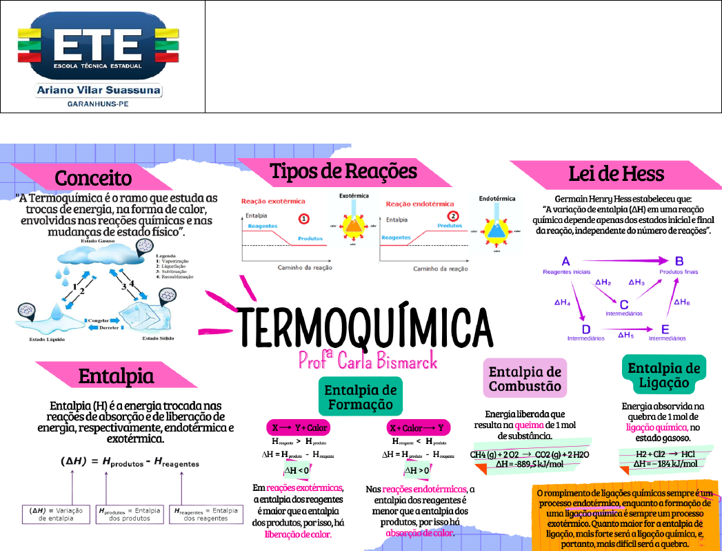 ESCOLA TÉCNICA ESTADUAL ARIANO SUASSUNA ALUNO(A): ______________________________ TURMA: ____________ FICHA TERMOQUÍMICA – 2º ANOS 1) Numa reação exotérmica, há [1] de calor, a entalpia final (produtos) é [2] que a entalpia inicial (reagentes) e a variação de entalpia é [3] que zero. Completa-se corretamente essa frase substituindo-se [1], [2] e [3], respectivamente, por: a) liberação, maior, maior. b) absorção , maior, menor. c) liberação, menor, menor. d) absorção, menor, maior. e) liberação, maior, menor. 2) (UNITAU) Nas pizzarias há cartazes dizendo "Forno à lenha". A reação que ocorre deste forno para assar a pizza é: a) explosiva. b) exotérmica. c) endotérmica. d) higroscópica. e) catalisada. 3) A “cal extinta” [Ca(OH)2] pode ser obtida pela reação entre óxido de cálcio (CaO) e a água, com consequente liberação de energia. O óxido de cálcio, ou “cal viva”, por sua vez, é obtido por forte aquecimento de carbonato de cálcio (CaCO3). As equações referentes às reações são: I. CaO + H2O → Ca(OH)2 + calor II. CaCO3 + calor → CaO + CO2 Identifique a afirmativa incorreta: a) A reação II é endotérmica. b) A reação II é uma reação de decomposição. c) A reação I é uma reação endotérmica. d) A reação total entre “a cal extinta” e o ácido sulfúrico (H2SO4) produz CaSO4 e água. e) A reação entre a “cal viva” e o ácido clorídrico (HCl) produz CaCl2 e água. 4) Considere os processos a seguir: I. Queima do carvão. II. Fusão do gelo à temperatura de 25°C. III. Combustão da madeira. a) apenas o primeiro é exotérmico. b) apenas o segundo é exotérmico. c) apenas o terceiro é exotérmico. d) apenas o primeiro é endotérmico. e) apenas o segundo é endotérmico. 5) (VUNESP 2005) – Considere a equação a seguir: 2 H2(g) + O2(g) → 2 H2O(l) ΔH = – 572 kJ É correto afirmar que a reação é: a) exotérmica, liberando 286 kJ por mol de oxigênio consumido. b) exotérmica, liberando 572 kJ para dois mols de água produzida. c) endotérmica, consumindo 572 kJ para dois mols de água produzida. d) endotérmica, liberando 572 kJ para dois mols de oxigênio consumido. e) endotérmica, consumindo 286 kJ por mol de água produzida. 6) (UEL-PR) Considere as seguintes entalpias de formação em kJ/mol: Aℓ2O3(s) = - 1670 e MgO(s) = - 604 Com essas informações, pode-se calcular a variação da entalpia da reação representada por 3 MgO(s) + 2 Aℓ(s) → 3 Mg(s) + Aℓ2O3(s) Seu valor é igual a a) - 1066 kJ b) - 142 kJ c) + 142 kJ d) + 1066 kJ e) + 2274 Kj 7) (PUCRS) Considere as informações a seguir e preencha corretamente as lacunas. A reação ocorrida na queima de um palito de fósforo deve-se a uma substância chamada trissulfeto de tetrafósforo, que inflama na presença de oxigênio, e pode ser representada pela equação: P4S3(s) + 8 O2(g) → P4O10(s) + 3 SO2(g). A quantidade de calor _________ na reação de combustão de 22 g de P4S3(s) é, aproximadamente, _________ kJ. a) liberado; 367,4 b) liberado; 338,4 c) absorvido; 3384 d) absorvido; 3674 e) liberado; 3674 8) (Puccamp - SP) Considere as seguintes equações termoquímicas: I. 3 O2(g) → 2 O3(g) ∆H1 = +284,6 kJ II. 1 C(grafita) + 1 O2(g)→ 1 CO2(g) ∆H2 = -393,3 kJ III. 1 C2H4(g) + 3 O2(g) → 2 CO2(g) + 2H2O(l) ∆H3 = - 1410,8 kJ IV. 1 C3H6(g) + 1 H2(g) → 1 C3HO8(g) ∆H4 = -123,8 kJ V. 1 I(g) → 1/2 I2(g) ∆H5 = -104,6 kJ Qual é a variação de entalpia que pode ser designada calor de formação ou calor de combustão? a) ∆H1. b) ∆H2. c) ∆H3. d) ∆H4. e) ∆H5. 9) Considere as reações abaixo e marque a alternativa que indica corretamente as reações endotérmicas: I. CH4(g) + 2 O2(g) → CO2(g) + H2O(l) + 889,5 kJ II. Fe2O3(s) +3 C(s) → 2 Fe(s) +3 CO(g) ΔH = + 490 kJ III. 6 CO2(g) + 6 H2O(l) + 2 813 → C6H12O6(g) + 6 O2(g) IV. HCl(aq) + NaOH(aq) → NaCl(aq) + H2O(l) ΔH = - 57,7 kJ V. 1 H2(g) + 1/2 O2(g) → 2 H2O(l) + 68,3 kcal VI. 1 H2(g) + 1 I2(g) → 2 HI(g) ΔH = + 25,96 kJ/mol a) II e III. b) I e IV. c) II, III e VI. d) I, IV e V. e) I, III e V. 10) (Enem 2016) O benzeno, um importante solvente para a indústria química, é obtido industrialmente pela destilação do petróleo. Contudo, também pode ser sintetizado pela trimerização do acetileno catalisada por ferro metálico sob altas temperaturas, conforme a equação química: 3 C2H2 → C6H6(l) A energia envolvida nesse processo pode ser calculada indiretamente pela variação de entalpia das reações de combustão das substâncias participantes, nas mesmas condições experimentais: I. C2H2(g) + 5/2O2(g) → 2CO2(g) + H2O(l) ∆Hco = –310 kcal/mol II. C6H6(l) + 15/2O2(g) → 6CO2(g) + 3H2O(l) ∆Hco = –780 kcal/mol A variação de entalpia do processo de trimerização, e kcal para a formação de um mol de benzeno é mais próxima de, a) 1.090. b) -150. c) -50. d) +157. e) +470
