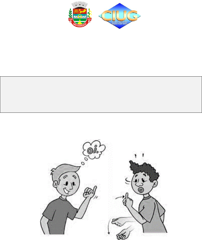 1 1 ESTADO DO RIO DE JANEIRO PREFEITURA MUNICIPAL DE SÃO GONÇALO SECRETARIA MUNICIPAL DE SÃO GONÇALO CENTRO INTERESCOLAR ULYSSES GUIMARÃES APOSTILA DE LIBRAS: NÍVEL INTERMEDIÁRIO ALUNO (A): __________________________________ TURMA: ____________________________________ 2 2 AULA 1 DATA: INTRODUÇÃO Quem são os Surdos e quem são os Ouvintes? Antes de continuarmos nossa caminhada para o aprendizado da Língua Brasileira de Sinais (Libras) é importantíssimo que compreendamos que os surdos são pessoas que se reconhecem pela ótica cultural e não medicalizada e que possuem uma organização política de vida em função de suas habilidades, neste caso a principal é a habilidade visual, o que gera hábitos também visuais e uma língua também visual. No entanto, a palavra – surdo – possui vários sentidos. O mais usado é aquele ligado à ideia de doença, de falta, de incapacidade, de deficiência. Nem todos os surdos se identificam como surdos há aqueles que ouvem pouco e/ou usam a oralidade identificando-se como deficientes auditivos, outros com o mesmo histórico preferem identificar-se como surdo, logo não se tem uma definição exata do termo. ANOTAÇÕES 3 3 Sistema de Transcrição para Libras Já sabemos que a Libras é uma língua viso-espacial, logo o melhor meio de reproduzi-la tem sido pelo registro de imagem (vídeo), a escrita da língua de sinais está ainda em fase de pesquisas e aceitação, no decorrer do curso você saberá mais sobre esta escrita. Sendo assim, para transcrever a libras utilizaremos um sistema de transcrição, que também é usado por pesquisadores, baseado numa forma de Glosa com palavras da língua portuguesa para representar aproximadamente enunciados da Libras. Aqui optamos apenas por algumas das convenções apresentadas por Felipe (2001), para maiores informações consulte a bibliografia: 1) Os sinais em Libras serão representados por uma glosa (sistema de anotação) da Língua Portuguesa em letras maiúsculas. Exemplos: TRABALHAR, QUERER, CASA ETC. 2) A datilologia (alfabeto manual) que é usada para expressar nome de pessoas, de localidades e outras palavras que não possuem um sinal, está representada pela palavra separada, letra por letra, por hífen. Exemplos: HOTEL I-T-A-G-U-A-Ç-U. 3) Na Libras não possui desinências para gênero (masculino e feminino). O sinal, representado por palavra da língua portuguesa que possui marcas de gênero, está terminado com o símbolo @ para reforçar a ideia de ausência e não haver confusão. Exemplos: EL@ (ela, ele), AMIG@ (amigo, amiga), FRI@ (frio, fria), MUIT@ (muito, muita). 4. Um SINAL que é traduzido por duas ou mais palavras em língua portuguesa, será representado pelas palavras correspondentes separadas por hífen. Exemplos: CORTAR-COM-FACA; QUERER-NÃO; GOSTAR-NÃO. 5. Um sinal composto, formado por dois ou mais sinais, que será representado por duas ou mais palavras, mas com a ideia de uma única coisa, serão separados pelo símbolo ^. 4 4 Exemplos: 6. Os traços não manuais: expressões facial e corporal, que são feitos simultaneamente com um sinal são representados por letra minúscula ao lado do respectivo sinal. Também são usadas para advérbio de modo e intensificador. Exemplos: NOME interrogativa; ADMIRAR exclamativa; ANDAR rapidamente. 7. Os verbos que possuem concordância de gênero (pessoa, coisa animal e veículo) que são representados por meio de classificadores são transcritos pelas letras CL. Exemplos: 8. Os verbos que possuem concordância número pessoal através de movimento direcionado são representados pela palavra correspondente com uma letra em subscrito que indicará as pessoas gramaticais. 5 5 Exemplos 1S, 2S, 3S = 1ª, 2ª e 3ª pessoas do singular; (1s DAR 2s) 1P, 2P, 3P = 1ª, 2ª e 3ª pessoas do plural; (1p DAR 3p) 9. As marcas de plural representadas pela repetição do sinal serão transcritas pela respectiva palavra seguida do símbolo +. Exemplos: Principais Características das Línguas de Sinais VISUALIDADE – A atenção do olhar Obviamente a atenção do olhar é imprescindível para comunicação com pessoas Surdas já que a língua de sinais é principalmente visual se você não olhar não entenderá o que estão dizendo. Então mesmo que você não saiba nada sobre a língua de sinais o olhar continua sendo o ponto principal de comunicação, poucas pessoas sabem como se comunicar com pessoas surdas, a grande maioria fala por trás ou de costas não mostrando sua expressão facial e com movimentos limitados do corpo. Assim, o primeiro passo para a comunicação com pessoas surdas é demonstrar pela expressão facial, pela fala pausada (sem exageros), pelo apontar e pela comunicação escrita o que se quer informar. É importante você saber também que nem todos os surdos fazem leitura labial assim como nem todos utilizam a língua de sinais para comunicação, cada um tem suas especificidades. Observe a figura abaixo e note ângulo do olhar quando se utiliza a Libras ou se pretende comunicar com pessoas surdas. 6 6 EXPRESSÕES FACIAIS OU NÃO-MANUAIS Observe as expressões faciais abaixo e dê significados para elas: Fonte: https://l1nq.com/DWuqK Expressões faciais são formas de comunicar algo, um sinal pode mudar completamente seu significado em função da expressão facial utilizada. Quadros e Pimenta (2006) explicam que existem dois tipos diferentes de expressões faciais: as afetivas e as gramaticais (lexicais e sentenciais). As afetivas são as expressões ligadas a sentimentos / emoções. Veja os exemplos: https://l1nq.com/DWuqK 7 7 As expressões faciais gramaticais lexicais estão ligadas ao grau dos adjetivos: Fonte: https://acesse.one/9zkZl As expressões faciais gramaticais sentenciais estão relacionadas às sentenças: https://acesse.one/9zkZl 8 8 ATIVIDADE 1: Crie 6 frases utilizando fiferentes expressões faciais e apresente em Libras. AULA 2 DATA: REVISÃO PARES MÍNIMOS NA LIBRAS As formas fonol