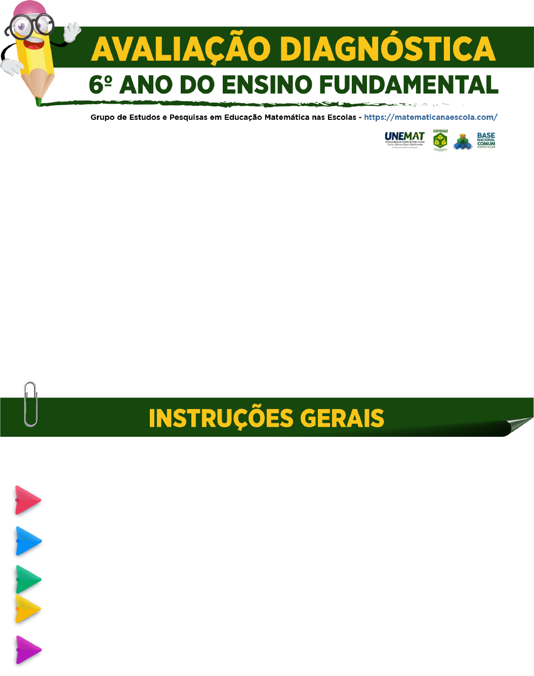 Caro (a) aluno (a), a sua participação na presente Avaliação Diagnóstica é muito importante para o nosso planejamento didático para garantir as suas aprendizagens essenciais em Matemática e Português. Você está recebendo um Caderno de Prova de Matemática e de Língua Portuguesa e uma Folha de Respostas. Comece preenchendo os campos abaixo: Nome da Escola: _____________________________________________________________ Nome Completo do (a) aluno (a): ________________________________________________ Turma: ( ) 6º A - ( ) 6º B - ( ) 6º C - ( ) 6º D - ( ) 6º E - ( ) 6º F Leia com atenção antes de responder e marque suas respostas neste caderno. Desejamos uma excelente Avaliação. Equipe Formadora GEPEME/UNEMAT A Avaliação Diagnóstica é composta por 30 questões de múltipla escolha, sendo 15 questões de Matemática e 15 questões de Língua Portuguesa; Cada questão tem uma única resposta correta. Faça um X na opção que você escolher como certa. Procure não deixar questão sem resposta. Você terá 3 horas para responder toda a Avaliação Diagnóstica Quando concluir a resolução das questões, transcreva suas marcações na Folha de Resposta (GABARITO), utilizando caneta de tinta azul ou preta. Muita Atenção ao Registrar as respostas no GABARITO. MATEMÁTICA Questão 1 - NÚMEROS Uma lanchonete apresenta o seguinte quadro de preços: Sobre os lanches oferecidos, podemos afirmar que: A) ( ) Há 8 maneiras de se comprar um lanche que contenha um sanduíche e um suco. B) ( ) A compra mais cara que pode ser feita nessa lanchonete irá sempre conter um açaí. C) ( ) A compra mais barata que pode ser feita nessa lanchonete irá sempre conter um pão com ovo. D) ( ) Há 56 maneiras de se comprar um lanche que contenha um sanduíche, um suco ou vitamina e um sorvete. Questão 2 - NÚMEROS Ayrton Senna da Silva, ou simplesmente Senna, foi um piloto de Fórmula 1 das décadas de 80 e 90 e o maior ídolo brasileiro do automobilismo. Nasceu em São Paulo, no dia 21 de março de 1960 e morreu de maneira trágica em 1º de maio de 1994, após colidir com uma mureta de proteção no Grande Prêmio de San Marino, em Ímola. Seu velório foi um dos mais marcantes da história do Brasil, durou cerca de 22 horas e foi acompanhado por aproximadamente 240 mil pessoas. Disponível em: <https://brasilescola.uol.com.br/biografia/airton-senna-silva.htm>. Acesso em: 17 abr. 2020. Números e títulos de Ayrton Senna na Fórmula 1 • 161 GPs disputados • 65 pole positions (primeira posição na largada) • 41 vitórias • 2.982 voltas na liderança • 19 voltas mais rápidas • 3 títulos Disponível em: <https://www.esportelandia.com.br/automobilismo/ayrton-senna/> . Acesso em: 17 abr. 2020. Das vitórias descritas acima, 12 delas Senna largou fora da pole position e 10 delas ele largou na pole position, porém sem ficar na liderança todo o tempo, caso tivesse ficado, seria chamada de vitória “de ponta a ponta”. Desta forma, quantas corridas Senna ganhou de ponta a ponta? A) ( ) 10 B) ( ) 12 C) ( ) 19 D) ( ) 29 Questão 3 - NÚMEROS Rodrigo realizou uma compra pela internet no valor de R$ 117,00 e pagou usando seu cartão de crédito. As opções disponíveis para parcelamento eram em até 10 vezes sem juros. Considerando que a opção escolhida por Rodrigo foi aquela em que as parcelas seriam números naturais, podemos afirmar que ele efetuou a compra em: A) ( ) 6 vezes B) ( ) 7 vezes C) ( ) 8 vezes D) ( ) 9 vezes Questão 4 - ÁLGEBRA Observe a imagem a seguir. Nela a balança está em equilíbrio e marca a massa total posta. Em seguida, marque a única opção correta. A) ( ) Dois cubos têm 240 g. B) ( ) Cada cilindro tem 140 g. C) ( ) Não é possível descobrir a massa dos cilindros. D) ( ) Cada cubo tem o dobro da massa de um cilindro. Questão 5 - ÁLGEBRA Para modelar alguns problemas, por exemplo, de computação precisamos saber usar a linguagem matemática. Usando a linguagem matemática, represente a frase e em seguida, determine o valor desconhecido. Três mais o dobro de um número desconhecido é igual a 17. A) ( ) 7 B) ( ) 8 C) ( ) 9 D) ( ) 10 Questão 6 - ÁLGEBRA Nas últimas férias, Luciana fez uma viagem de 965 km. Como a viagem era muito longa, parou para dormir em uma cidade no caminho após ter percorrido 3/5 de todo o percurso. A que distância fica essa cidade de seu destino final? A) ( ) 965 km B) ( ) 579 km C) ( ) 386 km D) ( ) 65 km Questão 7 – GEOMETRIA A imagem a seguir é um recorte do Google Maps e mostra o bairro de Campo Grande, em Santos, SP. Observe o mapa e marque V para as alternativas verdadeiras e F para as falsas. ( ) As avenidas Ana Costa e General Francisco Glicério são perpendiculares. ( ) As ruas Carlos Gomes e Ministro Xavier de Tolêdo são paralelas. ( ) A rua Visconde de Farias é paralela à avenida Ana Costa. ( ) As ruas Carlos Gomes e Visconde de Farias são perpendiculares. A) ( ) F - V - V - V B) ( ) F - V - F - V C) ( ) V - V - V - F D) ( ) V - V - F - V Questão 8 - GEOMETRIA Valentina irá ajudar sua mãe a forrar o chão de seu quarto com tatames de borracha do tipo EVA. Os tatames possuem a forma de quadrados de lado 50 cm. Observe a forma e as medidas do quarto na imagem a seguir. Lembrando que onde eles não encaixam devem ser cortados de maneira que passem a caber, quantos tatames a mãe de Valentina precisa comprar para forrar o chão adequadamente? A) ( ) 15 tatames B) ( ) 30 tatames C) ( ) 45 tatames D) ( ) 56 tatames Questão 9 - GEOMETRIA Observe a disposição de alguns estabelecimentos de uma determinada cidade. Ao sair da escola em direção a sua casa, um aluno opta pelo seguinte caminho: anda por 3 quadras para o Leste, 2 para o Norte, 5 para o Oeste, 2 para o Sul e por fim, 1 quadra para o Oeste. Assim, ele terá passado por: A) ( ) Veterinária, Chaveiro e Padaria. B) ( ) Farmácia, Floresta e Praça. C) ( ) Hospital, Chaveiro e Sorveteria. D) ( ) Chaveiro, Sorveteria e Praça. Questão 10 