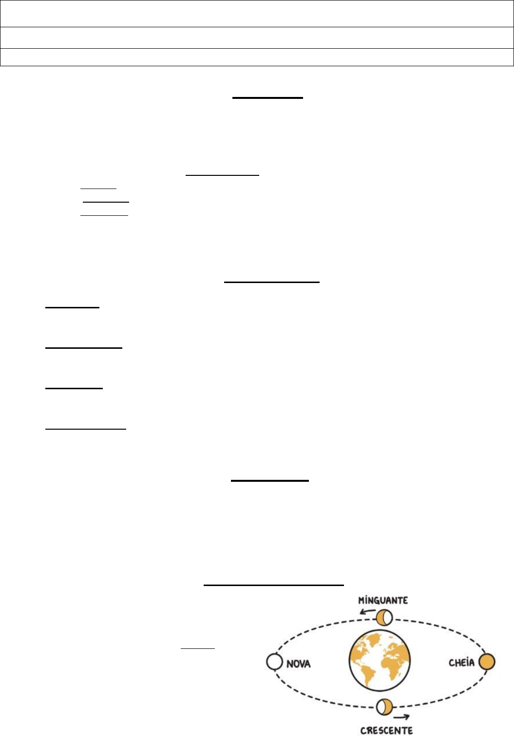 ATIVIDADE DE CIÊNCIAS – 3° Bimestre NOME: DATA: TURMA: Fases da Lua As fases da Lua representam os diferentes aspectos que vemos o satélite natural da Terra ao longo de um ciclo. Isso acontece em virtude da variação da sua posição em relação ao nosso planeta e ao Sol. A Lua apresenta quatro fases: nova, crescente, cheia e minguante. Cada uma delas dura cerca de 7 a 8 dias. Não sendo uma estrela, a Lua não emite luz própria. Entretanto, a vemos iluminada pois ela reflete a luz proveniente do Sol. A Lua apresenta três movimentos principais: · Rotação: em torno do seu próprio eixo · Revolução: ao redor da Terra · Translação: ao redor do Sol, junto com a Terra. Desta forma, assume diferentes posições em relação a Terra e ao Sol. Isso faz com que sua parte iluminada seja vista de diferentes formas ao longo de um ciclo lunar. Importante notar que as fases da lua são vistas de maneiras diferentes nos hemisférios sul e norte. As 4 fases da Lua 1. Lua Nova nesta fase, não conseguimos observar a Lua pois ela está posicionada entre o Sol e a Terra e, por isso, não a vemos neste momento. Nesta fase, a Lua está no céu durante o dia, nascendo por volta das 6 horas e se pondo por volta das 18 horas. 2. Lua Crescente ou quarto crescente recebe esta denominação pois neste momento só conseguimos observar ¼ de sua totalidade. Seu formato é de um semicírculo e, nesta fase, a Lua nasce aproximadamente ao meio-dia e se põe aproximadamente à meia-noite. 3. Lua Cheia nesta fase, a Terra está entre o Sol e a Lua e, portanto, conseguimos observar a totalidade do satélite iluminado integralmente pelo Sol. Nesta fase, a Lua nasce aproximadamente às 18 horas e se põe aproximadamente às 6 horas do dia seguinte. 4. Lua Minguante ou quarto minguante é o último estágio das fases da Lua. Neste período, ela encontra-se no formato de um semicírculo e assim, novamente conseguimos observar ¼ de sua totalidade no sentido oposto da fase crescente. Nesta fase, a Lua nasce aproximadamente à meia-noite e se põe aproximadamente ao meio-dia. O ciclo da Lua O Ciclo da Lua ou Ciclo de Lunação, chamada também de Período Sinódico da Lua, ocorre em aproximadamente 29,5 dias. É, portanto, conhecido como mês lunar e durante este período as 4 fases da Lua acontecem, ou seja, ocorre o ciclo lunar completo. Já no Período Sideral o tempo que a Lua leva para girar em torno do seu eixo (rotação) é de 27,3 dias e esse também é o tempo que ela leva para orbitar em volta da Terra (revolução). Portanto, o mês sideral é considerado aproximadamente 2,25 dias mais curto do que o mês sinódico. Curiosidades sobre a Lua A “Super Lua” ou “Super Lua Cheia” é caracterizada pelo momento em que a Lua cheia está mais próxima da Terra. Neste momento, ela aparece maior e mais brilhante. Os eclipses são fenômenos que ocorrem quando o Sol, a Terra e Lua estão alinhados. Os Eclipses Solares ocorrem durante a Lua nova, quando a Lua está entre a Terra e o Sol. Já os Eclipses Lunares ocorrem durante a Lua cheia, quando a Terra está entre a Lua e o Sol. ( 1 ) ATIVIDADES 1) Há um fenômeno celeste que ocorre quando a Lua penetra, totalmente ou parcialmente, no cone de sombra projetado pela Terra, em geral, sendo visível a olho nu. Isto ocorre sempre que o Sol, a Terra e a Lua se encontram próximos ou em perfeito alinhamento, estando a Terra no meio destes outros dois corpos. O texto indica que ocorreu um fenômeno, que fenômeno é esse? a) Estrela cadente b) Eclipse c) Nascer da Lua 2) Sobre os movimentos da Lua, relacione a segunda coluna de acordo com a primeira e assinale a sequência correta: A – Rotação ( ) Movimento que a Lua realiza ao redor do Sol. B – Revolução ( ) Movimento que a Lua realiza ao redor da Terra. C – Translação ( ) Movimento que a Lua realiza ao redor do seu próprio eixo. 3) Cite a fase da lua e desenhe o seu formato: 4) Cite a fase da lua e desenhe o seu formato: Como a Lua e os astros afetam a vida na Terra? Devido a gravidade da lua, ela exerce influência direta na Terra. A força gravitacional do satélite é capaz de mover grandes massas de água, de acordo com a alteração de suas fases. Isso provoca as marés altas ou baixas dos oceanos. Quanto a agricultura, a influência da Lua sobre as plantas é de conhecimento dos agricultores desde a antiguidade. Por exemplo, já vem de milênios, na China, o conhecimento sobre o corte do bambu, que deve ser realizado entre lua minguante e a nova, que é quando a seiva e umidade dentro dos troncos é menor. Para muitos animais, principalmente pássaros, a Lua é essencial para a migração e a navegação. Já outros, sua reprodução coincide com as fases específicas do ciclo lunar. No caso dos predadores, por exemplo, a lua cheia atrapalha, pois traz mais luminosidade para a noite, dificultando à caçada. A Lua ainda também desempenha um papel fundamental. Sua presença estabiliza a Terra que, se não tivesse um satélite tão grande, dançaria como um pião a ponto de cair. Ao contrário do que diz inúmeras crenças, a Lua não possui influência direta no corpo humano. Não há evidências cientificas que apontem que cortar o cabelo em determinada fase, faça este crescer mais rápido ou mais devagar. Os astros que vemos no céu influenciam sobre a vida na Terra, ainda que não do modo que sugerem os horóscopos. Mas o Sol é a presença central, é fonte da energia que permite a existência de seres vivos em nosso planeta. Atividades 1) Entre as influências que a Lua – o satélite natural da Terra – exerce sobre o nosso planeta, podemos assinalar: a) Variações no índice de reflexão dos raios solares b) Oscilações no regime das marés c) Elevação ou interrupção das atividades vulcânicas 2) Complete com as palavras: SOL ou LUA: a) provoca as marés altas ou baixas dos oceanos. b) é fonte da energia que permite a existência de seres vivos. c) estabiliza a Terra. d)