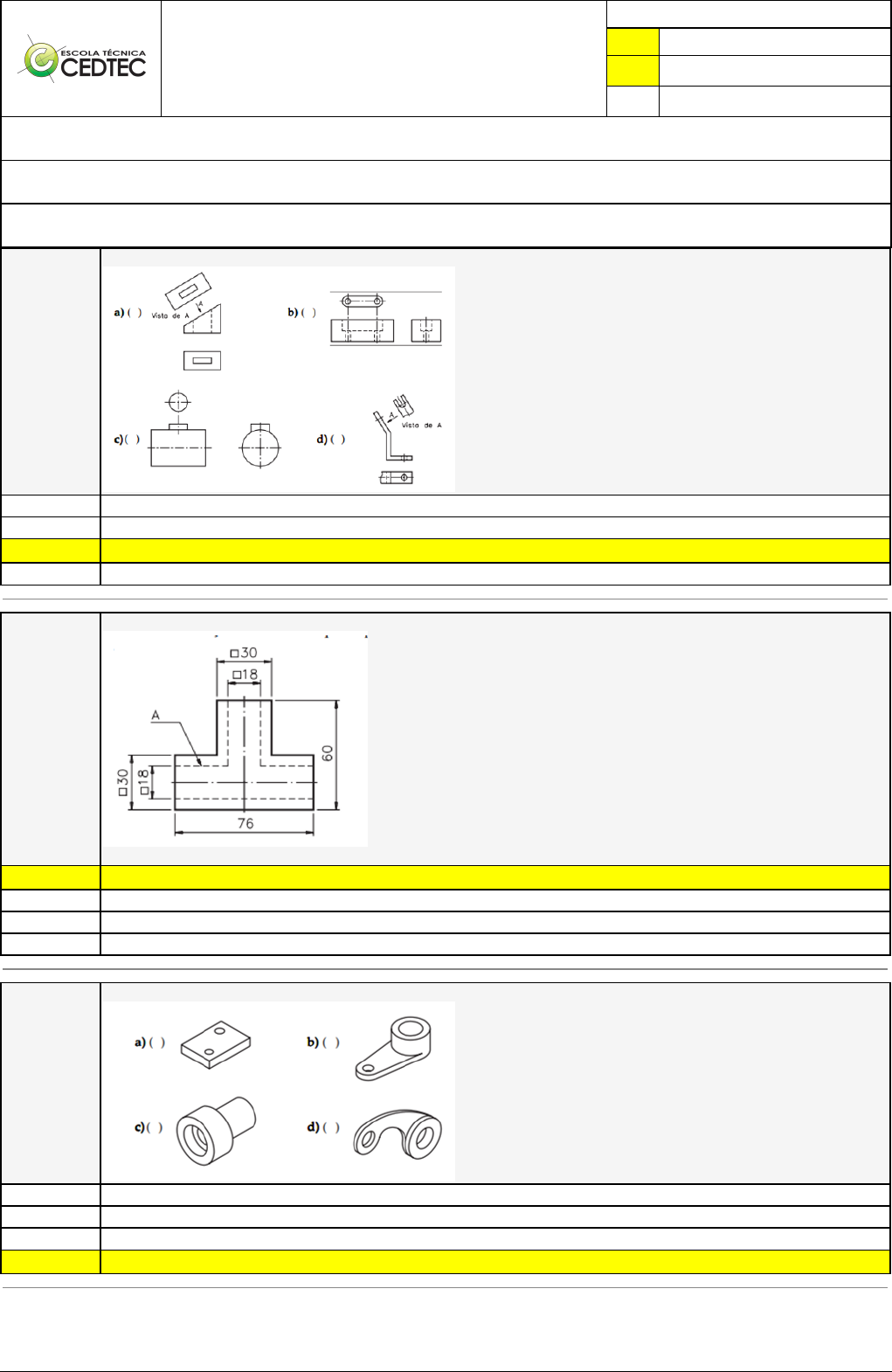 Pincel Atômico - 24/07/2024 19:42:27 1/2 Exercício Caminho do Conhecimento - Etapa 8 (640) Atividade finalizada em 24/07/2024 19:42:19 (1845471 / 1) LEGENDA Resposta correta na questão # Resposta correta - Questão Anulada X Resposta selecionada pelo Aluno Disciplina: DESENHO MECÂNICO [1058766] - Avaliação com 4 questões, com o peso total de 6,50 pontos [capítulos - 113] Turma: Curso Técnico: Mecânica - Grupo: EAD - 03/24 - EAD MEC [116680] Aluno(a): 91591960 - ALESSANDRO VIANA DE SOUZA - Respondeu 4 questões corretas, obtendo um total de 6,50 pontos como nota [350246_54805] Questão 001 Marque com um X a alternativa que indica desenhos com vistas auxiliares: b e c a e c X a e d b e d [350247_54807] Questão 002 Analise o desenho abaixo e marque as cotas que respondem corretamente as perguntas: Marque a alternativa que indica as cotas nos valores e na ordem correta. X 76 – 76 - 18 60 – 76 - 18 76 – 18 - 60 76 – 60 - 18 [350246_54795] Questão 003 Assinale com um X as duas peças que podem ser representadas com vistas parciais (meia vista ou ¼ de vista): a e b a e d c e d X b e c Pincel Atômico - 24/07/2024 19:42:27 2/2 [350247_54796] Questão 004 Analise o desenho abaixo e marque um X no recurso utilizado no sistema de cotagem: Detalhe ampliado X Encurtamento Vista auxiliar Meia vista
