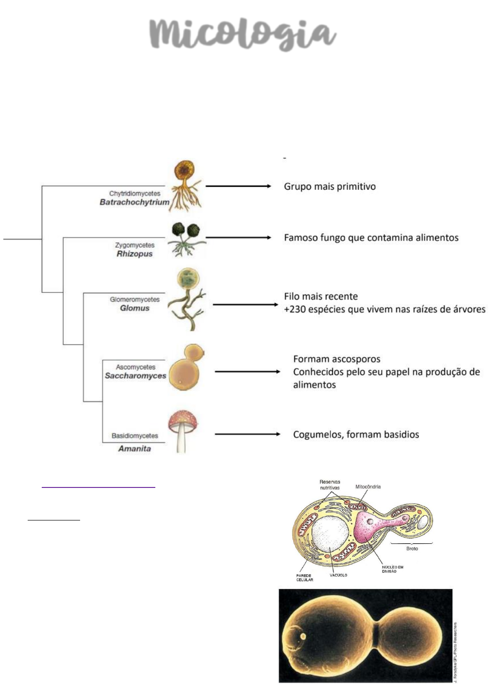 Micologia Fungos -> microrganismos presentes em todos os lugares (maioria terrestre) Habitam o solo ou matéria vegetal morta e desempenham um papel crucial na mineralização do carbono orgânico São parasitas de plantas ou podem causar diversas doenças em animais. Única levedura ➢ Tipos de fungos Levedura Unicelular Formato oval Incolor e lisa Comum no meio-ambiente Reprodução por brotamento Metabolismo: fermentação alcoolica Converte carboidratos em álcool Utilizados na indústria alimentícia Levedura comum de padaria e de cerveja Saccharomyces cereviseae (ascomiceto) Bolores Pluricelular Contem filamentos Podem ser coloridos Encontrados em áreas úmidas, escuras e cheias de vapor Reprodução por meio sexuado ou assexuado Metabolismo: detritívoros (degrada os detritos em matéria orgânica menor) Secretam enzimas hidrolíticas para a fonte de alimento externa e absorvem nutrientes Utilizados na indústria alimentícia para produção de queijos ➢ Filamentos Hifas Conidióforo Conídios ou Hifas Esporângio Hifas: rede de filamentos onde os esporos assexuados são produzidos São paredes celulares tubulares que envolvem a membrana citoplasmática Pode ser septada ou não Septos – paredes transversais perfuradas por um poro que permite a comunicação entre as células, garantindo a passagem até mesmo de organelas celulares. Hifas asseptadas -> cenocíticas Micélio -> conjunto de hifas Micélio reprodutivo ou vegetativo Hifas aéreas ou micélio reprodutivo, produzem dentro do esporângio, suas estruturas reprodutivas chamadas de esporos Conídios: São esporos assexuados, presentes apenas em bolores de hifas septadas e podem ter pigmento negro, verde, vermelho, amarelo ou marrom ➢ Reprodução Reprodução assexuada DNA sempre é o mesmo Fragmentação das hifas existentes Sem variabilidade genetica Hifas asseptadas e septadas Asseptadas: produzem esporos assexuados endógenos armazenados no esporângios. Septadas: produzem esporos assexuados exógenos chamados conídios, a partir de uma célula conidiogênica. Reprodução Sexuada Com mistura de DNA Fusão de duas hifas Maior variabilidade genetica Basidiosporos são os zigosporos de cogumelos Fungos haplóides (n) de polo + e - , fundem suas hifas através do processo de plasmogamia formando uma hifa com células dicarióticas. A partir da plasmogamia, são formadas corpos de frutificação (cogumelos em basidiomicetos e ascocarpos em ascomicetos). Nos corpos de frutificação ocorre a cariogamia, a fusão dos dois núcleos formando uma célula diplóide (2n). Depois passam por uma divisão meiótica, formando as estruturas características dos filos. No interior das estruturas reprodutivas são formados os esporos. Após a maturação dos esporos, as estruturas de frutificação os liberam no ambiente para darem origem a novos indivíduos, dessa vez com variabilidade genética. FUNGO + RAIZ = MICORRIZAS Elas não aumentam o teor de nutrientes no solo, mas elas permitem que a planta explore melhor as suas reservas. Os filamentos dos fungos se enrolam e penetram-se nas raízes onde se nutrem de substâncias produzidas pelo vegetal e o fungo facilita a absorção de minerais do solo pela planta. Os fungos são muito importantes no equilíbrio dos ecossistemas pois participam da reciclagem da matéria orgânica, fazendo a decomposição das mesmas. Portanto, eles ocupam o último nível trófico nas cadeias alimentares, atuando como decompositores. ➢ Biologia celular: células eucariontes fúngicas Parede Celular • Quitina – polissacarídeos • Glucanas • Mananas • Proteínas • Melanina • Glicosaminoglicanas • Galactomananas • Cápsula Função: • Rigidez • Transporte de moléculas • Controle osmótico • Composição variada – diferenciação do sistema imune Cápsula Algumas espécies são recobertas por uma cápsula de polissacarídeos (GXM e GalXM) Maioria causadores de doenças Proteção contra o sistema imune Proteção contra agentes químicos As vesículas de secreção são capazes de atravessar Melanina Pigmento Presente por dentro da parede celular Permeabilidade muito seletiva A síntese de melanina é dependente do aminoácido precursor da classe das catecolaminas: L-DOPA Resistência à: fotoproteção – raios UV antibacteriana antioxidante – protege dos radicais livres antirradiação – radiação biossorvente – captura de metais pesados Apresenta L-DOPA -> dopamina -> neurotransmissor que causa o efeito alucinógenos Esterol exclusivo de fungos: ergosterol Aplicações Biotecnológicas ➢ Fermentação Alcóolica Principal produção de biomoléculas • Ácidos graxos -> aroma • Aminoácidos -> reduz a contaminação • Vitaminas - > aumento do valor nutricional • Álcoois -> aumento da vida útil ➢ Fungos Filamentosos Contém macro e micromoléculas Utilizados na: Indústria Farmacêutica Agricultura Biodegradação de Poluentes Enzimas Alimentos A produção de cerveja, vinho, cachaça, sidra... se diferencia pelo açúcar Micromoléculas Metabólitos secundários – eliminados pela célula Produtos naturais Baixo peso molecular Estrutura química variável Descoberta da Penicilina em 1928 – antibióticos produzidos a partir de fungos Macromoléculas Enzimas Polissacarídeos • Terpenos • Ácidos Graxos • Heterocíclicos – anéis de carbono • Policetídeos Espessantes Geleificantes Emulsificantes Ação antitumoral, antiviral, anti-inflamatória, hipoglicêmica e imunoestimulante 1/3 dos produtos naturais Vitaminas Hormônios Antibióticos Alcaloides Herbicidas Corantes ➢ Fungos Patogênicos Parede celular espessa para fisicamente afastar as células imunológicas Melanina contribui para infecção fúngica -> aumentam a capacidade de virulência destes organismos -> importante no primeiro contato Doença ≠ Infecção Infecção: invasão do corpo por microrganismos patogênicos. Doença: ocorre quando uma infecção resulta em qualquer