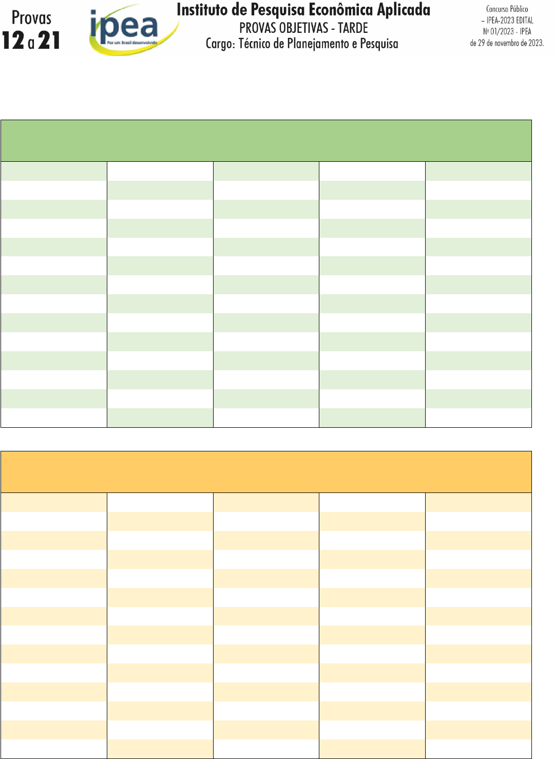 PROVAS APLICADAS EM 25 DE FEVEREIRO DE 2024 ALTERADO 12 DE MARÇO DE 2024 Prova 12 Perfil I – Planejamento, Gestão e Logística Especialidade: GESTÃO E LOGÍSTICA 1 - A 2 - D 3 - B 4 - B 5 - D 6 - C 7 - E 8 - A 9 - C 10 - D 11 - B 12 - A 13 - E 14 - E 15 - C 16 - A 17 - D 18 - A 19 - C 20 - B 21 - B 22 - E 23 - A 24 - E 25 - E 26 - E 27 - B 28 - D 29 - B 30 - B 31 - D 32 - E 33 - E 34 - C 35 - B 36 - C 37 - D 38 - A 39 - A 40 - E 41 - C 42 - B 43 - D 44 - B 45 - E 46 - D 47 - A 48 - A 49 - E 50 - C 51 - C 52 - D 53 - D 54 - A 55 - B 56 - C 57 - D 58 - A 59 - D 60 - C 61 - D 62 - C 63 - B 64 - E 65 - B 66 - A 67 - E 68 - D 69 - B 70 - E Prova 13 Perfil II – Planejamento e Gestão do Conhecimento e de Dados Especialidade: PROCESSO EDITORIAL 1 - A 2 - A 3 - C 4 - E 5 - D 6 - A 7 - B 8 - B 9 - A 10 - C 11 - B 12 - D 13 - B 14 - A 15 - E 16 - E 17 - A 18 - C 19 - C 20 - E 21 - B 22 - B 23 - E 24 - A 25 - D 26 - C 27 - B 28 - C 29 - A 30 - A 31 - B 32 - D 33 - C 34 - A 35 - B 36 - D 37 - C 38 - B 39 - E 40 - A 41 - C 42 - D 43 - E 44 - B 45 - C 46 - B 47 - D 48 - E 49 - B 50 - C 51 - C 52 - E 53 - D 54 - E 55 - B 56 - D 57 - C 58 - B 59 - E 60 - C 61 - C 62 - E 63 - A 64 - D 65 - D 66 - B 67 - D 68 - E 69 - A 70 - A PROVAS APLICADAS EM 25 DE FEVEREIRO DE 2024 ALTERADO 12 DE MARÇO DE 2024 Prova 14 Perfil II – Planejamento e Gestão do Conhecimento e de Dados Especialidade: COMUNICAÇÃO SOCIAL E DIVULGAÇÃO CIENTÍFICA 1 - D 2 - E 3 - A 4 - A 5 - A 6 - B 7 - A 8 - C 9 - E 10 - E 11 - A 12 - B 13 - B 14 - B 15 - Anulada 16 - C 17 - B 18 - E 19 - A 20 - C 21 - E 22 - D 23 - E 24 - E 25 - B 26 - C 27 - D 28 - C 29 - E 30 - D 31 - E 32 - A 33 - B 34 - B 35 - B 36 - A 37 - D 38 - D 39 - E 40 - D 41 - C 42 - A 43 - E 44 - E 45 - A 46 - A 47 - D 48 - C 49 - D 50 - B 51 - C 52 - B 53 - A 54 - B 55 - D 56 - B 57 - C 58 - E 59 - C 60 - A 61 - D 62 - E 63 - A 64 - D 65 - C 66 - A 67 - E 68 - D 69 - B 70 - C Prova 15 Perfil II – Planejamento e Gestão do Conhecimento e de Dados Especialidade: CIÊNCIA DE DADOS 1 - E 2 - C 3 - D 4 - B 5 - D 6 - D 7 - C 8 - D 9 - A 10 - E 11 - A 12 - D 13 - B 14 - E 15 - C 16 - A 17 - E 18 - E 19 - A 20 - A 21 - D 22 - B 23 - A 24 - E 25 - A 26 - C 27 - A 28 - C 29 - E 30 - D 31 - D 32 - E 33 - B 34 - B 35 - C 36 - E 37 - E 38 - B 39 - D 40 - C 41 - D 42 - B 43 - C 44 - A 45 - E 46 - D 47 - E 48 - C 49 - C 50 - B 51 - D 52 - A 53 - B 54 - E 55 - B 56 - B 57 - C 58 - B 59 - C 60 - A 61 - C 62 - E 63 - D 64 - E 65 - C 66 - A 67 - D 68 - C 69 - E 70 - A PROVAS APLICADAS EM 25 DE FEVEREIRO DE 2024 ALTERADO 12 DE MARÇO DE 2024 Prova 16 Perfil II – Planejamento e Gestão do Conhecimento e de Dados Especialidade: INFRAESTRUTURA DE TECNOLOGIA DA INFORMAÇÃO 1 - D 2 - E 3 - E 4 - E 5 - C 6 - A 7 - E 8 - C 9 - E 10 - B 11 - A 12 - A 13 - C 14 - D 15 - D 16 - C 17 - B 18 - E 19 - E 20 - A 21 - D 22 - D 23 - D 24 - B 25 - B 26 - A 27 - E 28 - C 29 - A 30 - C 31 - E 32 - B 33 - C 34 - E 35 - C 36 - D 37 - B 38 - C 39 - D 40 - E 41 - A 42 - D 43 - E 44 - E 45 - A 46 - B 47 - B 48 - E 49 - A 50 - D 51 - C 52 - D 53 - B 54 - C 55 - B 56 - D 57 - E 58 - E 59 - A 60 - D 61 - A 62 - D 63 - B 64 - A 65 - C 66 - E 67 - A 68 - E 69 - C 70 - D Prova 17 Perfil II – Planejamento e Gestão do Conhecimento e de Dados Especialidade: DESENVOLVIMENTO DE SISTEMAS 1 - D 2 - E 3 - E 4 - E 5 - C 6 - A 7 - E 8 - C 9 - E 10 - B 11 - A 12 - D 13 - E 14 - D 15 - B 16 - A 17 - D 18 - A 19 - C 20 - B 21 - B 22 - D 23 - D 24 - A 25 - C 26 - E 27 - E 28 - C 29 - B 30 - E 31 - C 32 - E 33 - E 34 - D 35 - E 36 - D 37 - C 38 - E 39 - D 40 - E 41 - A 42 - C 43 - C 44 - A 45 - B 46 - B 47 - A 48 - E 49 - A 50 - E 51 - D 52 - E 53 - C 54 - B 55 - A 56 - B 57 - A 58 - A 59 - B 60 - D 61 - D 62 - B 63 - E 64 - D 65 - B 66 - C 67 - A 68 - E 69 - A 70 - D PROVAS APLICADAS EM 25 DE FEVEREIRO DE 2024 ALTERADO 12 DE MARÇO DE 2024 Prova 18 Perfil III – Planejamento, Pesquisa e Avaliação de Políticas Públicas e da Gestão Governamental Especialidade: POLÍTICAS PÚBLICAS E DESENVOLVIMENTO 1 - E 2 - E 3 - E 4 - B 5 - E 6 - E 7 - A 8 - C 9 - B 10 - D 11 - C 12 - A 13 - B 14 - B 15 - C 16 - E 17 - C 18 - A 19 - C 20 - D 21 - B 22 - D 23 - C 24 - C 25 - D 26 - D 27 - E 28 - E 29 - E 30 - B 31 - C 32 - E 33 - B 34 - E 35 - E 36 - E 37 - A 38 - A 39 - C 40 - D 41 - B 42 - A 43 - B 44 - D 45 - D 46 - A 47 - A 48 - E 49 - E 50 - D 51 - A 52 - A 53 - C 54 - B 55 - E 56 - C 57 - D 58 - D 59 - E 60 - E 61 - B 62 - D 63 - A 64 - C 65 - C 66 - C 67 - D 68 - E 69 - A 70 - C Prova 19 Perfil III – Planejamento, Pesquisa e Avaliação de Políticas Públicas e da Gestão Governamental Especialidade: POLÍTICAS PÚBLICAS E SOCIEDADE 1 - E 2 - E 3 - E 4 - B 5 - E 6 - E 7 - A 8 - C 9 - B 10 - D 11 - C 12 - A 13 - B 14 - B 15 - C 16 - E 17 - C 18 - A 19 - C 20 - D 21 - A 22 - A 23 - B 24 - B 25 - E 26 - E 27 - C 28 - B 29 - C 30 - C 31 - A 32 - D 33 - E 34 - C 35 - D 36 - E 37 - B 38 - D 39 - C 40 - E 41 - A 42 - D 43 - A 44 - C 45 - C 46 - E 47 - B 48 - A 49 - A 50 - C 51 - D 52 - B 53 - E 54 - B 55 - B 56 - E 57 - E 58 - C 59 - D 60 - C 61 - D 62 - B 63 - B 64 - B 65 - D 66 - C 67 - E 68 - D 69 - E 70 - A PROVAS APLICADAS EM 25 DE FEVEREIRO DE 2024 ALTERADO 12 DE MARÇO DE 2024 Prova 20 Perfil III – Planejamento, Pesquisa e Avaliação de Políticas Públicas e da Gestão Governamental Especialidade: POLÍTICAS PÚBLICAS E AVALIAÇÃO 1 - E 2 - E 3 - E 4 - B 5 - E 6 - E 7 - A 8 - C 9 - B 10 - D 11 - C 12 - A 13 - B 14 - B 15 - C 16 - E 17 - C 18 - A 19 - E 20 - C 21 - A 22 - E 23 - E 24 - E 25 - B 26 - B 27 - C 28 - A 29 - D 30 - D 31 - D 32 - A 33 - E 34 - B 35 - C 36 - C 37 - B 38 - A 39 - A 40 - B 41 - D 42 - C 43 - A 44 - E 45 - D 46 - C 47 - C 48 - C 49 - D 50 - A 51 - A 52 - B 53 - E 54 - D 55 - D 56 - B 57 - E 58 - D 59 - C 60 - D 61 - D 62 - A 63 - E 64 - B 65 - A 66 - C 67 - D 68 - B 69 - E 70 - C Prova 21 Perfil III – Planejamento, Pesquisa e Avaliação de Políticas Públicas e da Gestão Governamental Espe