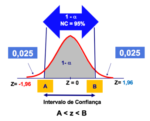 1 - a NC = 95% 0,025 0,025 Z= -1,96 Z = 0 Z= 1,96 A B Intervalo de Confiança A<z<B