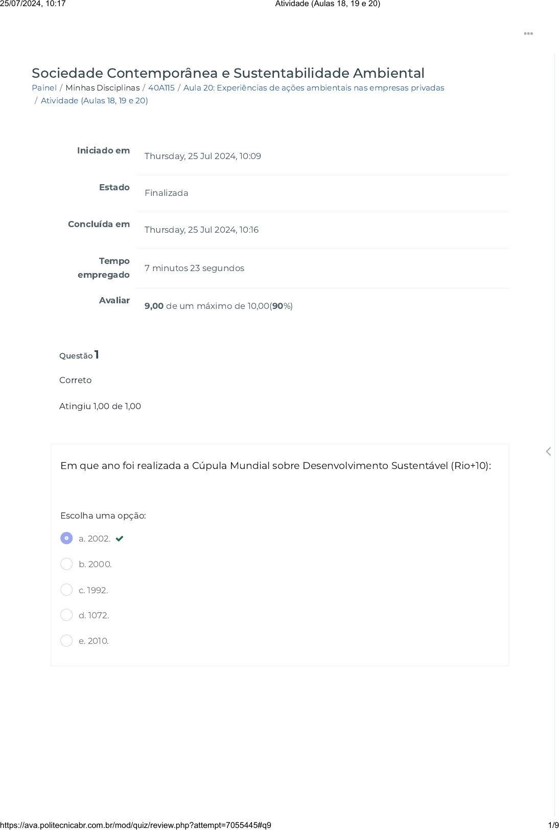 Painel / Minhas Disciplinas / 40A115 / Aula 20: Experiências de ações ambientais nas empresas privadas / Atividade (Aulas 18, 19 e 20) Sociedade Contemporânea e Sustentabilidade Ambiental Iniciado em Thursday, 25 Jul 2024, 10:09 Estado Finalizada Concluída em Thursday, 25 Jul 2024, 10:16 Tempo empregado 7 minutos 23 segundos Avaliar 9,00 de um máximo de 10,00(90%) Questão 1 Correto Atingiu 1,00 de 1,00 Em que ano foi realizada a Cúpula Mundial sobre Desenvolvimento Sustentável (Rio+10): Escolha uma opção: a. 2002. b. 2000. c. 1992. d. 1072. e. 2010. 25/07/2024, 10:17 Atividade (Aulas 18, 19 e 20) https://ava.politecnicabr.com.br/mod/quiz/review.php?attempt=7055445#q9 1/9 https://ava.politecnicabr.com.br/my/ https://ava.politecnicabr.com.br/my/ https://ava.politecnicabr.com.br/course/view.php?id=1057 https://ava.politecnicabr.com.br/course/view.php?id=1057#section-22 https://ava.politecnicabr.com.br/mod/quiz/view.php?id=33463 https://ava.politecnicabr.com.br/ Questão 2 Correto Atingiu 1,00 de 1,00 Trata-se de um acordo internacional que estabeleceu metas de redução de gases poluentes para os países industrializados. Escolha uma opção: a. Projeto do Milênio b. Relatório Brundtland. c. Plano de discussão sobre sustentabilidade da ONU. d. Protocolo de Kyoto. 25/07/2024, 10:17 Atividade (Aulas 18, 19 e 20) https://ava.politecnicabr.com.br/mod/quiz/review.php?attempt=7055445#q9 2/9 https://ava.politecnicabr.com.br/ Questão 3 Correto Atingiu 1,00 de 1,00 Assinale (V) Verdadeiro ou (F) Falso: ( ) de acordo com Relatório Brundtland a de�nição de desenvolvimento sustentável não diz respeito apenas ao impacto da atividade econômica no meio ambiente. Refere principalmente às consequências dessa relação na qualidade de vida e no bem-estar da sociedade, tanto presente quanto futura. ( ) o relatório de Brundtland propõe que a busca por um desenvolvimento sustentável requer um sistema administrativo �exível e capaz de corrigir-se. ( ) a Conferência sobre o Meio Ambiente ocorreu em Estocolmo, no ano de 1970 ( ) de acordo com a autora Nadja Janke os problemas ambientais se traduzem globalmente, é preciso que sejam estruturadas soluções também globais, pensadas de forma democrática, tentando atender também às necessidades locais. Escolha uma opção: a. V, V, F, V. b. V, V, V, V. c. F, V, V, F. d. V, V, F, F. e. F, F, F, V. 25/07/2024, 10:17 Atividade (Aulas 18, 19 e 20) https://ava.politecnicabr.com.br/mod/quiz/review.php?attempt=7055445#q9 3/9 https://ava.politecnicabr.com.br/ Questão 4 Correto Atingiu 1,00 de 1,00 Que documento trata de forma complexa a questão da sustentabilidade, propondo diretrizes para todas as áreas, inclusive a adoção de uma Educação Ambiental voltada para o desenvolvimento sustentável. Escolha uma opção: Questão 5 Correto Atingiu 1,00 de 1,00 Assinale a alternativa que não corresponde ao que propõe o sistema do relatório Brundtland: Escolha uma opção: a. Relatório Brundtland b. Protocolo de Kyoto c. Cúpula Mundial sobre Desenvolvimento Sustentável d. Agenda 21 a. Tecnológico que busque novas soluções. b. Político que assegure resolver as desigualdades. c. Produção baseado na conservação. d. Econômico capaz de gerar excedentes e técnicas e�cazes. 25/07/2024, 10:17 Atividade (Aulas 18, 19 e 20) https://ava.politecnicabr.com.br/mod/quiz/review.php?attempt=7055445#q9 4/9 https://ava.politecnicabr.com.br/ Questão 6 Correto Atingiu 1,00 de 1,00 Qual evento ocorreu no ano de 1972 relacionado as questões da sustentabilidade no qual foi apresentado 27 princípios relativos à ação do homem frente à natureza. Escolha uma opção: a. Nenhuma das alternativas. b. Eco 92, no Rio de Janeiro. c. Conferência sobre o Meio Ambiente, em Estocolmo na Suécia. d. Relatório Brundtland, |O nosso futuro comum. e. Agenda 21. 25/07/2024, 10:17 Atividade (Aulas 18, 19 e 20) https://ava.politecnicabr.com.br/mod/quiz/review.php?attempt=7055445#q9 5/9 https://ava.politecnicabr.com.br/ Questão 7 Incorreto Atingiu 0,00 de 1,00 Ao se tratar dos exemplos relacionados as ONGs na área socioambiental assinale (V) Verdadeiro e (F) Falso: ( ) As ONGs são particularmente importantes no que se refere ao enfrentamento dos problemas ambientais e o número delas aumenta gradativamente. Muitas vezes, elas recebem o apoio de empresas, de órgãos públicos, �rmando parcerias em projetos em todas as áreas. ( ) O projeto Sementes do Futuro, tem como intensão contribuir para a melhoria da qualidade do solo nas comunidades rurais do município de Ribeirão Grande, São Paulo. ( ) O Programa de Sequestro de Carbono, tem como objetivos a melhoria da qualidade de vida por meio da implantação de sociedades sustentáveis e a conservação e a recuperação do ambiente e do patrimônio genético. ( ) O projeto de Almeida objetivava mapear e divulgar as experiências de sucesso de geração de renda e Educação Ambiental nas áreas urbanas e rurais do país. Escolha uma opção: a. F, V, V, V. b. V, V, V, F. c. V, F, V, V. d. V, F, F, V. e. V, V, F, V. 25/07/2024, 10:17 Atividade (Aulas 18, 19 e 20) https://ava.politecnicabr.com.br/mod/quiz/review.php?attempt=7055445#q9 6/9 https://ava.politecnicabr.com.br/ Questão 8 Correto Atingiu 1,00 de 1,00 Que expressão tem sido amplamente usada no tratamento das questões relativas ao desenvolvimento sustentável. Escolha uma opção: Questão 9 Correto Atingiu 1,00 de 1,00 Em se tratar de Experiências de ações ambientais envolvendo a participação população tendo como exemplos a construção da Agenda 21. É correto a�rmar: Escolha uma opção: a. Políticas públicas b. Políticas sociais c. Nenhuma das alternativas d. Política Ambiental a. A participação da população do estado do Pará foi intensamente trabalhada e o resultado é uma Agenda 21 construí, baseado na opinião da população. b. Em Angra dos Reis, Rio de Janeiro, por meio do Plano Diretor Municipal, foi criado o Conselho