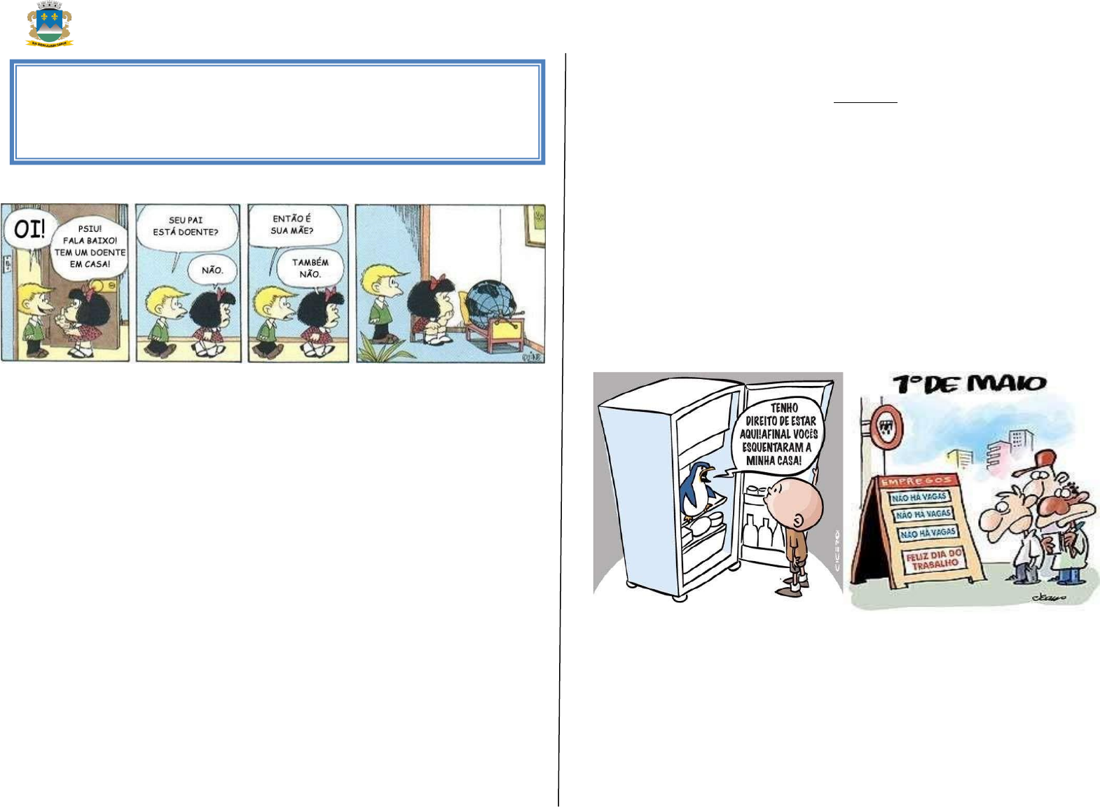 PREFEITURA DE MONTES CLAROS-MG SECRETARIA MUNICIPAL DE EDUCAÇÃO PROJETO: RECUPERAÇÃO E DESENVOLVIMENTO DA APRENDIZAGEM Após uma leitura atenta de todos os quadrinhos da tirinha, responda ao que se pede. 01. O texto acima pertence ao gênero textual: a) fábula b) tirinha c) charge d) caricatura 02. Qual o assunto principal contido na história? 03. Observe as imagens da tira. No primeiro quadrinho, a interjeição “OI” está em negrito e em maiúscula, para: a) enfatizar o cumprimento do amigo de Mafalda. b) demonstrar que o amigo de Mafalda falou em voz muito alta. c) mostrar que o amigo de Mafalda deveria falar mais baixo. d) enfatizar que Mafalda não gostou do tom de voz de seu amigo. 04. Observem que a resposta de Mafalda, ao cumprimento de seu amigo, não foi construída somente por palavras, mas por uma imagem que deve ser interpretada. Porque podemos entender, pela imagem de Mafalda, que ela está pedindo silêncio? 05. Por qual motivo mafalda pediu que o amigo fizesse silêncio? 06. Na tirinha da Mafalda, que elemento não verbal aparece e o que ele representa? a) O globo terreste, representando o mundo. b) O mapa mundi, representando a terra. c) O mapa do Brasil, representando o povo. d) O globo terreste, representando os mares. 07. Para você, o que significa falar que o mundo está doente? 08. Ainda na tirinha, como você interpretaria a “doença” do mundo? O que causa essa doença? Responda no caderno com suas palavras. 09.Analise as figuras abaixo e interprete-as, esclarecendo seus significados e fazendo as devidas inferências. 10. Leia o texto abaixo e explique a inferência que ele apresenta. Explique o que você entendeu. Minha mãe ouviu um barulho de noite! Quando ela olhou, tinha um homem debaixo da cama! — Era um ladrão? — Que nada, era o meu pai! Ele também tinha ouvido o barulho. Inferir é ir além daquilo que o texto apresenta. Inferir é interpretar de forma lógica e objetiva, buscando informações que complementam a leitura. Para se compreender um texto, é preciso fazer inferências, ou seja, é preciso que o leitor complete o texto com informações que não estão explícitas nele.