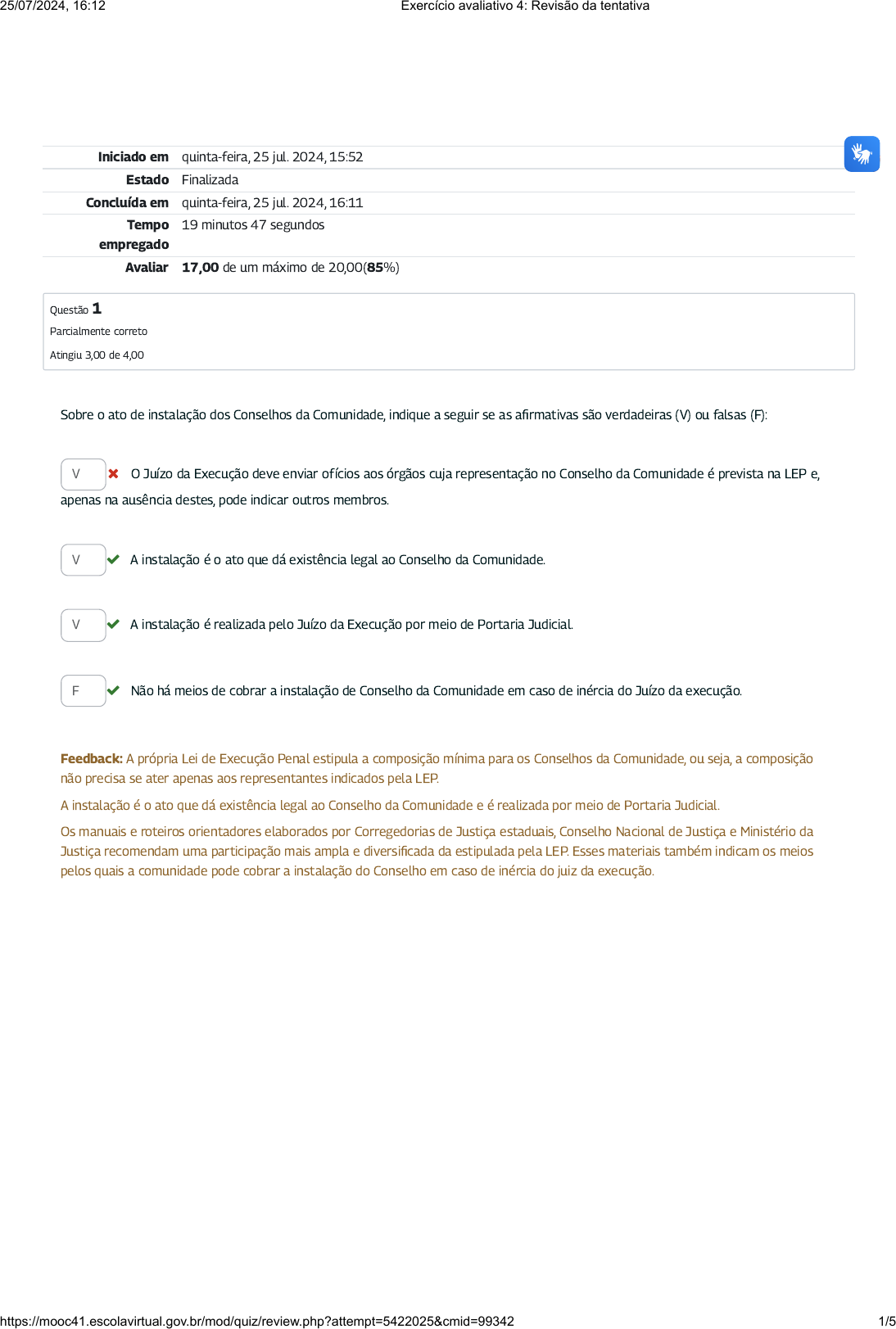 Iniciado em quinta-feira, 25 jul. 2024, 15:52 Estado Finalizada Concluída em quinta-feira, 25 jul. 2024, 16:11 Tempo empregado 19 minutos 47 segundos Avaliar 17,00 de um máximo de 20,00(85%) Questão 1 Parcialmente correto Atingiu 3,00 de 4,00 Sobre o ato de instalação dos Conselhos da Comunidade, indique a seguir se as a�rmativas são verdadeiras (V) ou falsas (F): O Juízo da Execução deve enviar ofícios aos órgãos cuja representação no Conselho da Comunidade é prevista na LEP e, apenas na ausência destes, pode indicar outros membros. A instalação é o ato que dá existência legal ao Conselho da Comunidade. A instalação é realizada pelo Juízo da Execução por meio de Portaria Judicial. Não há meios de cobrar a instalação de Conselho da Comunidade em caso de inércia do Juízo da execução. V V V F Feedback: A própria Lei de Execução Penal estipula a composição mínima para os Conselhos da Comunidade, ou seja, a composição não precisa se ater apenas aos representantes indicados pela LEP. A instalação é o ato que dá existência legal ao Conselho da Comunidade e é realizada por meio de Portaria Judicial. Os manuais e roteiros orientadores elaborados por Corregedorias de Justiça estaduais, Conselho Nacional de Justiça e Ministério da Justiça recomendam uma participação mais ampla e diversi�cada da estipulada pela LEP. Esses materiais também indicam os meios pelos quais a comunidade pode cobrar a instalação do Conselho em caso de inércia do juiz da execução. 25/07/2024, 16:12 Exercício avaliativo 4: Revisão da tentativa https://mooc41.escolavirtual.gov.br/mod/quiz/review.php?attempt=5422025&cmid=99342 1/5 Questão 2 Parcialmente correto Atingiu 2,00 de 4,00 Após a instalação do Conselho da Comunidade, é preciso de�nir se o Conselho será de natureza jurídica pública ou privada. A maioria dos Conselhos optam por adotar personalidade jurídica de direito privado. Sobre o registro do Conselho da Comunidade como pessoa jurídica de direito privado, indique se as a�rmativas são verdadeiras (V) ou falsas (F): A constituição dos Conselhos com personalidade jurídica de direito privado garante-lhes uma maior autonomia. Para registro como personalidade jurídica de direito privado, o Conselho da Comunidade deve se reunir em Assembleia Geral, onde será elaborado e votado o Estatuto Social do Conselho. Por se tratar de órgão da execução penal, com �nalidade pública, o Conselho da Comunidade que optar por se registrar com personalidade jurídica de direito privado não precisa fazer o registro do CNPJ, bastando o registro no cartório. As etapas para registro de pessoa jurídica de direito privado incluem Assembleia Geral para eleição da Diretoria e Aprovação do Estatuto Social; solicitação de isenção de custas para registro; registro no Cartório; registro no CNPJ; e abertura de conta corrente. V V V F Feedback: A constituição dos Conselhos com personalidade jurídica de direito privado garante-lhes uma maior autonomia através de seus estatutos e regramentos internos e maior facilidade para a formação de parcerias, convênios, captação e execução de recursos �nanceiros. Dessa forma, alguns materiais estaduais orientadores para Conselhos da Comunidade já indicam que o Conselho deve se constituir como pessoa jurídica de direito privado. Para o registro como personalidade jurídica de direito privado, os Conselhos da Comunidade podem se constituir como associações sem �ns lucrativos. Esse processo deve ser iniciado com uma Assembleia Geral do Conselho, em que deve ser eleita a diretoria do Conselho da Comunidade e elaborado e votado o Estatuto Social. Uma vez aprovado o Estatuto, o Juiz deve o�ciar o Cartório de Registro de Pessoas Jurídicas requisitando a inscrição dos atos constitutivos do Conselho e a isenção do pagamento de emolumentos decorrentes. A Diretoria do Conselho deve, então, se encarregar do registro junto ao cartório e, após essa etapa, é necessário realizar o registro junto ao Cadastro Nacional de Pessoa Jurídica (CNPJ) da Receita Federal. Além da Assembleia Geral para eleição da Diretoria e Aprovação do Estatuto Social, para registro de pessoa jurídica de direito privado, é necessário ainda a solicitação de isenção de custas para registro; registro no Cartório; registro no CNPJ; e abertura de conta corrente. 25/07/2024, 16:12 Exercício avaliativo 4: Revisão da tentativa https://mooc41.escolavirtual.gov.br/mod/quiz/review.php?attempt=5422025&cmid=99342 2/5 Questão 3 Correto Atingiu 4,00 de 4,00 Considerando as recomendações sobre a composição dos Conselhos da Comunidade apresentadas no Manual de Fortalecimento dos Conselhos da Comunidade, do Conselho Nacional de Justiça, indique se as a�rmativas são verdadeiras (V) ou falsas (F): Recomenda-se uma diversi�cação de integrantes nos Conselhos da Comunidade que inclua representantes de órgãos públicos e da sociedade civil. Recomenda-se a participação de representantes de órgãos públicos responsáveis por políticas setoriais, como saúde, educação e diversidade. Recomenda-se a participação de representantes de órgãos da execução penal. Recomenda-se a participação de egressos(as) e familiares de pessoas privadas de liberdade. Uma vez instalado o Conselho da Comunidade, sua composição não deve ser alterada por pelo menos cinco anos. V V F V F Feedback: A composição de integrantes dos Conselhos da Comunidade segundo a LEP é considerada uma “composição mínima” e, por se tratar de um órgão orientado para a participação social na execução penal, espera-se que a diversi�cação de integrantes seja mais ampla, incluindo representantes de organizações públicas e privadas e integrantes da sociedade civil. A participação de representantes de órgãos municipais e estaduais responsáveis por políticas setoriais, como saúde, educação e diversidade, pode contribuir pa
