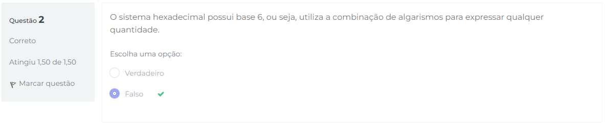 Questão 2 sistema hexadecimal possui base 6, ou seja, utiliza a combinação de algarismos para expressar qualquer quantidade. Correto Escolha uma opção: Atingiu 1,50 de 1,50 Verdadeiro P Marcar questão Falso