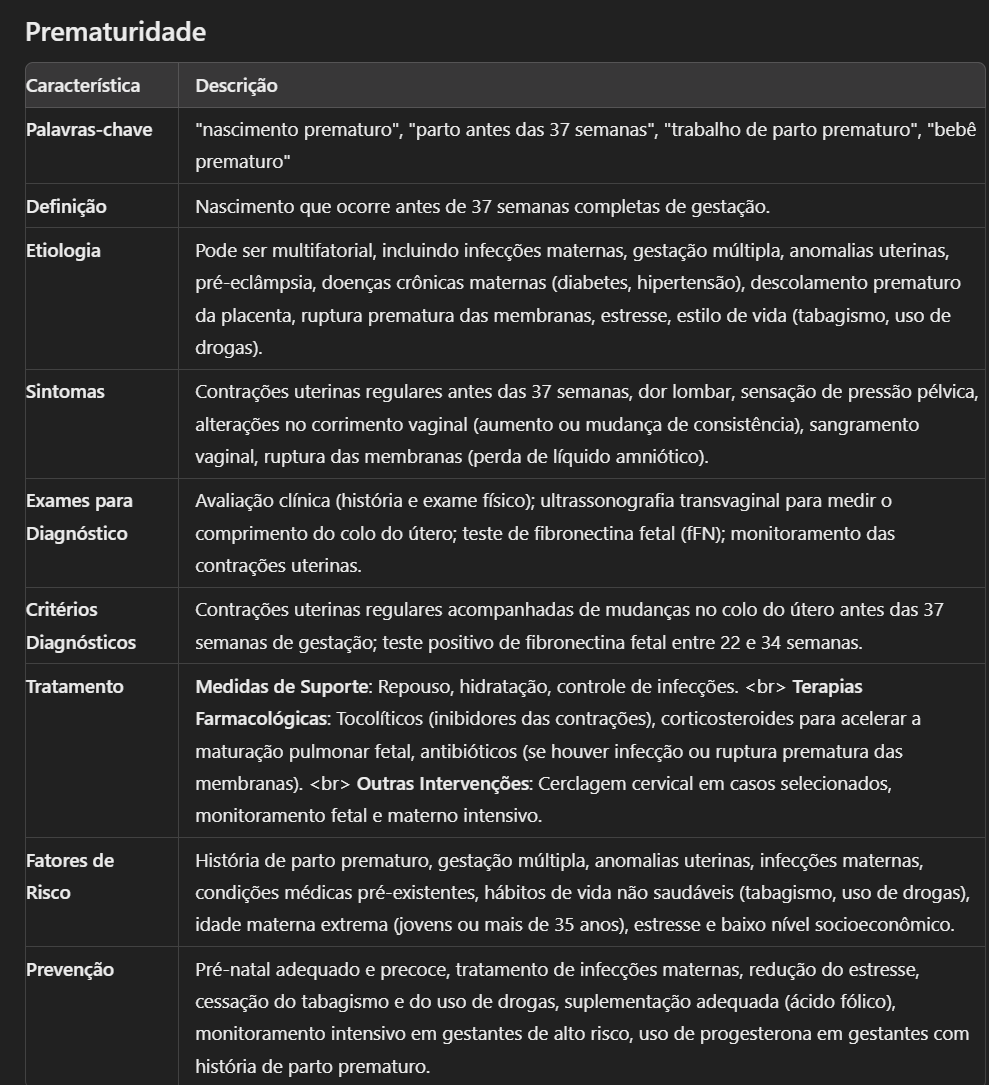 Prematuridade Característica Descrição Palavras-chave "nascimento prematuro", "parto antes das 37 semanas", "trabalho de parto prematuro", "bebê prematuro" Definição Nascimento que ocorre antes de 37 semanas completas de gestação. Etiologia Pode ser multifatorial, incluindo infecções maternas, gestação múltipla, anomalias uterinas, pré-eclâmpsia, doenças crônicas maternas (diabetes, hipertensão), descolamento prematuro da placenta, ruptura prematura das membranas, estresse, estilo de vida (tabagismo, uso de drogas). Sintomas Contrações uterinas regulares antes das 37 semanas, dor lombar, sensação de pressão pélvica, alterações no corrimento vaginal (aumento ou mudança de consistência), sangramento vaginal, ruptura das membranas (perda de líquido amniótico). Exames para Avaliação clínica (história e exame físico); ultrassonografia transvaginal para medir O Diagnóstico comprimento do colo do útero; teste de fibronectina fetal (fFN); monitoramento das contrações uterinas. Critérios Contrações uterinas regulares acompanhadas de mudanças no colo do útero antes das 37 Diagnósticos semanas de gestação; teste positivo de fibronectina fetal entre 22 e 34 semanas. Tratamento Medidas de Suporte: Repouso, hidratação, controle de infecções. <br> Terapias Farmacológicas: Tocolíticos (inibidores das contrações), corticosteroides para acelerar a maturação pulmonar fetal, antibióticos (se houver infecção ou ruptura prematura das membranas). <br> Outras Intervenções: Cerclagem cervical em casos selecionados, monitoramento fetal e materno intensivo. Fatores de História de parto prematuro, gestação múltipla, anomalias uterinas, infecções maternas, Risco condições médicas pré-existentes, hábitos de vida não saudáveis (tabagismo, uso de drogas), idade materna extrema (jovens ou mais de 35 anos), estresse e baixo nível socioeconômico. Prevenção Pré-natal adequado e precoce, tratamento de infecções maternas, redução do estresse, cessação do tabagismo e do uso de drogas, suplementação adequada (ácido fólico), monitoramento intensivo em gestantes de alto risco, uso de progesterona em gestantes com história de parto prematuro.