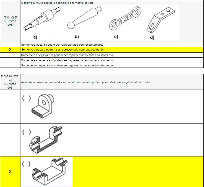 Observe a figura abaixo e assinale a alternativa correta. [200_662] Questão 005 a) b) c) d) Somente a peça a podem ser representada com X Somente a peça b podem ser representada com encurtamento Somente as peças a e b podem ser representadas com Somente as peças a e d podem ser representadas com Somente as peças a podem ser representadas com [350246_678 4] Questão Assinale o desenho que mostra modelo seccionado por um plano de corte longitudinal 006 ( ) ( ( )