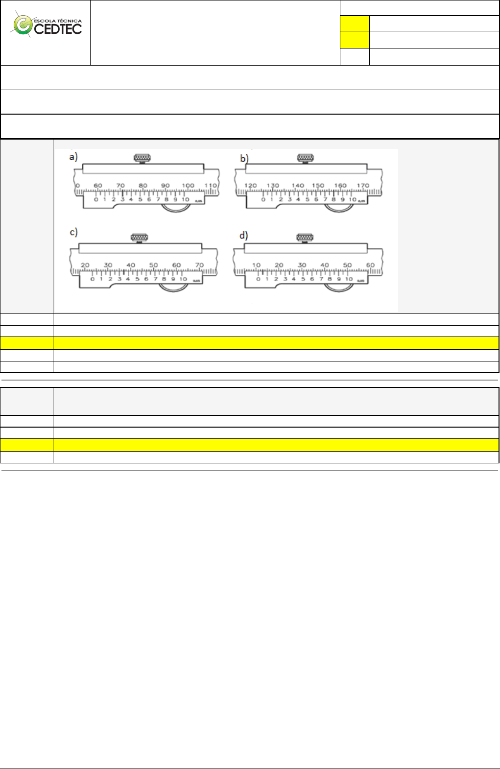 Pincel Atômico - 16/06/2024 10:48:41 1/2 ALEXANDRE CORREIA DA SILVA Exercício Caminho do Conhecimento - Etapa 7 (15345) Atividade finalizada em 13/06/2024 10:45:10 (2047933 / 2) LEGENDA Resposta correta na questão # Resposta correta - Questão Anulada X Resposta selecionada pelo Aluno Disciplina: METROLOGIA [1113375] - Avaliação com 4 questões, com o peso total de 6,50 pontos [capítulos - 103] Turma: Curso Técnico: Mecânica - Grupo: EAD - 06/24 - EAD MEC [124185] Aluno(a): 91617825 - ALEXANDRE CORREIA DA SILVA - Respondeu 4 questões corretas, obtendo um total de 6,50 pontos como nota [350184_624] Questão 001 Faça a leitura nos paquímetros e marque a alternativa com a seqüência correta. a) 59,30mm - b) 125,80mm - c) 23,35mm - d) 10,05mm a) 71,30mm - b) 12,08mm - c) 33,50mm - d) 78,15mm X a) 59,30mm - b) 125,80mm - c) 23,35mm - d) 11,05mm a) 73,00mm - b) 158,00mm - c) 335,00mm - d) 81,00mm a) 59,30mm - b) 125,80mm - c) 23,65mm - d) 11,50mm [350184_28177] Questão 002 Quantas divisões principais têm o Nônio ? 12 11 X 10 9 Pincel Atômico - 16/06/2024 10:48:41 2/2 [350185_616] Questão 003 Calcule e informe as leituras abaixo. a) 4 mm - b) 14,5 mm - c) 32,70 mm - d) 78,15 mm a) 4 mm - b) 4,5 mm - c) 32,70 mm - d) 78,75 mm a) 4 mm - b) 4,5 mm - c) 132,70 mm - d) 78,15 mm X a) 4 mm - b) 4,5 mm - c) 32,70 mm - d) 78,15 mm; a) 0,4 mm - b) 4,5 mm - c) 32,70 mm - d) 78,15 mm [350184_28180] Questão 004 Dada a medição de uma peça, obteve-se a seguinte leitura da graduação. Qual das alternativas abaixo representa corretamente a leitura do paquímetro ? 10,04 mm 10,10 mm X 10,08 mm 10,40 mm