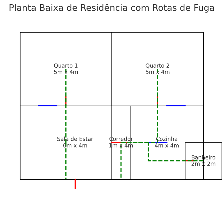 Planta Baixa de Residência com Rotas de Fuga Quarto 1 Quarto 2 5m * 4m 5m 4m Sala de Estar Corredor Cozinha 6m X 4m 4m 4m X 4m Banheiro 2m 2m