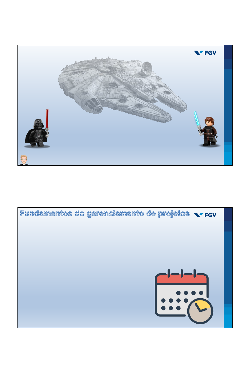 1 Prof. Alexandre Caramelo Pinto - alexandre.pinto@fgv.br Fundamentos do gerenciamento de projetos Aula 2 • Compreendendo o PMBOK Guide® - Modelo de grupos de processos e as áreas de conhecimento - 15min • Princípios do gerenciamento de projetos e domínios de desempenho – 15min • Atividade em equipe – 45min • Juntando tudo! – 10min • Dúvidas – 5min 0 1 2 Compreendendo um sistema de geração de valor = benefícios – custo total benefícios custo total valor = Adaptado de PMI (2021) e FLEKS, COSTA, H. (2020, p.8) benefício capaz de atender as necessidades e expectativas das partes interessadas foco no valor resultados entregas entrega 12 princípios do gerenciamento de projetos 10 domínios de desempenho benefícios resultados capacidades iniciativas objetivos estratégia ✓Não é uma metodologia, mas sim um conjunto dos conhecimentos em gerenciamento de projetos, um padrão mundial consolidado e reconhecido. ✓ É um trabalho em constante evolução (cada 4 anos), fruto de anos de experiência de profissionais de várias áreas ✓Cabe a Equipe de gerenciamento do projeto determinar o que é adequado para um projeto específico, pois o contexto importa e a possibilidade do time poder fazer suas escolhas é importante e positivo! ✓ É possível que as empresas montem sua própria metodologia baseada no PMBOK Guide® Project Management Body of Knowledge PMBOK Guide® 2 3 3 •Membros filiados ao PMI®: 682.691 •Project Management Professional (PMP)®: 1.246. 502 •Certified Associate in Project Management (CAPM)® : 56.539 •Program Management Professional (PgMP)®: 3.459 •PMI Scheduling Professional (PMI-SP)®: 2.566 •PMI Risk Management Professional (PMI-RMP)®: 9.566 •PMI Agile Certified Practitioner (PMI-ACP)®: 47.648 •PMI Portfolio Management Professional (PfMP)®: 1.146 •PMI Professional in Business Analysis (PMI-PBA)®: 5.331 •PMI chapters: 304 em 216 países •Filiados nos chapters: 682.691 PMI (2021) – PMI Fact File. Disponível em: https://www.projectmanagement.com/blog-post/70984/november-2021-pmi-fact-file-stats Project Management Institute em números 1996 2000 2004 2008 2012 2017 2021 Project Management Body of Knowledge PMBOK Guide® 4 5 4 iniciação encerramento planejamento execução monitoramento & controle iniciação encerramento planejamento monitoramento & controle execução iniciação encerramento planejamento execução monitoramento & controle Ciclo de vida de um projeto médio de software Escopo Custo Cronograma Riscos Aquisições Qualidade Comunicações Recursos Integração Stakeholders Integração entre as áreas do conhecimento Fonte: baseado em PMBOK® Guide (PMI, 2021). Termo de abertura do projeto ou Project Charter Plano de gerenciamento do projeto 6 7 5 PMBOK Guide 7ª edição – o que temos na 6ª edição? Escopo Custo Cronograma Riscos Aquisições Qualidade Comunicações Recursos Integração Stakeholders Iniciação Execução Monitoramento e Controle Encerramento informações básicas Plano dados e entregas ordem de execução atividades realizadas Planejamento grupos de processos (5) áreas de conhecimento (10) introdução ambiente de projetos papel do GP 10 áreas de conhecimento 5 grupos de processos A Guide to the Project Management Body of knowledge - PMBOK Guide 6th ed. The Standard for Project Management Appendixes, Glossary and Index grupos de processos áreas de conhecimento 49 Fonte: baseado em PMBOK® Guide (PMI, 2017; 2021). introdução ambiente de projetos papel do GP 10 áreas de conhecimento 5 grupos de processos introdução sistema de entrega de valor 12 princípios da gestão de projetos A Guide to the Project Management Body of knowledge - PMBOK Guide 6th ed. The Standard for Project Management Appendixes, Glossary and Index The Standard for Project Management A Guide to the Project Management Body of knowledge - PMBOK Guide 7th ed. 8 domínios de desempenho tailoring modelos, métodos e artefatos Appendixes, Glossary and Index PMP® continua Sendo baseado no PMBOK Guide 6th ed... até segunda ordem! O elo “não perdido” entre PMBOK Guide 6th e 7th edições conecta o PMBOK Guide aos modelos, métodos e artefatos, além de todos padrões do PMI e expande o contexto com conteúdos digitais Fonte: baseado em PMBOK® Guide (PMI, 2017; 2021). 8 9 6 Gerenciamento da Integração Gerenciamento do Cronograma Desenvolver o Termo de Abertura Desenvolver o Plano de Gerenciamento do Projeto Orientar e Gerenciar o Trabalho do Projeto Gerenciar o Conhecimento do Projeto Monitorar e Controlar o Trabalho do Projeto Realizar o Controle Integrado de Mudanças Encerrar o Projeto ou Fase Gerenciamento do Escopo Planejar o Gerenciamento do Escopo Coletar os Requisitos Definir o Escopo Criar a EAP Validar o Escopo Controlar o Escopo Planejar o Gerenciamento do Cronograma Definir as Atividades Estimar as Durações das Atividades Desenvolver o Cronograma Sequenciar as Atividades Controlar o Cronograma Gerenciamento dos Custos Planejar o Gerenciamento dos Custos Estimar os Custos Determinar o Orçamento Controlar os Custos Gerenciamento da Qualidade Planejar o Gerenciamento da Qualidade Gerenciar a Qualidade Controlar a Qualidade Gerenciamento dos Recursos Planejar o Gerenciamento dos Recursos Estimar os Recursos das Atividades Adquirir Recursos Desenvolver a Equipe Gerenciar a Equipe Controlar os Recursos Gerenciamento das Comunicações Planejar o Gerenciamento das Comunicações Gerenciar as Comunicações Monitorar as Comunicações Gerenciamento das Partes Interessadas Identificar as Partes Interessadas Planejar o Engajamento das Partes Interessadas Gerenciar o Engajamento das Partes Interessadas Monitorar o Engajamento das Partes Interessadas Gerenciamento das Aquisições Planejar o Gerenciamento das Aquisições Conduzir as Aquisições Controlar as Aquisições Gerenciamento dos Riscos Planejar o Gerenciamento dos Riscos Identificar os Riscos Realizar a Análise Qualitativa dos
