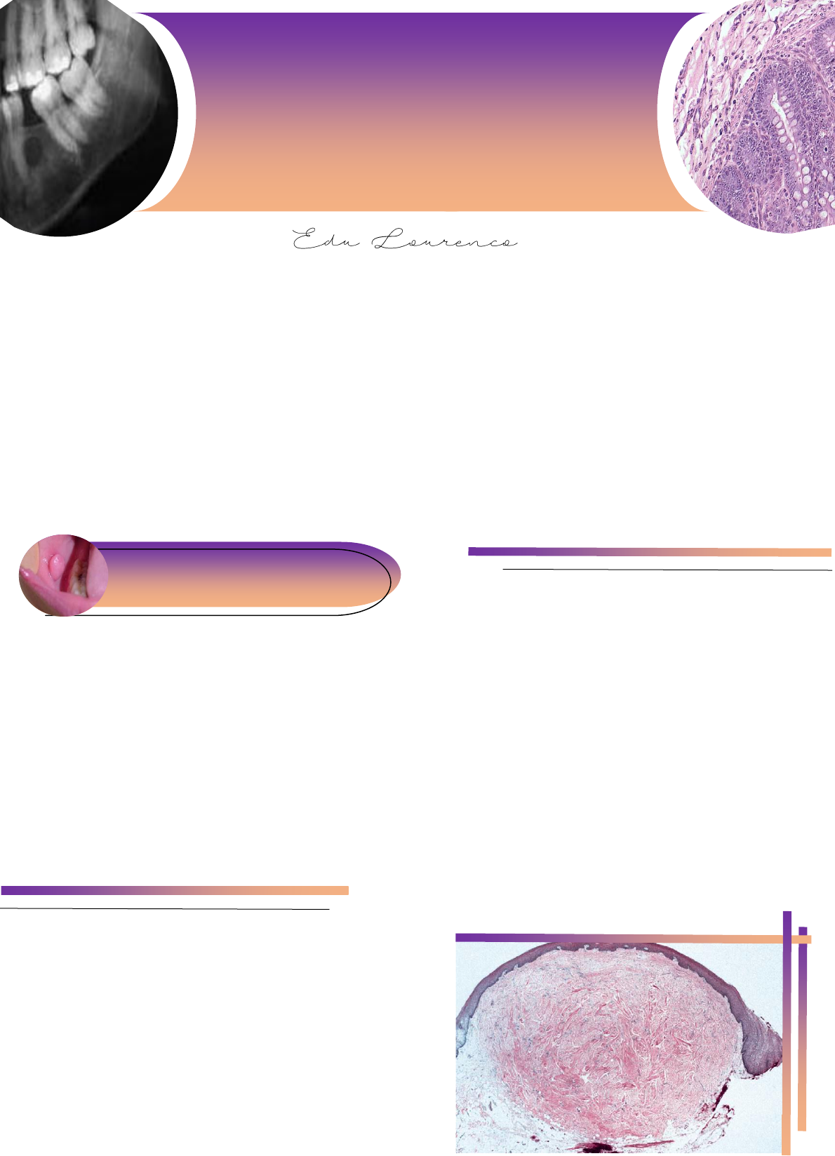 Fibroma traumático é uma das lesões mais comuns da cavidade oral, definido como uma patologia reativa e não um tumor verdadeiro, uma vez que é causado por trauma crônico da mucosa oral, sendo então considerado uma hiperplasia do tecido conjuntivo. Já a hiperplasia fibrosa inflamatória é caracterizada por um aumento do volume tecidual, em decorrência de traumas mecânicos crônicos locais, sendo que a grande maioria se deve ao fato dos pacientes apresentarem próteses mal adaptadas. O fibroma é o “tumor” mais comum da cavidade oral. Entretanto, é questionado se, na maioria das situações, ele representa uma neoplasia verdadeira. Talvez ele possa representar uma hiperplasia reacional do tecido conjuntivo fibroso em resposta à irritação ou trauma local. Também pode ser chamado de fibroma de irritação, Hiperplasia fibrosa focal e nódulo fibroso. (Proliferação do tecido conjuntivo) Características clínicas Embora o fibroma de irritação possa ocorrer em qualquer lugar da boca, a localização mais comum é a mucosa jugal, ao longo da linha de oclusão, a mucosa labial, a língua e a gengiva. É provável que muitos fibromas gengivais representem uma maturação fibrosa de um granuloma piogênico preexistente. apresenta como um nódulo de superfície lisa e coloração rosada, similar à coloração da mucosa circunjacente. Em alguns casos, a superfície pode se apresentar branca em decorrência da hiperceratose, resultante da irritação contínua. Muitos fibromas são sésseis, embora alguns sejam pedunculados. A lesão usualmente não produz sintomas, a menos que ocorram ulcerações traumáticas secundárias em sua superfície. Características histopatológicas Um aumento de volume nodular de tecido conjuntivo fibroso, recoberto por epitélio escamoso estratificado, este tecido conjuntivo é usualmente denso e colagenizado, embora em alguns casos seja de natureza frouxa. A lesão não é encapsulada e o tecido conjuntivo se mistura gradualmente ao tecido conjuntivo circunjacente. Os feixes colágenos podem estar arranjados de forma irradiada, circular, ou aleatoriamente geralmente demonstra atrofia das cristas epiteliais devido ao aumento de volume do tecido subjacente. Entretanto, a superfície pode exibir hiperceratose secundária a trauma. Pode ser observada inflamação difusa, principalmente abaixo da superfície epitelial. Usualmente, esta inflamação é crônica e consiste principalmente em linfócitos e plasmócitos. Lesões traumáticas Fibroma traumático Tratamento e prognóstico O fibroma de irritação é tratado pela excisão cirúrgica conservadora. A recidiva é extremamente rara. Entretanto, é importante que o tecido excisado seja encaminhado para exame microscópico, já que outros tumores benignos e malignos podem mimetizar a aparência clínica de um fibroma. Pelo fato de a hiperplasia do freio ser pequena, crescimentos não expressivos que são facilmente diagnosticados clinicamente, geralmente nenhum tratamento é necessário. É uma hiperplasia de tecido conjuntivo fibroso, semelhante a um tumor, que se desenvolve em associação com as bordas de uma prótese total ou parcial mal adaptada. Podendo ser chamada também de epulide fissurada. Características clínicas Se apresenta como uma única prega ou múltiplas pregas de tecido hiperplásico no vestíbulo alveolar, mais frequentemente, duas pregas de tecido estão presentes, e as bordas da prótese associada se encaixam perfeitamente dentro da fissura entre as pregas. O tecido apresenta-se firme e fibroso, embora algumas lesões se apresentem eritematosas e ulceradas, semelhantes ao granuloma piogênico. Usualmente se desenvolve na face vestibular do rebordo alveolar, embora lesões ocasionais possam ser vistas na face lingual do rebordo alveolar inferior, porção anterior dos ossos maxilares é mais afetada do que as porções posteriores Características histopatológicas Revela uma hiperplasia do tecido conjuntivo fibroso O epitélio de revestimento frequentemente é hiperparaceratinizado e demonstra hiperplasia irregular das cristas Hiperplasia fibrosa inflamatória epiteliais. Em alguns casos, o epitélio exibe hiperplasia papilar inflamatória, ou Hiperplasia pseudoepiteliomatosa (pseudocarcinomatosa). Áreas focais de ulceração não são raras, especialmente na base das fissuras entre as pregas. Um infiltrado inflamatório crônico variável está presente. Algumas vezes, podem estar presentes eosinófilos, ou ocorrer a formação de folículos linfoides Em raras situações, observa-se a formação de tecido osteoide ou condroide. Esta aparência incomum, conhecida como metaplasia óssea e condromatosa, é um fenômeno reativo causado pela irritação crônica da prótese mal-adaptada Tratamento e prognóstico O tratamento para a epúlide fissurada ou para o pólipo fibroepitelial consiste na remoção cirúrgica, com o exame microscópico do tecido removido. A prótese mal-adaptada deve ser refeita ou corrigida para prevenir a recidiva da lesão.