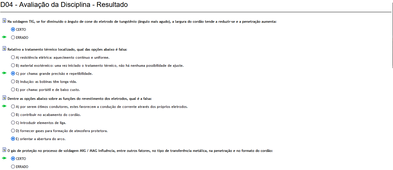 D04 - Avaliação da Disciplina - Resultado Na soldagem TIG, se for diminuído o ângulo de cone do eletrodo de tungstênio (ângulo mais agudo), a largura do cordão tende a reduzir-se e a penetração aumenta: CERTO Relativo a tratamento térmico localizado, qual das opções abaixo é falsa: A) resistência aquecimento contínuo e B) material exotérmico: uma vez iniciado o tratamento térmico, não há nenhuma possibilidade de ajuste. C) por chama: grande precisão e repetibilidade. D) indução: as bobinas têm longa vida. E) por chama: e de baixo custo. Dentre as opções abaixo sobre as funções do revestimento dos eletrodos, qual é a falsa: A) por serem ótimos condutores, estes favorecem a condução de corrente através dos próprios B) contribuir no acabamento do C) introduzir elementos de liga. D) fornecer gases para formação de atmosfera protetora. E) orientar a abertura do arco. gás de proteção no processo de soldagem MIG / MAG influência, entre outros fatores, no tipo de transferência metálica, na penetração e no formato do cordão: CERTO FRRADO