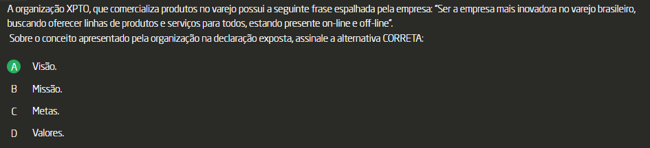 A organização XPTO, que comercializa produtos no varejo possui a seguinte frase espalhada pela empresa: "Ser a empresa mais inovadora no varejo brasileiro, buscando oferecer linhas de produtos e serviços para todos, estando presente on-line e Sobre conceito apresentado pela organização na declaração exposta, assinale a alternativa CORRETA: Visão. B Missão. Metas. D Valores.