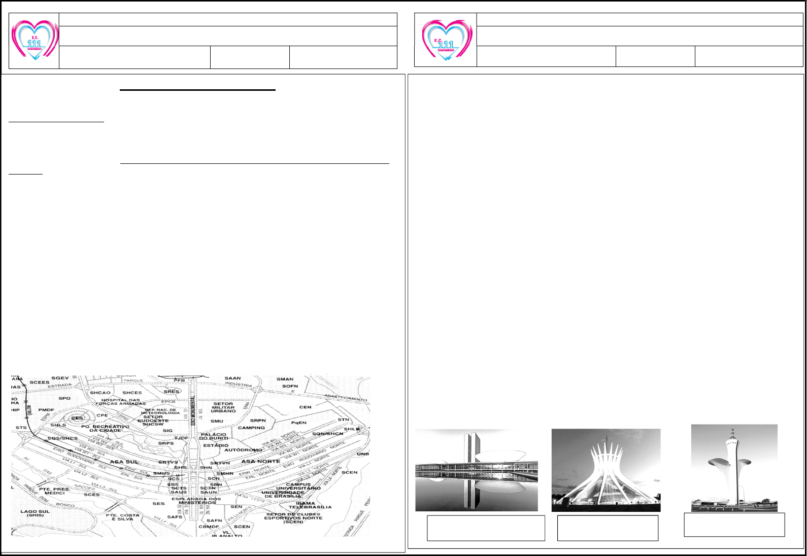 ESCOLA CLASSE 111 DE SAMAMBAIA ESTUDANTE: PROFESSOR(A): TURMA: DATA: / /2024 ESCOLA CLASSE 111 DE SAMAMBAIA ESTUDANTE: PROFESSOR(A): TURMA: DATA: / /2024 HISTÓRIA: Brasília: Início da construção Em 1956, o presidente Juscelino Kubitschek encaminhou ao Congresso a chamada Mensagem de Anápolis, propondo, entre outras medidas, a criação de uma empresa responsável pela construção da nova capital. Dessa forma, mesmo enfrentando grande oposição, Juscelino conseguiu aprovar no Congresso, em 19 de setembro de 1956, a Lei n.º 2.874, que daria seguimento ao processo de construção e criaria a Companhia Urbanizadora da Nova Capital (Novacap), responsável pela execução do projeto e deu o nome de Brasília à capital. Restava ainda definir como seria a nova capital. Em 12 de março de 1957 instalou- se a Comissão julgadora do Concurso Público para a escolha do Plano Piloto da cidade de Brasília. NESSA FASE DE CONSTRUÇÃO DA CIDADE, ALGUNS NOMES SE DESTACARAM, COMO: LÚCIO COSTA- PROJETO URBANISTICO Para tanto foi realizado um concurso público onde participaram arquitetos e urbanistas de vários países, entre os 26 projetos inscritos, o vencedor foi o projeto do arquiteto e urbanista Lúcio Costa. A concepção do Plano Piloto nasceu do gesto de quem assinala uma cruz. Um símbolo de conquista, de quem toma posse de um território. Adaptado à topografia local e ao escoamento das águas, um dos eixos dessa cruz, o Norte-Sul, seria arqueado e daria ao desenho final a noção de um pássaro – ou, como diria mais tarde Lucio Costa, a sugestão de uma libélula, uma borboleta, um arco e flecha. Uma dessas linhas, o Eixo Rodoviário, ele seria a via que leva às áreas residenciais – hoje, Asa Sul e Asa Norte. A outra linha, que representava o Eixo Monumental, abrigaria os prédios públicos e o palácio do Governo Federal no lado leste; a Rodoviária e a Torre de TV no centro, e os prédios do governo local no lado oeste. Assim dividiu o projeto em 4 escalas, nomeadas por ele em 1961. A escala monumental e a residencial são fáceis de identificar: a Esplanada dos Ministérios e as superquadras. OSCAR NIEMEYER - PROJETO ARQUITETÔNICO Em 1940, conheceu JK, então prefeito de BH, que encomendou a criação do Conjunto Arquitetônico da Pampulha. Em 1956, JK entrou novamente em contato com Niemeyer para falar sobre a construção de Brasília. O arquiteto se empolgou e aceitou o desafio de projetar a nova capital: “Comecei a pensar em Brasília certa manhã - setembro de 1956 - quando JK, descendo do seu carro na Estrada da Gávea, parou no meu portão e, levando-me para a cidade, expôs o problema. Minha primeira reação correspondeu ao interesse que essa obra representava, interesse profissional e afetivo, pois via nela empenhado o velho amigo a quem me ligavam outros trabalhos, outras dificuldades e uma antiga e fiel amizade. Daí em diante passei a viver em função de Brasília”. Em 1957, foi nomeado chefe do Departamento de Urbanismo e Arquitetura. No ano seguinte, decidiu mudar-se para o local da construção. O objetivo era acompanhar de perto o andamento das obras, em tempo integral. “Não podemos dizer que as condições encontradas fossem satisfatórias. Contudo, prevaleceram, com surpresa, um entusiasmo, uma determinação e um espírito esportivo que afastaram todas as dificuldades. Sentíamos, por outro lado, que colaborávamos numa obra importante; uma cidade que surgia como uma flor naquela terra agreste e deserta”, afirmou o arquiteto. Em Brasília, Niemeyer elaborou mais de cem projetos, todos em pouco tempo. As mais famosas estão na Esplanada dos Ministérios, os monumentos projetados por Oscar Niemeyer, são obras primas da arquitetura moderna, como o Museu Nacional, a Catedral, os ministérios e o Itamaraty. Ao chegar na Praça dos Três Poderes e admirar as colunas do Palácio do Planalto, o estilo arrojado do Congresso Nacional e do Supremo Tribunal Federal (STF), o visitante entende porque Brasília é uma cidade única em todo o mundo. Mas as obras de Niemeyer vão além, estão espalhadas por todos os cantos do Plano Piloto e também podem ser vistas em outras regiões administrativas, como Ceilândia e Lago Norte. Além de monumentos, Niemeyer fez prédios que nem de longe se parecem com as suntuosas edificações erguidas ao longo do Eixo Monumental, como edifícios comerciais no Setor Comercial Sul e residenciais nas superquadras 107 e 108 Sul. Projetou igrejas, casas, hospital, palácios, museus. Uma infinidade criativa que se estendeu até meses antes de sua morte. O último projeto dele construído em Brasília foi a Torre de TV Digital, concebida em 2008, quando Niemeyer já tinha 101 anos. Congresso Nacional Catedral Torre de tv digital ESCOLA CLASSE 111 DE SAMAMBAIA ESTUDANTE: PROFESSOR(A): TURMA: DATA: / /2024 ESCOLA CLASSE 111 DE SAMAMBAIA ESTUDANTE: PROFESSOR(A): TURMA: DATA: / /2024 ISRAEL PINHEIRO – PRESIDENTE DA NOVACAP O mineiro Israel Pinheiro, foi a autoridade escolhida por JK, como responsável pela construção de Brasília. Escolhido como presidente da Novacap, era formado em engenharia pela Escola de Minas de Ouro Preto. Filho de João Pinheiro, Israel já possuía respeitável biografia quando assumiu a Novacap em 1956. Foi um dos pioneiros da metalurgia e da siderurgia no país. Israel era favorável à mudança da capital para o interior por considerar que era um projeto estratégico para o desenvolvimento econômico do país. Além de ser o homem da confiança de JK e engenheiro de larga experiência, Israel Pinheiro, era famoso pela sua enorme disposição para o trabalho. No período da construção de Brasília, trabalhava de seis da manhã às oito da noite. Ficava no escritório da Novacap ou dentro de uma Rural Willys, percorrendo as obras.“Israel Pinheiro foi o grande esteio da construção da cidade. Mandava e desmandava, prometia e cumpria, virava e desvirava a mesa. Resolvia as coisas”. Israel Pinheiro 