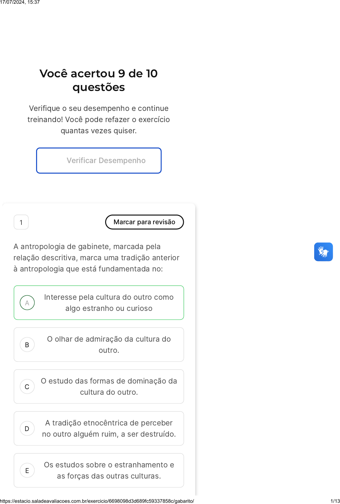 Você acertou 9 de 10 questões Verifique o seu desempenho e continue treinando! Você pode refazer o exercício quantas vezes quiser. Verificar Desempenho A B C D E 1 Marcar para revisão A antropologia de gabinete, marcada pela relação descritiva, marca uma tradição anterior à antropologia que está fundamentada no: Interesse pela cultura do outro como algo estranho ou curioso O olhar de admiração da cultura do outro. O estudo das formas de dominação da cultura do outro. A tradição etnocêntrica de perceber no outro alguém ruim, a ser destruído. Os estudos sobre o estranhamento e as forças das outras culturas. 17/07/2024, 15:37 https://estacio.saladeavaliacoes.com.br/exercicio/6698098d3d689fc59337858c/gabarito/ 1/13 A B C Resposta correta Parabéns, você selecionou a alternativa correta. Confira o gabarito comentado! Gabarito Comentado A alternativa correta é a "A", que afirma que a antropologia de gabinete é marcada pelo interesse pela cultura do outro como algo estranho ou curioso. Isso se deve ao fato de que, nesse tipo de antropologia, os estudos são realizados de maneira mais distante e teórica, sem a imersão direta na cultura estudada. Portanto, a cultura do outro é vista como algo a ser descrito e analisado, muitas vezes sendo percebida como estranha ou curiosa devido à falta de contato direto e experiência vivencial. 2 Marcar para revisão Quando tratamos de antropologia brasileira, passamos a notar que somos profundamente influenciados pela: Cultura do corpo Cultura do trabalhismo Cultura do enriquecimento pelo trabalho 17/07/2024, 15:37 https://estacio.saladeavaliacoes.com.br/exercicio/6698098d3d689fc59337858c/gabarito/ 2/13 D E Cultura do nacionalismo belicista Cultura etnocêntrica Resposta correta Parabéns, você selecionou a alternativa correta. Confira o gabarito comentado! Gabarito Comentado A alternativa correta é a "Cultura do corpo". No contexto da antropologia brasileira, a cultura do corpo é um aspecto significativo. Isso se deve ao fato de que, em nossa sociedade, há uma grande ênfase na aparência física e na manutenção de um corpo saudável e atraente. Essa cultura é refletida em várias áreas, como esportes, moda, publicidade e até mesmo em nossas interações sociais diárias. Portanto, é correto afirmar que somos profundamente influenciados por essa cultura. 3 Marcar para revisão Ana está curiosa sobre como certos rituais e tradições de uma cultura específica apareceram em uma cultura completamente diferente, separada geograficamente. Qual abordagem antropológica Ana deve considerar ao investigar a disseminação de traços culturais entre culturas geograficamente distantes? Questão 3 de 10 Corretas �9� Incorretas �1� Em branco �0� 1 2 3 4 5 6 7 8 9 10 Exercicio Introdução À Antropologia Cultural Sair 17/07/2024, 15:37 https://estacio.saladeavaliacoes.com.br/exercicio/6698098d3d689fc59337858c/gabarito/ 3/13 A B C D E Materialismo Cultural Funcionalismo. Estruturalismo. Difusionismo Cultural Teoria Evolucionista Resposta correta Parabéns, você selecionou a alternativa correta. Confira o gabarito comentado! Gabarito Comentado O Difusionismo Cultural é uma abordagem que se concentra em como os traços culturais se espalham de uma cultura para outra. Ana, ao querer entender como rituais e tradições de uma cultura apareceram em outra cultura distante, deve considerar o Difusionismo Cultural para analisar a disseminação e adaptação desses traços culturais 4 Marcar para revisão Em uma cidade pequena, moradores começam a observar o comportamento cotidiano de seus vizinhos e se questionam sobre as práticas e 17/07/2024, 15:37 https://estacio.saladeavaliacoes.com.br/exercicio/6698098d3d689fc59337858c/gabarito/ 4/13 A B C D E representações sociais que influenciam suas ações diárias. Baseado no estudo de caso acima, qual teoria aborda a prática artesanal da vida cotidiana interpretada pelos atores sociais? Positivismo Estruturalismo Interacionismo simbólico Estudos em Ethnomethodology Funcionalismo Resposta incorreta Opa! A alternativa correta é a letra D. Confira o gabarito comentado! Gabarito Comentado A teoria "Estudos em Ethnomethodology", publicada em 1967 nos EUA, aborda uma forma de compreender a prática artesanal da vida cotidiana. Essa teoria se concentra em interpretar a vida diária e as práticas e representações pelas quais as pessoas negociam sua inserção em grupos. 5 Marcar para revisão 17/07/2024, 15:37 https://estacio.saladeavaliacoes.com.br/exercicio/6698098d3d689fc59337858c/gabarito/ 5/13 A B C D E Lucas, ao analisar a cultura brasileira contemporânea, nota uma forte relação entre a percepção do corpo e a convivência conjugal em ambientes urbanos. Considerando o texto, analise as afirmativas abaixo. I. A cultura brasileira contemporânea não tem influências de percepções urbanas sobre o corpo. II. A convivência conjugal pode ser influenciada por percepções urbanas do corpo. III. A Antropologia não se preocupa com aspectos da cultura brasileira contemporânea. Assinale a opção que apresenta somente as alternativas corretas Apenas a afirmativa II está correta Apenas a afirmativa I está correta Apenas as afirmativas I e III estão corretas Apenas as afirmativas II e III estão corretas Apenas a afirmativa III está correta Resposta correta Parabéns, você selecionou a alternativa correta. Confira o gabarito comentado! Gabarito Comentado O texto menciona que a Antropologia analisa a cultura brasileira contemporânea, 17/07/2024, 15:37 https://estacio.saladeavaliacoes.com.br/exercicio/6698098d3d689fc59337858c/gabarito/ 6/13 A B C especialmente em relação à percepção do corpo e à convivência conjugal. Isso indica que a afirmativa II está correta, enquanto as afirmativas I e III estão incorretas 6 Marcar para revisão O povo Y, uma sociedade matriarcal, tem mulheres como principais líderes e tomadoras de decisão. A propriedade e os títulos são 