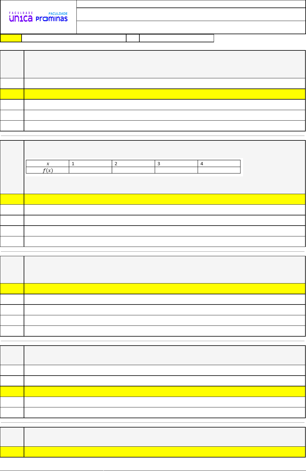 29/07/2024 16:23:16 1/2 REVISÃO DE SIMULADO Nome: RODRIGO BARBOSA FERREIRA Disciplina: Cálculo Numérico Respostas corretas são marcadas em amarelo X Respostas marcardas por você. Questão 001 A função f(x)=2x-3x, possui dois zeros, um no intervalo de [0,1] e outro no intervalo [3,4], aplicando o teorema da Bissecção, podemos determinar na primeira iteração que o intervalo que contém a raiz é: X A) [0,25;1] B) [0; 0,5] C) [0,5;1] D) [0;0,25] E) [0;0,75] Questão 002 Considere a função f(x)= x.ln(x)-3, calcule os valores de f(x) para os seguintes valores arbitrários: Utilizando o Método da Bisseção, podemos concluir que uma das possíveis raízes, encontra-se no intervalo: X A) [2,3] B) [2,4] C) [3,4] D) [1,4] E) [1,2] Questão 003 Considere o polinômio p(x)=3x³-16x²+136x-46 É correto afirmar que: X A) p(x) possui uma raiz no intervalo [0,5] B) p(x) possui uma raiz no intervalo [20,25] C) p(x) possui uma raiz no intervalo [15,25] D) p(x) possui uma raiz no intervalo [5,10] E) p(x) possui uma raiz no intervalo [10,15] Questão 004 Encontre a raiz aproximada, utilizando o método de Newton de F(x)=5x4-sen(x), com quatro casas decimais. Use x=0,5. A) 0,4356 B) 0,5678 X C) 0,5741 D) 0,5678 E) 0,2452 Questão 005 Seja f(x)=(x+2)(x+1)x(x-1)3 (x-2). Para qual raiz de f o método da bisseção converge quando aplicado no intervalo [-3; 2,5]. X A) 2 29/07/2024 16:23:16 2/2 B) 3 C) 1 D) 0,35 E) 0,25 Questão 006 A função F(x)=x2-4x+4-ln (x) com zero no intervalo [1,2]. Calcule a raiz de f(x)com precisão de 10-4. Utilizando o método da falsa posição. A) 1,23456 B) 1,41242 X C) 1,34231 D) 1,12345 E) 1,45678 Questão 007 O método de Newton foi aplicado n vezes afim de se encontrar a raiz quadrada de 7, tomando x0 = 2 e considerando nove casas decimais até que os valores de xi ficassem os mesmos a cada iteração. O menor valor de n para que isso aconteça é: A) 1 B) 3 X C) 4 D) 2 E) 5 Questão 008 Considere a função f(x) = x³ - 2x -1 que possui apenas uma raiz positiva. Pelo método da falsa posição essa raiz pertence ao intervalo: A) (3⁄2, 2) B) (1,3⁄2) C) (1⁄2,1) X D) (0,1⁄2) E) Nenhuma das alternativas anteriores.