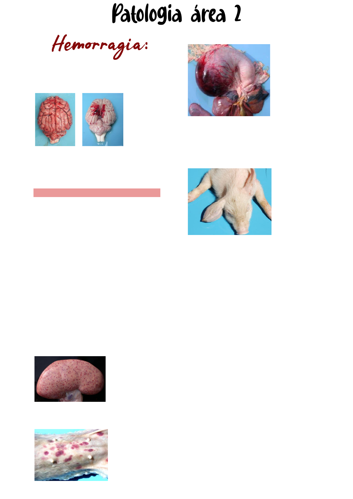 Conceito → extravasamento sanguíneo para fora do sistema cardiovascular Hiperemia X Hemorragia: Hiperemia → coloração avermelhada por toda extensão do órgão Hemorragia→ extravasamento de sangue pontual CLASSIFICAÇÃO E NOMENCLATURA DAS HEMORRAGIAS: MECANISMO DE FORMAÇÃO DAS HEMORRAGIAS: “Per rhexis” (ruptura)→ danos na parede vascular, inflamação, traumas, necrose, invasão e rupturas de tumores. “Per diapedese” (migração)→ sem lesão evidente do leito vascular, geralmente em nível capilar. Falta fatores de coagulação ou plaquetas (diátese hemorrágica). Hemorragia espontânea, relacionada aos fatores de coagulação, por isso pode ocorrer em vários locais diferentes ao mesmo tempo. MORFOLOGIA DAS HEMORRAGIAS: Não alteram o relevo: Petéquias → lesões puntiformes, processo hemorrágico plano e puntiforme Equimose → até 3cm, as vezes algumas petéquias se unem e formam as equismoses Sufusões→ extensas áreas Alteram o relevo: Hematomas→ alteração do relevo do tecido Ex: otohematoma em suínos, nas baias de terminação os animais brigam e se mordem, ocasionando trauma nos tecidos Púrpuras → termo clínico (petéquias e equimoses extensas em superfícies) LOCALIZAÇÃO: Hemopericárdio → sangue contido dentro do saco pericárdio Pode ocasionar tamponamento cardíaco → pressão exercida no coração pelo sangue ou líquido que se acumula no pericárdio Ex: hemangiosarcoma (comum nos átrios, pele e baço) → tumor vascular → quando rompe tampona o coração Pericardite → entrada de bactérias, comum em trauma por perfuração por objetos cortantes em ruminantes→ retículo pericardite traumático Hemotórax→ presença de sangue dentro do espaço da caixa torácica Ex: mordeduras causadas em brigas Hemoperitônio → presença de sangue dentro da cavidade abdominal Ex: rompimento de um hemangiossarcoma Epistaxe→ sangramento nasal geralmente originado na mucosa do nariz. Rinorragia, lesão do trato respiratório superior Ex: rinite fúngica → cianose na língua, epistaxe e boca constantemente aberta Hemoptise → eliminação de sangue do trato respiratório pela tosse Hematemese→ sangue visível no sangue Melena→ sangue digerido nas fezes, odor sulfúrico, fezes escuras Hematoquesia → presença de sangue fresco e vermelho nas fezes do animal, indica lesões distais no trato digestório Hematúria → presença de sangue na urina, proveniente de lesão no trato urinário Ex: intoxicação por samambaia em bovinos→ causa câncer no trato urinário (ação radiomimética, altera a conformação do DNA da célula). Pode causar → diátese hemorrágica (por comer grande volume e rápido) o que causa aplasia medular, hematúria, causada pelo tumor no trato urinário, tumor no trato digestório. Hifema → é um sangramento na câmara anterior (a cavidade cheia de líquido entre a córnea transparente e a íris colorida) do olho. Hemartrose→ sangramento que acontece dentro de uma articulação. CLASSIFICAÇÃO DAS HEMORRAGIAS QUANTO À RELAÇÃO COM O ORGANISMO: ● Externas ou superficiais ● Internas com fluxo externo→ gastrorragia com hematêmese ou melena, rinorragia com epistaxe ● Ocultas (internas) → viscerais ou cavitarias CLASSIFICAÇÃO SEGUNDO SUA ETIOLOGIA: ● Traumática → originada por algum trauma externo ● Origem hemática → problemas em fatores de coagulação → intoxicação por dicumarínicos, ácido acetilsalicílico, hipovitaminose K, hepatopatias, trombocitopenias, hemofilias. ● Origem vascular → problema está na parede do vaso → hipertensão arterial, toxinas e agentes infecciosos endoteliotrópicos, hipersensibilidade do tipo 3 HEPATOPATIAS: Fibrinogênio Fatores de coagulação → II, V, VII a XIII, antitrombina 3, plasminogênio, inibidor do ativador de plasminogênio, α2-antitripsina, α2-macroglobulina e α1-antitripsina Rangeliose → doença infecciosa causada pela Rangelia vitalii, um hemoprotozoário, e causa sangramento da orelha Hemorragia de origem vascular: ⤷hemorragia vascular, comum em hipersensibilidade do tipo III Acidente botrópico: ⤷ataque por animal peçonhento, o veneno botrópico tem atividade inflamatória aguda local, coagulante e hemorrágica. As complicações locais mais frequentes são: infecção secundária, necrose, síndrome compartimental, déficit funcional e amputação. CONSEQUÊNCIAS DAS HEMORRAGIAS: Fatores que determinam a “gravidade” das consequências: ● Volume (choque hipovolêmico) ● Taxa de perda (agudo ou crônico) ● Estado clínico anterior a hemorragia ● Local que sofre a hemorragia RESOLUÇÃO DAS HEMORRAGIAS: Hemorragias menores → absorção das células sanguíneas Hemorragias maiores→ organização e fibrose Conceito → aumento na quantidade de líquido no espaço intersticial e/ou cavidades pré-existentes. Transudato → líquido não inflamatória, densidade abaixo de 1.012, pobre em proteínas e geralmente translúcido Exsudato → líquido inflamatório, densidade acima 1.020, rico em proteínas, coagula e tem aspecto turvo Sinal de cacifo ou sinal de Godet: Pressão digital sobre a pele por pelo menos 5 segundos→ positivo de a depressão formada não se desfizer imediatamente após a compressão NOMENCLATURA: Hidropericárdio→ acúmulo de transudato dentro do pericárdio Hidrotórax → acúmulo de transudato no interior da cavidade torácica Hidroperitônio → acúmulo de transudato na cavidade abdominal Quemose→ edema ocular Anasarca → edema distribuído por todo o corpo devido ao acúmulo de fluido no espaço extracelular EDEMA DISTRIBUÍDO MICROSCOPICAMENTE: Estrutura amorfa corada fracamente pela eosina Presença de proteína EQUILÍBRIO DE STARLING: “A quantidade de fluido filtrado para fora dos capilares arteriais é aproximadamente igual a quantidade de fluido que retorna aos capilares venosos.” A equação de Starling ilustra a interação das forças hidrostáticas e oncót