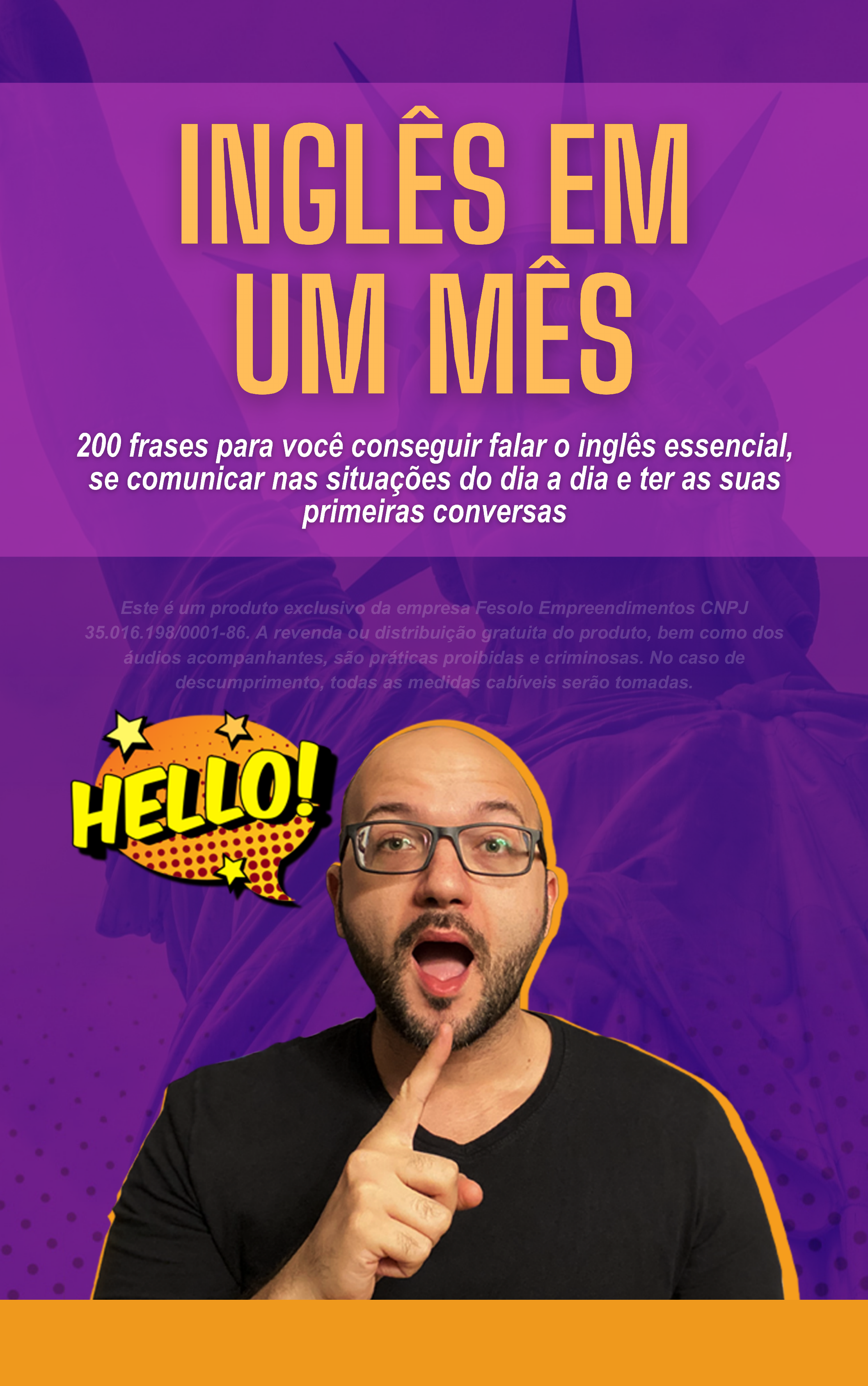 BY PHILIP Este é um produto exclusivo da empresa Fesolo Empreendimentos CNPJ 35.016.198/0001-86. A revenda ou distribuição gratuita do produto, bem como dos áudios acompanhantes, são práticas proibidas e criminosas. No caso de descumprimento, todas as medidas cabíveis serão tomadas. Licenciado para - C arlos R odolfo bartz - 00350704040 - P rotegido por E duzz.com Este é um produto exclusivo da empresa Fesolo Empreendimentos CNPJ 35.016.198/0001-86. A revenda ou distribuição gratuita do produto, bem como dos áudios acompanhantes, são práticas proibidas e criminosas. No caso de descumprimento, todas as medidas cabíveis serão tomadas. SOBRE O PROFESSOR Hello dear student, my name is Felipe, mas você pode me chamar de Philip. Eu recebi esse apelido em uma das escolas onde dei aula. Foram duas: Wizard e Brasas. Minha relação com o inglês vem lá de quando eu era pequenininho nos anos 90 (já são mais de 30 anos). Eu amava as aulas de inglês na escola, então minha mãe me matriculou na Cultura Inglês. Junto ao curso, eu assistia a filmes, escutava músicas, vasculhava a internet e eu compunha músicas em inglês e já até tive algumas gravadas. Uma delas até alcançou uma ótima posição na parada americana (Billboard) de músicas do estilo dance. Licenciado para - C arlos R odolfo bartz - 00350704040 - P rotegido por E duzz.com Este é um produto exclusivo da empresa Fesolo Empreendimentos CNPJ 35.016.198/0001-86. A revenda ou distribuição gratuita do produto, bem como dos áudios acompanhantes, são práticas proibidas e criminosas. No caso de descumprimento, todas as medidas cabíveis serão tomadas. Eu também compus músicas em português. Procure por "O segredo" da Wanessa Camargo. Em 2011 eu fiz um intercâmbio de 3 meses nos Estados Unidos para ter a experiência de morar e trabalhar fora. Foi uma experiência incrível! Pude praticar muito o inglês que havia estudado a vida inteira. Ao voltar do intercâmbio, comecei a dar aulas de inglês na Wizard e foi ali que descobri que a minha missão: o inglês foi gostoso de aprender para mim e eu queria que fosse gostoso, prazeroso e fácil para outras pessoas também. Licenciado para - C arlos R odolfo bartz - 00350704040 - P rotegido por E duzz.com Este é um produto exclusivo da empresa Fesolo Empreendimentos CNPJ 35.016.198/0001-86. A revenda ou distribuição gratuita do produto, bem como dos áudios acompanhantes, são práticas proibidas e criminosas. No caso de descumprimento, todas as medidas cabíveis serão tomadas. Em 2018 eu comecei a produzir conteúdo para a internet e o meu curso de inglês, o Mini Hábito do Inglês. E já estamos aí no mercado desde então. Por que Mini Hábito? Porque não adianta querer fazer uma mudança brusca de estudar 1 hora por dia. O mais provável é que você desista em um ou dois meses. A melhor estratégia é começar aos poucos. Por isso eu defendo que você deve, primeiro, se comprometer em estudar 15 minutos por dia com o meu método. E deixar que naturalmente e com o tempo a mágica vá acontecendo. Você vai se acostumando, se familiarizando, gostando e é aí que mora o segredo. Todo dia e constantemente. Alguns dias você vai estudar pouco, em outros vai estudar mais, e está tudo ok. O importante é não parar. E tem dado muito certo! Licenciado para - C arlos R odolfo bartz - 00350704040 - P rotegido por E duzz.com INTRODUÇÃO! Que bom que você adquiriu o livro "INGLÊS EM UM MÊS". Só com essas frases você já vai aprender muito vocabulário e estruturas para falar e se comunicar em diversas situações do dia a dia. Não esqueça que, como bônus, você recebeu um acesso de 1 ano à plataforma com 20 aulas com a pronúncia de cada frase. É muito importante que você as faça e reveja durante todo esse mês para obter o melhor resultado. Eu recomendo que você faça 2 aulas por dia. Repita cada aula 3 ou mais vezes. Elas são bem curtas. Lembre-se que o inglês tem que ser hábito, ele tem que fazer parte da sua vida como o português, como as redes sociais, como a TV. Só assim a gente vai dominar a língua. Ao final do livro eu coloquei mais um bônus extra: 5 diálogos do dia a dia para você treinar. Eles também têm treinamento de pronúncia na plataforma. Aproveite o livro, o treinamento, faça acontecer e rumo à Fluência! - Philip 1 Licenciado para - C arlos R odolfo bartz - 00350704040 - P rotegido por E duzz.com Are you free this Saturday? Você está livre neste sábado? Are you from around here? Você é daqui? Are you going to come over tonight? Você vai vir hoje à noite? Are you on Instagram? Você tem Instagram? Are you ready? Você está pronto? Are you sure about that? Você tem certeza disso? Beautiful day, isn’t it? Dia lindo, não é? Can I get you something to drink? Posso pegar algo para você beber? Can I have two tickets for Spiderman, please? Me vê dois ingressos para o Homem-Aranha, por favor? Can I use your phone for a minute? Posso usar seu telefone um minutinho? 2 Licenciado para - C arlos R odolfo bartz - 00350704040 - P rotegido por E duzz.com Can you bring the menu, please? Você pode trazer o menu, por favor? Can you give me a hand? Você pode me dar uma mãozinha? Can you put me on a window seat? Você pode me colocar em um assento na janela? Congratulations, you did a great job! Parabéns, você fez um ótimo trabalho! Could you repeat that? I didn’t understand. Você poderia repetir isso? Eu não entendi. Did you watch Titanic? Você assistiu Titanic? Did you have a good weekend? Você teve um bom final de semana? Did you have a good time? Você se divertiu? Did you hear about John? Você ouviu falar do João? Did you see the game last night? Você viu o jogo ontem à noite? 3 Licenciado para - C arlos R odolfo bartz - 00350704040 - P rotegido por E duzz.com Did you sleep well? Você dormiu bem? Do you work on weekends? Você trabalha nos finais de semana? Do you come here very often? Você vem aqui com 