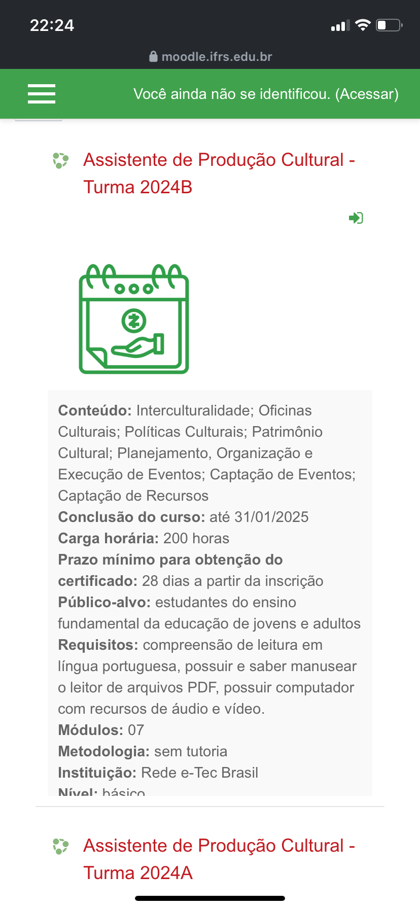 22:24 moodle.ifrs.edu.br Você ainda não se identificou. (Acessar) Assistente de Produção Cultural - Turma 2024B Conteúdo: Interculturalidade; Oficinas Culturais; Políticas Culturais; Patrimônio Cultural; Planejamento, Organização e Execução de Eventos; Captação de Eventos; Captação de Recursos Conclusão do curso: até 31/01/2025 Carga horária: 200 horas Prazo mínimo para obtenção do certificado: 28 dias a partir da inscrição Público-alvo: estudantes do ensino fundamental da educação de jovens e adultos Requisitos: compreensão de leitura em língua portuguesa, possuir e saber manusear o leitor de arquivos PDF, possuir computador com recursos de áudio e vídeo. Módulos: 07 Metodologia: sem tutoria Instituição: Rede e-Tec Brasil básico Assistente de Produção Cultural - Turma 2024A
