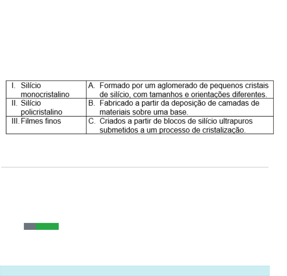 Geração de energia elétrica de fontes alternativas 1) As células solares podem ser fabricadas utilizando diversos tipos de processo e tecnologias de fabricação. Sobre o tema, associe as colunas a seguir: Assinale a alternativa que traz a associação correta entre as duas colunas. Alternativas: I-A; II-B; III-C. I-B; II-C; III-A. I-C; II-A; III-B. checkCORRETO I-B; II-A; III-C. I-C; II-B; III-A. Resolução comentada: O painel de silício monocristalino é produzido a partir de blocos de silício ultrapuros submetidos a um processo de cristalização. O silício policristalino é formado por um aglomerado de pequenos cristais de silício, com tamanhos e orientações diferentes. Os filmes finos são fabricados a partir da deposição de camadas de materiais sobre uma base Código da questão: 53542 2) Sobre as partes que constituem um aerogerador, associe as duas colunas a seguir: Assinale a alternativa que traz a associação correta entre as duas colunas. Alternativas: I – D; II – B; III – A; IV – C. I – D; II – C; III – A; IV – B. checkCORRETO I – A; II – C; III – D; IV – B. I – C; II – D; III – B; IV – A. I – B; II – A; III – C; IV – D. Resolução comentada: A nacela é a estrutura que abriga o gerador elétrico, a caixa de engrenagens da turbina e o gerador. O anemômetro é o dispositivo responsável por medir a velocidade do vento. A turbina eólica é composta pelas pás, pelo cubo rotor e pelo mecanismo de controle de inclinação das pás. A caixa de engrenagens tem a função de transmitir a energia mecânica do eixo da turbina para o eixo do gerador. Código da questão: 53533 3) Além de apresentar definições e características da geração distribuída, a Resolução 482, de 17 de abril de 2012, da Agência Nacional de Energia Elétrica (Aneel), estabelece diversas regras operacionais para a microgeração e minigeração. Essa resolução e suas modificações estabelece que: I – Deverá ser realizada a cobrança do custo de disponibilidade da rede para o consumidor do grupo B e ele não pode ser compensado. II – Os créditos gerados expiram em 24 meses. III – O consumo faturado será a energia elétrica consumida, descontada a energia injetada e o eventual crédito acumulado em ciclos de faturamento anteriores. IV – No caso de autoconsumo remoto, o titular terá o consumo total de suas unidades consumidoras compensadas, independentemente do volume de energia gerado. Assinale a alternativa que indica quais afirmações são verdadeiras. Alternativas: II - IV. I - II - III - IV. I - II - III. I - III. checkCORRETO IV. Resolução comentada: Conforme a resolução citada no enunciado, deverá ser realizada a cobrança de, no mínimo, o valor referente ao custo de disponibilidade para o consumidor do grupo B, que não pode ser compensado. Isso torna a afirmação I verdadeira. Os créditos de energia gerados pelo sistema de compensação de energia elétrica expiram em 60 meses após o seu faturamento, o que torna a afirmativa II incorreta. O consumo faturado será a energia elétrica consumida, descontada a energia injetada e o eventual crédito acumulado em ciclos de faturamento anteriores, validando a afirmativa III. A energia excedente que não tenha sido compensada na própria unidade consumidora poderá ser utilizada na compensação do consumo de outras unidades, e o titular da unidade consumidora onde o sistema de geração distribuída está instalado deve definir o percentual de energia excedente que será destinado a cada unidade consumidora participante do sistema de compensação. Isso torna falsa a afirmativa IV. Código da questão: 53561 4) A geração distribuída possui diversas características e regulamentações que indicam aquilo que é permitido ou não. Sobre a geração compartilhada, assinale a alternativa correta. Alternativas: Indica que os créditos gerados na geração distribuída expiram em 36 meses. É caracterizada por um agrupamento de consumidores que utiliza a compensação em um local diferente da geração. checkCORRETO Permite a criação de um consórcio para a distribuição de energia em áreas isoladas, operando como uma concessionária. É um sistema de geração distribuída com geradores de potência de até 75 kW, ligados diretamente na rede por unidades de distribuição. Tem como característica a existência de unidades consumidoras com geração distribuída em locais diferentes daqueles que o consumo será compensado, onde todas as unidades são de mesma titularidade. Resolução comentada: A geração compartilhada é o agrupamento de diversos consumidores, dentro de uma área de concessão ou permissão, por meio de consórcio ou cooperativa, que possua sistemas de microgeração ou minigeração distribuída em um local diferente daquele que será utilizado na compensação da energia excedente. Código da questão: 53553 5) Quando tratamos de um sistema fotovoltaico autônomo, ele tem por objetivo substituir ou compensar a falta da rede elétrica em um local. Nesse sistema, a energia é gerada pelos _______ e armazenada nas _______, que têm seu processo de carregamento regulado pelo_______. Para ser utilizada na alimentação dos equipamentos que encontramos em nossas residências, a energia passa pelo_______. Assinale a alternativa que completa corretamente as lacunas presentes no texto, respectivamente. Alternativas: Inversor; Painéis; Bateria; Controlador de carga. Painéis; Baterias; Controlador de carga; Inversor. checkCORRETO Baterias; Painéis; Controlador de carga; Inversor. Controlador de carga; Baterias; Inversor; Painéis. Painéis; Baterias; Inversor; Controlador de carga. Resolução comentada: Completando as lacunas, o trecho fica: quando tratamos de um sistema fotovoltaico autônomo, ele tem por objetivo substituir ou compensar a falta da rede elétrica em um local. Nesse sistema, a energia é gerada pelos painéis e armazenada nas baterias, que t