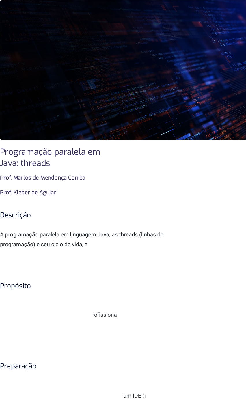 Programação paralela em Java: threads Prof. Marlos de Mendonça Corrêa Prof. Kleber de Aguiar Descrição A programação paralela em linguagem Java, as threads (linhas de programação) e seu ciclo de vida, assim como conceitos e técnicas importantes para a sincronização entre threads e um exemplo de implementação com múltiplas linhas de execução. Propósito O emprego de threads em Java na programação paralela em CPU de núcleo múltiplo é fundamental para profissionais da área, uma vez que a técnica se tornou essencial para a construção de softwares que aproveitem ao máximo os recursos de hardware e resolvam os problemas de forma eficiente. Preparação Para melhor absorção do conhecimento, recomendamos o uso de um computador com o JDK (Java development Kit) e um IDE (integrated development environment) instalados. 06/06/2024, 18:12 Programação paralela em Java: threads https://stecine.azureedge.net/repositorio/00212ti/01895/index.html?brand=estacio# 1/54 Objetivos Módulo 1 Threads e processamento paralelo Reconhecer o conceito de threads e sua importância para o processamento paralelo. Módulo 2 Sincronização entre threads Identificar a sincronização entre threads em Java. Módulo 3 Implementação de threads Aplicar a implementação de threads em Java. Introdução Inicialmente, a execução de códigos em computadores era feita em lotes e limitada a uma única unidade de processamento. Sendo assim, quando uma tarefa era iniciada, ela ocupava a CPU até o seu término. Apenas nesse momento é que outro código 06/06/2024, 18:12 Programação paralela em Java: threads https://stecine.azureedge.net/repositorio/00212ti/01895/index.html?brand=estacio# 2/54 podia ser carregado e executado. O primeiro avanço veio, então, com o surgimento dos sistemas multitarefa preemptivos. Isso permitiu que uma tarefa, ainda inacabada, fosse suspensa temporariamente, dando lugar a outra. Dessa forma, várias tarefas compartilhavam a execução na CPU, simulando uma execução paralela. A execução não era em paralelo no sentido estrito da palavra: a CPU somente conseguia executar uma tarefa por vez, contudo, como as tarefas eram preemptadas, isto é, tiradas do contexto da execução antes de terminarem, várias tarefas pareciam estar sendo executadas ao mesmo tempo. O avanço seguinte veio com a implementação pela Intel do hyperthreading em seus processadores. Essa tecnologia envolve a replicação da pipeline de execução da CPU, mantendo os registradores compartilhados entre as pipelines. Com isso, tarefas passaram a ser realmente executadas em paralelo. Entretanto, o compartilhamento dos registradores faz com que a execução de um código possa interferir no outro pipeline. Finalmente, com o barateamento da tecnologia de fabricação de chips, surgiram as CPU com múltiplos núcleos. Cada núcleo possui a capacidade de execução completa de código, incluindo a replicação de pipelines, no caso das CPU Intel. Com essa tecnologia, a execução paralela de várias tarefas se popularizou, impulsionando o uso de threads. Neste conteúdo, vamos abordar apenas a visão Java de thread, incluindo nomenclaturas, características, funcionamento e tudo que se relacionar ao assunto. 06/06/2024, 18:12 Programação paralela em Java: threads https://stecine.azureedge.net/repositorio/00212ti/01895/index.html?brand=estacio# 3/54 1 - Threads e processamento paralelo Ao �nal deste módulo, você será capaz de reconhecer o conceito de threads e sua importância para o processamento paralelo. Visão geral Processamento paralelo com threads em Java Neste vídeo, você verá o conceito de threads e seu suporte pela linguagem Java, além de conferir uma descrição dos estados que uma thread pode ter em Java e da forma como criá-la. Conceitos 06/06/2024, 18:12 Programação paralela em Java: threads https://stecine.azureedge.net/repositorio/00212ti/01895/index.html?brand=estacio# 4/54 Estamos tão acostumados com as facilidades da tecnologia que muitas vezes os mecanismos que atuam ocultos são ignorados. Isso vale também para os desenvolvedores. No início da computação, contudo, não era assim. Naquela época, bits de memória, ciclos de CPU e watts de energia gastos eram importantes. Aliás, não se podia desenvolver um programa sem perfeito conhecimento do hardware. A linguagem de máquina e a assembly (linguagem de montagem) eram os únicos recursos para programação, e operações de E/S (entrada/saída) podiam demorar minutos, devendo ser evitadas a todo custo. Comentário Com o passar do tempo e o avanço tecnológico (surgimento de novas linguagens de programação, barramentos mais velozes e CPUs mais rápidas), houve um aumento da complexidade e, com isso, os compiladores passaram a agilizar muito o trabalho de otimização de código, gerando códigos de máquina mais eficientes. Na era da computação da moderna, podemos executar múltiplas tarefas concomitantemente graças aos já mencionados hyperthreading, CPU de núcleo múltiplo e sistemas operacionais multitarefa preemptiva. O termo thread ou processo leve consiste em uma sequência de instruções, uma linha de execução dentro de um processo. Para facilitar a compreensão do conceito de thread, vamos construir computadores teóricos com duas configurações: CPU genérica de núcleo único CPU multinúcleo Ambas as configurações têm um sistema operacional (SO) multitarefa preemptivo. Vamos examinar como softwares com uma única linha de execução são processados nessas plataformas em suas duas configurações, o que nos dará base para um melhor entendimento do conceito de threads. 06/06/2024, 18:12 Programação paralela em Java: threads https://stecine.azureedge.net/repositorio/00212ti/01895/index.html?brand=estacio# 5/54 Execução de software por um computador teórico Configuração: CPU genérica de núcleo único Nossa primeira configuração era muito comum há pouco mais de uma década. Ima