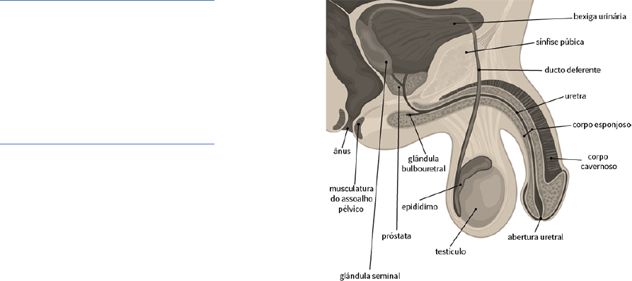 Estrutura e função humana – UNID 4 - @putz.luiza Sistema Genital: Masculino Os órgãos que compõem o sistema genital masculino são: testículo, uma rede de ductos condutores (epidídimo, ducto deferente, ducto ejaculatório e uretra) e glândulas sexuais acessórias (glândula seminal, próstata e glândula bulbouretrais, além do escroto e do pênis. Sistema Genital Masculino TESTÍCULOS - par de glândulas ovais responsáveis pela síntese do espermatozoide e da testosterona. São as gônadas masculinas já que produzem o gameta masculino chamado espermatozoide. Importante glândula que está envolvida na produção de testosterona. EPIDÍDIMO - armazena os espermatozoides depois que eles são produzidos, no epidídimo. O espermatozoide passa por um processo de maturação e adquire elementos que os capacitaram a fertilizar o ovócito, o espermatozoide fica no epidídimo até amadurecerem e serem ejaculados, quando ocorre a ejaculação os espermatozoides saem do epidídimo através do ducto deferente. DUCTO DEFERENTE - conduz os espermatozoides até o ducto ejaculatório ele faz toda uma volta dentro da cavidade pélvica. .TESTOSTERONA - estimula o desenvolvimento da função sexual por estimular a espermatogênese Estimular o desenvolvimento das características sexuais masculinas, como crescimento muscular e esquelético. O excesso de testosterona pode causar uma série de efeitos colaterais em homens e mulheres Em homens pode ocorrer a redução de formação de espermatozoides, atrofia dos testículos, impotência, dificuldade ou dor ao urinar... Já em mulheres a virilizarão, manifestando-se como a diminuição da gordura corporal e tamanho dos seios, voz mais grossa, irregularidades menstruais, aumento do clitóris, alterações da libido... A formação e maturação dos espermatozoides ocorrem nos testículos que se localizam no interior do escroto. ESCROTO – é uma bolsa formada por músculos e pele que protege os testículos e faz a termorregulação. Os testículos precisam estar sempre a uma temperatura de cerca de 35 graus, por isso o escroto garante que a temperatura fique nesse nível. Os testículos são glândulas pares de aproximadamente cinco centímetros de comprimento. Internamente os testículos são formados por uma rede de túbulos e, conforme as células germinativas são conduzidas por esses ductos, são também maturadas. Nos seres humanos, a espermatogênese leva de 65 a 75 dias. Para o amadurecimento das células germinativas masculinas e femininas, é necessária a integração do sistema genital com outro sistema, o sistema endócrino. O sistema endócrino é composto por glândulas, ou seja, tecido epitelial especializado em secreção de substâncias na corrente sanguínea. Essa substância secretada pelas glândulas é chamada de hormônio. Da mesma forma que o sistema nervoso precisa de um feedback, o sistema endócrino também depende dele para poder exercer suas funções de maneira adequada e garantir a homeostase corporal. Correlacionando ao feedback que permitem a comunicação entre glândulas podemos chamar de eixos hormonais. O eixo hormonal sexual masculino é formado por três regiões: Hipotálamo, Hipófise e Testículos. O hipotálamo, se localiza no sistema nervoso central, especificamente no diencéfalo. Está é a região de principal comunicação entre o sistema nervoso e o sistema endócrino. O hipotálamo secreta um hormônio chamado GnRh que estimula a glândula hipófise a secretar dois hormônios, o FSH e o LH e esses hormônios só começam a ser produzidos durante a puberdade. FSH – Hormônio Folículo Estimulante. Sua função é regular a produção de espermatozoides e manter altas concentrações de testosterona. LH – Hormônio Luteinizante. Irá estimular a produção de testosterona.. image1.png image2.png