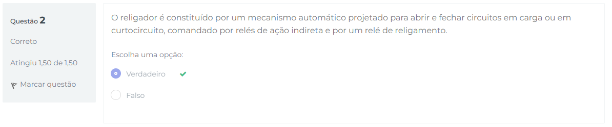 Questão 2 religador é constituído por um mecanismo automático projetado para abrir e fechar circuitos em carga ou em curtocircuito, comandado por relés de ação indireta e por um relé de religamento. Correto Escolha uma opção: Atingiu 1,50 de 1,50 Verdadeiro P Marcar questão Falso