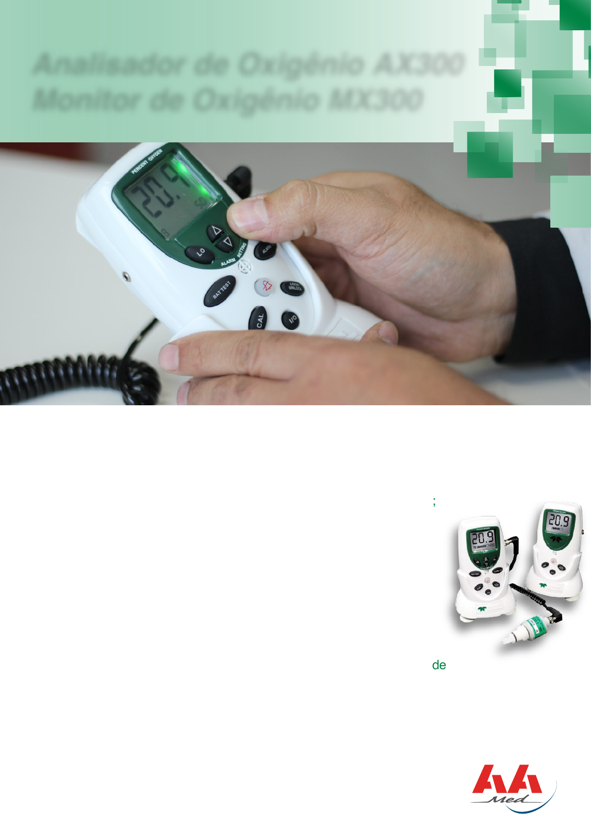 Os dois modelos possuem: • Display LCD iluminado para fácil visualização em más condições de luz; • Sinal de saída 0-1 VCC ou RS-232 para utilização com gravadores ou computador; • Alarmes sonoros e visuais para falha no sensor; • Auto diagnóstico com códigos de erro para simplificar a solução de problemas; • Rastreamento de temperatura superior em longo prazo, estabilidade e precisão, graças ao sensor de oxigênio R-17MED; • A calibração é feita com um toque de uma tecla e os ajustes estão garantidos quando o bloqueio do teclado for ativado. O baixo consumo de energia permite 2000 horas de funcionamento contínuo com 3 pilhas AA. Os analisadores de O2 da inovadora Teledyne oferecem excepcional flexibilidade e confiabilidade, pois incorporam conceitos e técnicas de fabricação de última geração. ® Analisador de Oxigênio AX300 Monitor de Oxigênio MX300 Construídos com material de alta resistência, o Analisador de Oxigênio AX300 e o Monitor de Oxigênio MX300 fornecem incomparável desempenho nas condições mais adversas. Ideal para uso em Terapia Respiratória, Neonatal e aplicações em Anestesia, os profissionais da saúde irão apreciar o desempenho e a confiabilidade desses instrumentos poderosos. Especificações Técnicas: Análise intervalo Escala completa precisão Tempo de resposta Temperatura de operação Temperatura de armazenamento Requisito de Alimentação Vida útil da bateria Sensor tipo Expectativa de vida Sensor temperatura de armazenamento Sensor cabo Peso Dimensões com suporte Sinal de saída RFI endurecido Garantia Cumprimento Aprovações Analisador AX300 • Microprocessador controlado para melhor desempenho • Display LCD de fácil leitura com retro iluminação • Auto calibração • Indicador do nível de bateria • Auto diagnósitco com culpa códigos • Tecla Liga/Desliga Alarme • Sensor R-17MED com desviadores de fluxo • Montagem stand • Adaptador V • Adaptador T 22 mm Opções • 3 dígitos LCD • Saída digital RS-232 • Fixa facilmente aos póllos prateleiras • Adaptador macho para parede para uso com plástico V • Montagem Universal (grampo) Monitor MX300 com Alarme • Microprocessador controlado para melhor desempenho • Display LCD de fácil leitura com retro iluminação • Auto calibração • Dois pontos totalmente ajustáveis alarme definido • Tecla Alarme teste / Alarme silêncio / Alarme Off • Teste de bateria • Auto diagnósitco com culpa códigos • Tecla Liga/Desliga Alarme • Sensor R-17MED com desviadores de fluxo • Montagem stand • Adaptador V • Adaptador T 22 mm 0 -100% de oxigênio ± 2% em temperatura e pressão constantes 90% do desvio < 8 segundos 10 a 40º C 10 a 30º C (contínuo), 5 a 50º C (intermitente) 3 pilhas alcalinas AA Média 2000 horas de não alarme, nenhum sinal de saída conectado Teledyne classe R-17MED 6 a 24 meses no ar (6 meses em 100% O2) 0 - 40º C (contínuo), 5 a 50º C (intermitente) Estende a 10 pés (3m) 420 gramas 5.5 “HX 3/5” WX 3 ”D (14 x 8.8 x 7.6 mm) 0-1 VCC ou RS-232 (2400 Baud rate) Sim Instrumento 12 meses e sensor 6 meses; cobre defeitos de fabricação ISO 7767 CE, CSA e ANVISA ® /aamedsp aamed www.aamed.com.br 11 5049-1444 • vendas@aamed.com.br Av. Vereador José Diniz, 3300, cj. 701/702 Campo Belo - São Paulo, SP