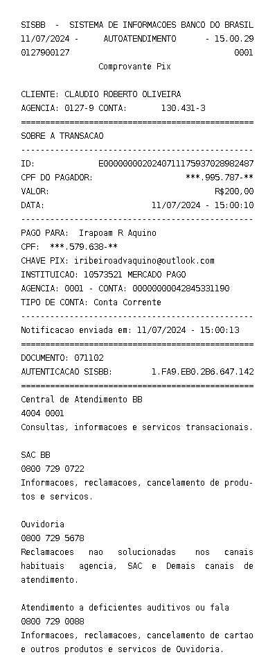 SISBB - SISTEMA DE BANCO DO BRASIL 11/07/2024 - 15.00.29 0127900127 0001 Comprovante Pix CLIENTE: CLAUDIO ROBERTO OLIVEIRA AGENCIA: 0127-9 CONTA: 130.431-3 SOBRE A TRANSACAO ID: CPF DO PAGADOR: *** VALOR: DATA: 11/07/2024 - 15:00:10 PAGO PARA: Irapoam R Aquino CPF: ***.579.638-** CHAVE PIX: iribeiroadvaquino@outlook.com INSTITUICAO: 10573521 MERCADO PAGO AGENCIA: 0001 - CONTA: TIPO DE CONTA: Conta Corrente Notificacao enviada em: 11/07/2024 - 15:00:13 DOCUMENTO: 071102 SISBB: Central de Atendimento BB 4004 0001 e SAC BB 0800 729 0722 reclamacoes, cancelamento de produ- tos e Ouvidoria 0800 729 5678 Reclamacoes nao solucionadas nos canais habituais agencia, SAC e Demais canais de atendimento. Atendimento a deficientes auditivos ou fala 0800 729 0088 cancelamento de cartao e outros produtos e de