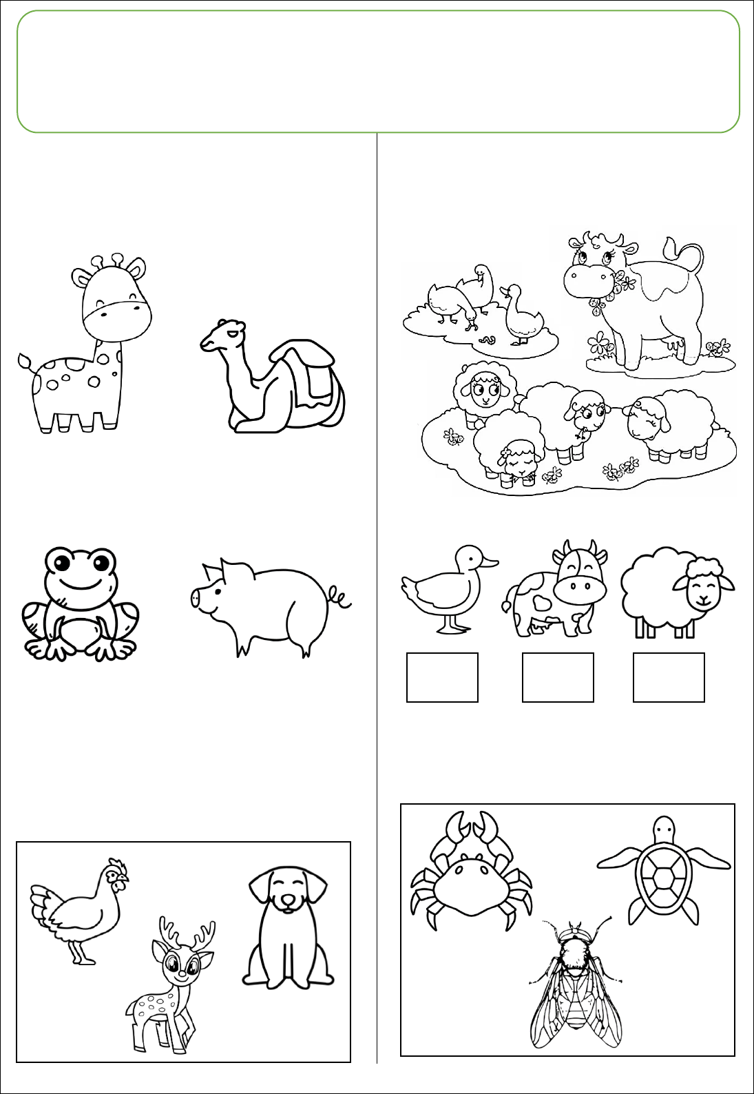 1. COMPLETE O NOME DOS ANIMAIS COM AS LETRAS FALTOSAS. G_____RAFA CAM_____LO S_____PO P_____RCO 2. CIRCULE APENAS OS ANIMAIS DOMÉSTICOS. 3. HÁ QUANTOS ANIMAIS? CONTE E REGISTRE. 4. PINTE APENAS OS ANIMAIS AQUÁTICOS. M I N H A A T I V I D A D E NOME: ______________________________________________________ DATA: ____/____/______ tudosaladeaula.com 0