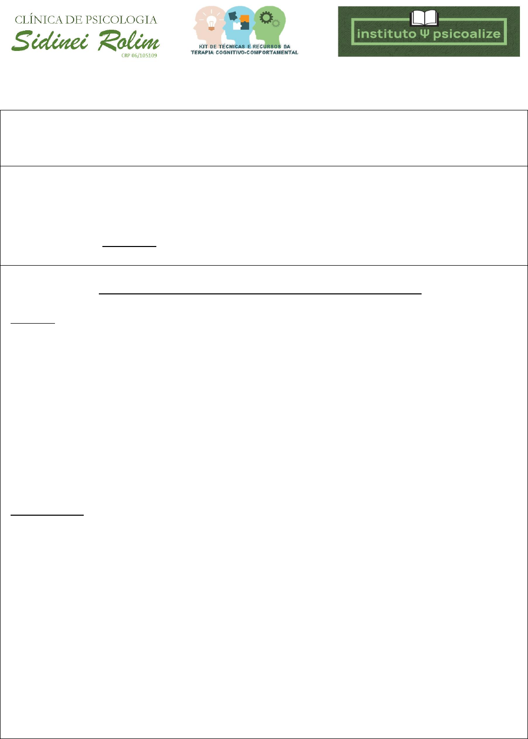 Fonte Bibliográfica: ROLIM, Sidinei. (2019). Atividade adaptada da atividade Roda da Vida disponível no Google e utilizada com grupo de supervisionandos. RODA DA VIDA A roda da vida é uma ferramenta de avaliação da Satisfação e foco do paciente/cliente. Através da escala de 1 a 10, vamos mensurar para que o paciente/cliente sinta/perceba a pessoa que é ou está sendo/ vivendo no momento. A nota até 3 é muito ruim, então você leva o paciente/cliente a refletir que ele pode ser melhor. QUESTÕES QUE AUXILIAM NA REFLEXÃO PARA A RODA DA VIDA PESSOAL Saúde e Disposição O que é para você? Como está? Como você se vê? Como seria se? Desenvolvimento intelectual (conhecimento) Como está a abertura para adquirir novos/mais conhecimentos? Filmes e livros que fazem sentido para você; Cursos. Equilíbrio Emocional Capacidade que você tem em manter equilíbrio num momento de “catástrofe”. PROFISSIONAL Realização e Propósito Legado, o que vai ficar para o mundo? Qual a sua essência? O quanto você tem isso definido? Recursos financeiros O quanto você se sente confortável com o dinheiro que recebe hoje? Com o que está comparando? O quanto se sente confortável em imaginar que daqui um ano poderá receber X valor? Contribuição Social O que você faz, de alguma forma, ajuda a sociedade? O quanto você acha que contribui com a sociedade? Fonte Bibliográfica: ROLIM, Sidinei. (2019). Atividade adaptada da atividade Roda da Vida disponível no Google e utilizada com grupo de supervisionandos. RELACIONAMENTO Família O que é Família para você? Fale-me sobre sua família. Que nota você dá para o momento atual? Amorosidade (Desenvolvimento Amoroso) O que é amor... Fraternal, Incondicional, Íntimo? O quanto isso desenvolvido na sua vida? O quanto se sente confortável? Vida Social O quanto você interage com as pessoas do seu meio social? O quanto .............? QUALIDADE DE VIDA Criatividade/ Hobbies & Diversão Como você se diverte? Viagens, atividades, esportes, etc... Plenitude e Felicidade O quanto você se sente pleno, centrado, feliz? O que é felicidade para você? Espiritualidade O que é espiritualidade para você? Como você vê e pratica a espiritualidade? *(Quando a pessoa responde que é ateu, você devolve a perguntando: “Você acredita em alguma coisa, mesmo que seja em você mesmo, mas acredita. Existe alguma força no universo, não existe?”) Fonte Bibliográfica: ROLIM, Sidinei. (2019). Atividade adaptada da atividade Roda da Vida disponível no Google e utilizada com grupo de supervisionandos. RODA DA VIDA
