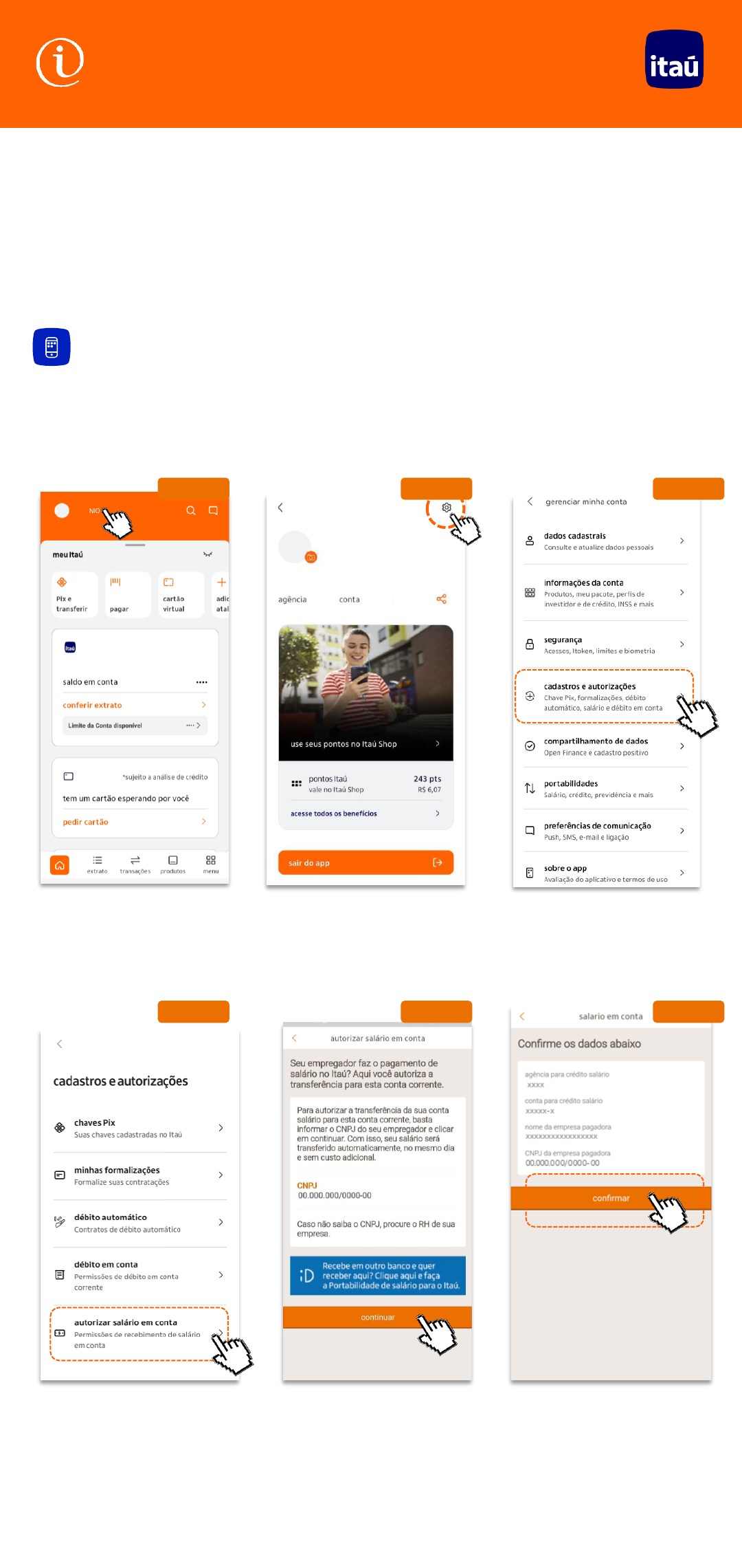 Servidores já correntistas Se você já é cliente Itaú e possui uma conta corrente ativa no banco, pode receber o salário nesta conta e ter acesso a todos os benefícios desta parceria. Basta realizar a vinculação do CNPJ do órgão em que você trabalha na sua conta corrente por uma das rotas abaixo: O Itaú é o novo parceiro da prefeitura! App Itaú no celular: Clicar em seu nome > Engrenagem > Cadastros e autorizações > Autorizar salário em conta > Informar o CNPJ > Continuar > Confirme os dados > Digite a senha do seu cartão. AC Antônio Coutinho 0000 00000-0 ANTÔNIOAC Passo 1 Passo 2 Passo 3 Passo 4 Passo 5 Passo 6 Caixa Eletrônico Itaú: Na tela inicial clique em “Produtos e Serviços – Mais opções” > Cadastro recebimento de salário > Clique em “Sim” > informar o CNPJ > Confirme o cadastro > Digite a senha do seu cartão. Itaú na Internet: Menu > Clique em “Conta Corrente” > na rota Salário > Habilitar recebimento de salário na conta corrente > Informar o CNPJ > Continuar > Confirme os dados > Digite a senha do seu cartão. Passo 1 Passo 2 Passo 3 Passo 4 Importante: Para ter acesso aos benefícios acordados em Folha é necessário que o seu pacote atual se enquadre nos elegíveis à isenção e que você não tenha plano de vantagens contratado. Pacotes Elegíveis: Itaú Agências: Padronizado II, Padronizado III, Itaú Pacote 3.0 e Padronizado IV; Itaú Uniclass: Conta Itaú Uniclass; Itaú Personnalité: Personnalité Multiconta Plus e Personnalité Multiconta Maxi. Caso o seu pacote atual seja diferente dos elegíveis a isenção, ou você tenha cadastrado o Plano de Vantagens, realize a alteração pelo app Itaú através do chat, acessando o menu > atendimento > chat > conta corrente e envie a mensagem ''alteração de pacote‘’ ou “cancelar plano de vantagens”. Se preferir, entre em contato na central 30Horas pelo telefone: 4004-4828 (capitais e regiões metropolitanas) ou 0800 970 4828 (outras localidades) e siga as instruções para falar com um atendente ou acione seu gerente para realizar os ajustes. mais opções Servidores já correntistas Slide 1 Slide 2