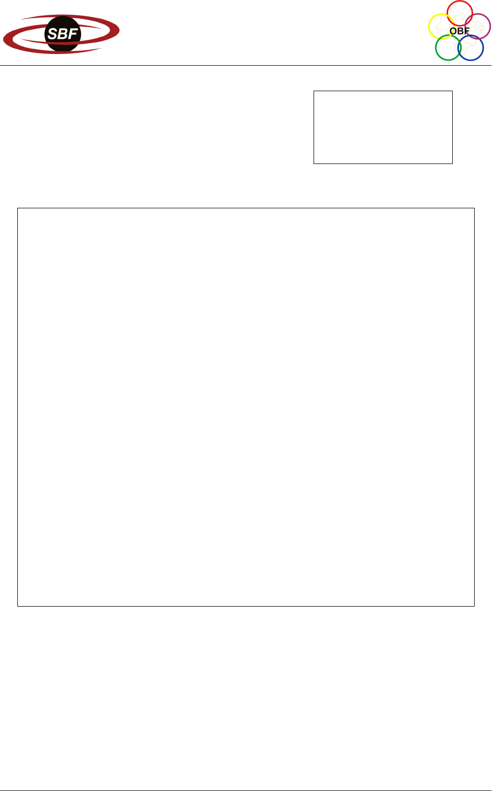 OLIMPÍADA BRASILEIRA DE FÍSICA 2023 Prova da 2ª Fase 12 DE AGOSTO DE 2023 NÍVEL III Ensino Médio 3ª e 4ª Séries LEIA ATENTAMENTE AS INSTRUÇÕES: 1. Esta prova destina-se exclusivamente aos alunos da 3ª e 4ª séries do nível médio. Ela contém 8 questões. 2. Você deve seguir as instruções de prova dadas em https://app.graxaim.org/ obf/2023/open_page/instrucoes_2_fase. Entre as instruções dadas nesse documento, destacamos que: • O intervalo de submissão entre duas questões consecutivas (ou entre a primeira e o início da prova) não pode ultrapassar 45 minutos. Atra- sos podem fazer com que questões enviadas não sejam avaliadas. • Preencha as caixas/campos de respostas apenas com números na repre- sentação inteira ou decimal e sem as unidades de medidas. • Escreva a resolução de cada questão em uma área de papel equivalente ao tamanho A5 (metade de uma folha A4). Certifique-se que a imagem enviada seja nítida e legível. • O envio das imagens com a resolução completa da questão é obrigatório. 3. Não serão aceitas respostas enviadas fora da plataforma (por email, ou qualquer outro meio). 4. Durante a prova, é permitido o uso de celular ou computador apenas para aces- sar o site https://app.graxaim.org/obf/2023, ou para trocas de mensagens com os coordenadores estaduais da OBF ou com equipeobf@graxaim.org. To- dos os demais usos (calculadoras, aplicativos gráficos e numéricos, consultas, busca na internet, etc) são proibidos. 1 https://app.graxaim.org/obf/2023/open_page/instrucoes_2_fase https://app.graxaim.org/obf/2023/open_page/instrucoes_2_fase https://app.graxaim.org/obf/2023 INSTRUÇÕES (CONTINUAÇÃO) 6. As respostas devem ser enviadas das 13h30 às 17h30, horário de Brasília. 7. Caso haja congestionamentos ou problemas na rede que afetem partes conside- ráveis do país, o site pode ser ajustado para aceitar submissões após as 17h30, horário de Brasília. No entanto, a validade das respostas enviadas após as 17h30 dependerá de análise caso a caso de uma comissão da OBF especialmente designada para este fim. 8. São vedados comentários e discusões sobre os enunciados das questões, suas respostas e possíveis resoluções em redes sociais, blogs, fóruns e demais meios de comunicação até às 23h59, horário de Brasília, de 12/08/2023. 9. Se necessário e salvo indicação em contrário, use: √ 2 = 1,4; √ 3 = 1,7; √ 5 = 2,2; sen(30◦) = 0,50; cos(30◦) = 0,85; sen(45◦) = 0,70; π = 3; densidade da água = 1,0 g/cm3; calor específico da água = 4,2 J/g ◦C; 1 cal = 4,2 J; constante Coulomb = 9× 109 N ·m2 · C−2; permeabilidade magnética = 1,2× 10−6 H/m e aceleração da gravidade = 10,0 m/s2. 2 Questão 1. A figura abaixo à esquerda mostra um amassador de latas de refrigerante. O dispositivo pode ser fixado, por exemplo, na parede. Desta forma é possível amassar a lata sem muito esforço simplesmente puxando a alavanca para baixo. A figura abaixo à direita é uma representação esquemática do amassador visto de lado. Nessa figura, os pontos B, C e D são pinos pelos quais as peças se articulam, a distância de A a B é 55,0 cm, de B a C é 15,0 cm e o ângulo θ = 60◦. O dispositivo, de massa desprezível, é projetado de forma que a haste CD é submetida apenas a esforços ao longo de seu comprimento. Estime a maior força exercida no pino D, em N, quando uma pessoa aplica uma força de 100 N no ponto A da barra AB. Questão 2. Em uma oficina utiliza-se um dispositivo hidráulico para elevar algumas peças. O dis- positivo é formado por dois pistões que estão acoplados a cilindros que se comunicam e es- tão preenchidos com óleo, conforme ilustrado na figura, fora de escala, ao lado. Os cilindros acoplados aos pistões A e B têm, respectiva- mente, raios rA = 10,0 cm e rB = 60,0 cm. Sem a presença do bloco de massa M na plataforma B o sistema está em equilíbrio. É necessário aplicar uma força vertical F = 200 no pistão A para elevar o bloco apoiado na plataforma B com velocidade constante. Determine: (a) A massa M , em kg, do bloco. (b) A variação da energia potencial do bloco, em J, quando o pistão A desce 0,50 cm. 3 Questão 3. Durante um jogo de Futebol Americano um jogador cuja massa é 90,0 kg salta em direção a um jogador adversário, inicialmente em repouso, atingindo-o com uma velocidade de 7,20 m/s. Eles se seguram e passam a se mover com uma velocidade de 3,00 m/s. As velocidades antes e depois da colisão possuem mesma direção e sentido. Despreza as perdas com as interações com o gramado. (a) Qual a massa, em kg, do jogador adversário? (b) Qual a perda mecânica mecânica na colisão, em J? Questão 4. Utilizando-se três lâmpadas incandescentes iguais, de filamentos ôhmicos com resistência igual a 22,0 Ω, e uma fonte de 12,0 V e resistência interna r montou-se o circuito mostrado nas figuras abaixo. Quando todas as lâmpadas estão acesas, sabe-se que cada uma dissipa uma potência de 5,50 W. Determine: (a) A resistência interna r da fonte, em Ω. (b) A potência total dissipada pelas lâmpadas remanescentes, em W, quando uma delas estiver queimada. 4 Questão 5. O movimento de três partículas A, B e C em movimento retilíneo é monitorado em um laboratório didático. Os gráficos de suas velocidades em função do tempo são mostrado na figura abaixo. Considerando o intervalo de tempo entre 0 e 4 s, determine: (a) A distância percorrida, em m, da partícula que realizou o maior deslocamento. (b) O menor valor da aceleração instantânea, em m/s2, experimentado por qualquer uma das partículas. Questão 6. Um esfera de 500 g de massa está presa a um fio inex- tensível de 30,0 cm de comprimento. Ela é posta para girar com velocidade angular constante de 15,0 rad/s em uma trajetória circular horizontal de raio 10,0 cm, con- forme ilustrada na figura ao lado. Nessas condições, qual o valor da tensão do fio, em N? 5 Questão 7. Um ajudante de ped